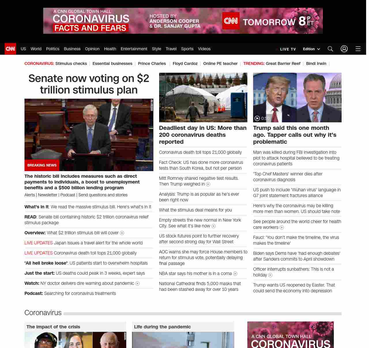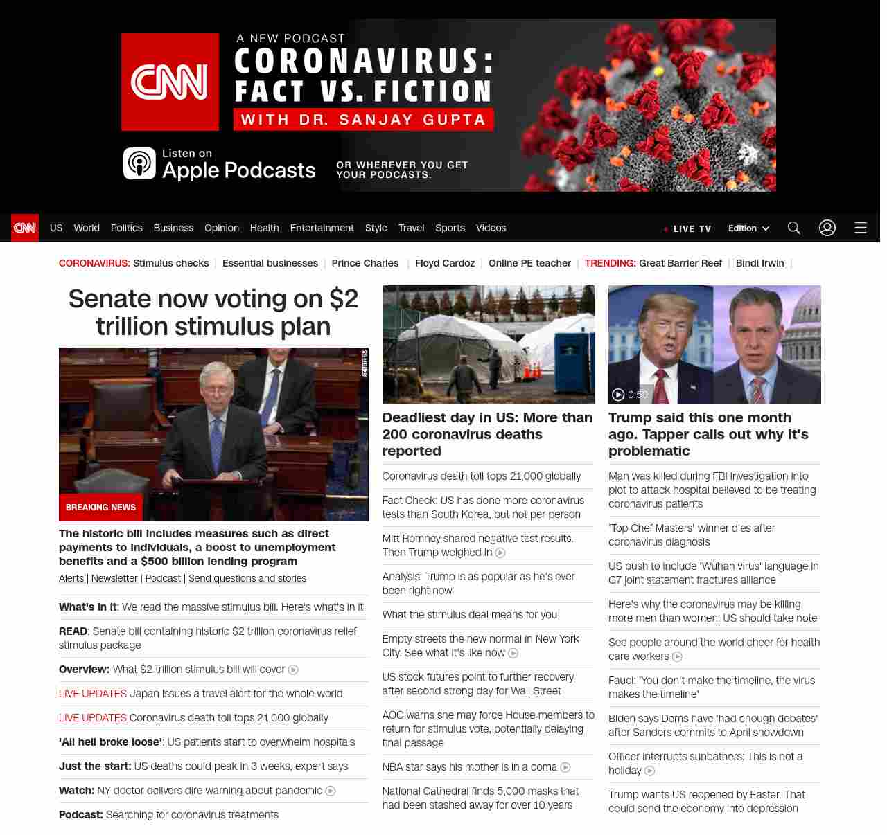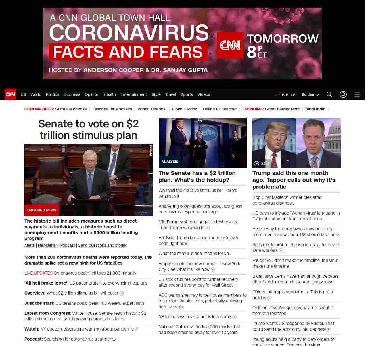 || screaming-banner-text banner-text-size–char-44″ data-analytics=”_list-hierarchical-xs_article_”> Senate to vote on $2 trillion stimulus plan ||” , title: “CNN – Breaking News, Latest News and Videos” , siblings: {“articleList”:[{“uri”:”/2020/03/25/politics/stimulus-senate-action-coronavirus/index.html”,”headline”:”u003cstrong>The historic bill includes measures such as direct payments to individuals, a boost to unemployment benefits and a $500 billion lending programu003c/strong>”,”thumbnail”:”//cdn.cnn.com/cnnnext/dam/assets/200325013813-01-mcconnell-capital-hill-0325-stimulus-small-11.jpg”,”duration”:””,”description”:”u003ca href=”https://www.cnn.com/specials/mobile-apps” target=”_blank”>Alertsu003c/a> | u003ca href=”https://www.cnn.com/specials/coronavirus-newsletter?utm_source=hp&source=hp” target=”_blank”>Newsletteru003c/a> | u003ca href=”https://www.cnn.com/audio/podcasts/corona-virus”>Podcastu003c/a> | u003ca href=”http://www.cnn.com/2020/03/20/us/coronavirus-healthcare-worker-callout/index.html” target=”_blank”>Send questions and storiesu003c/a>”,”layout”:””