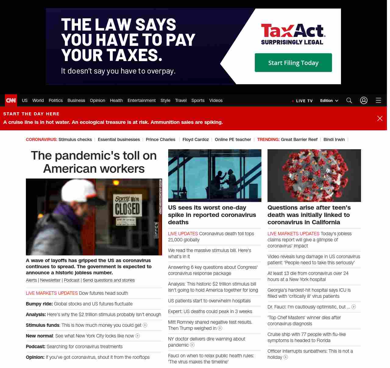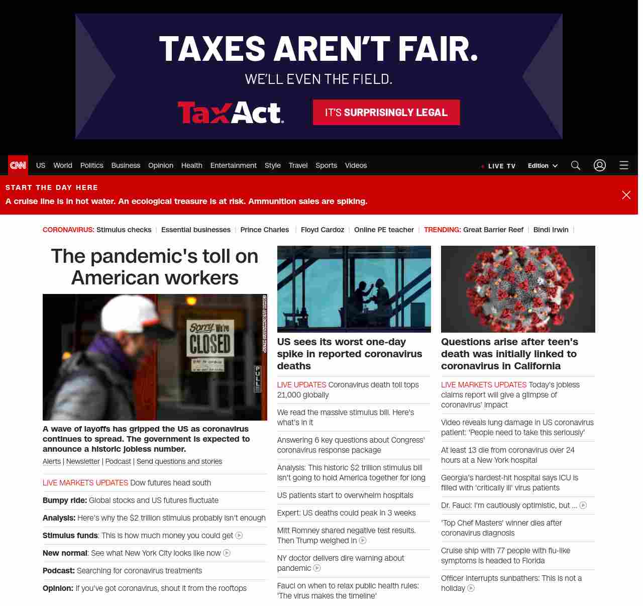 || screaming-banner-text banner-text-size–char-41″ data-analytics=”_list-hierarchical-xs_article_”> The pandemic’s toll on American workers ||” , title: “CNN – Breaking News, Latest News and Videos” , siblings: {“articleList”:[{“uri”:”/2020/03/26/investing/premarket-stocks-trading/index.html”,”headline”:”u003cstrong>A wave of layoffs has gripped the US as coronavirus continues to spread. The government is expected to announce a historic jobless number.u003c/strong>”,”thumbnail”:”//cdn.cnn.com/cnnnext/dam/assets/200326065452-01-closed-restaurant-san-francisco-0317-small-11.jpg”,”duration”:””,”description”:”u003ca href=”https://www.cnn.com/specials/mobile-apps” target=”_blank”>Alertsu003c/a> | u003ca href=”https://www.cnn.com/specials/coronavirus-newsletter?utm_source=hp&source=hp” target=”_blank”>Newsletteru003c/a> | u003ca href=”https://www.cnn.com/audio/podcasts/corona-virus”>Podcastu003c/a> | u003ca href=”http://www.cnn.com/2020/03/20/us/coronavirus-healthcare-worker-callout/index.html” target=”_blank”>Send questions and storiesu003c/a>”,”layout”:””