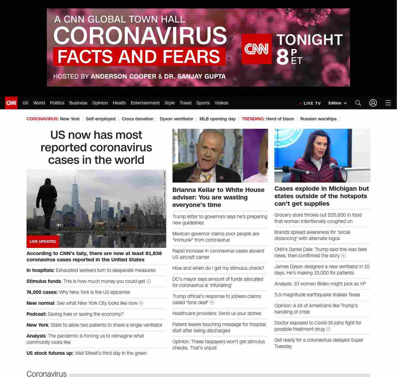 || screaming-banner-text banner-text-size–char-41″ data-analytics=”_list-hierarchical-xs_article_”> Coronavirus deaths in the US top 1,000 ||” , title: “CNN – Breaking News, Latest News and Videos” , siblings: {“articleList”:[{“uri”:”/world/live-news/coronavirus-outbreak-03-26-20-intl-hnk/index.html”,”headline”:”u003cstrong>America is now second only to China in coronavirus cases. Johns Hopkins reports there are more than 500,000 cases globally.u003c/strong>”,”thumbnail”:”//cdn.cnn.com/cnnnext/dam/assets/200320113329-01-nyc-skyline-0319-small-11.jpg”,”duration”:””,”description”:””,”layout”:””