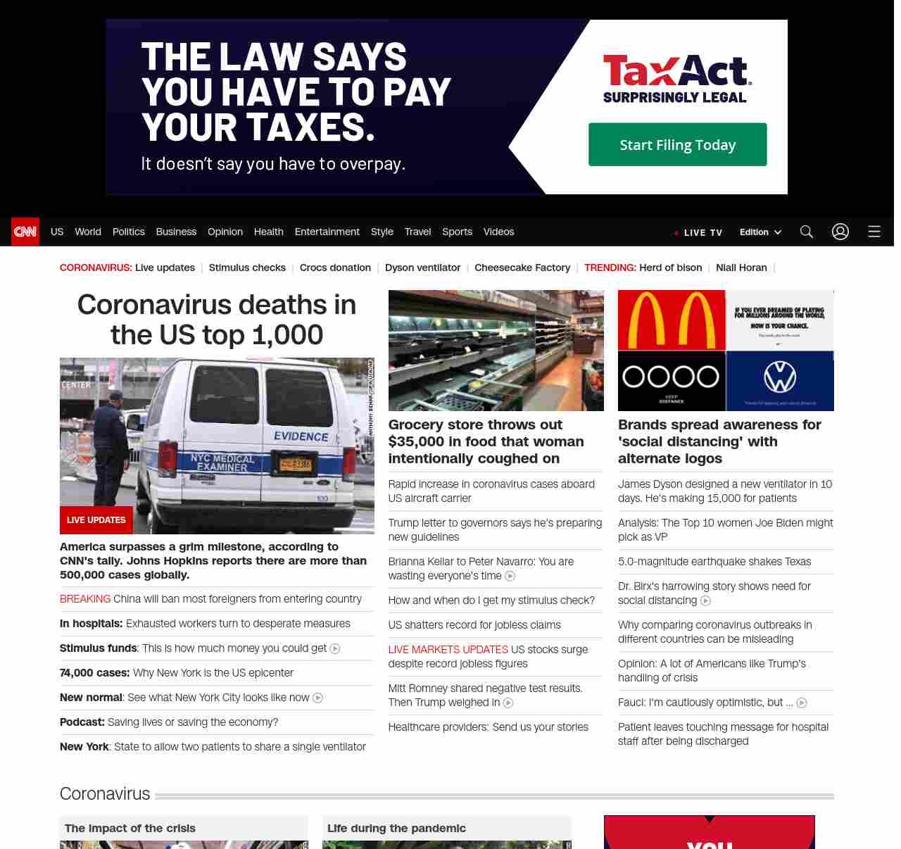 || screaming-banner-text banner-text-size–char-41″ data-analytics=”_list-hierarchical-xs_article_”> Coronavirus deaths in the US top 1,000 ||” , title: “CNN – Breaking News, Latest News and Videos” , siblings: {“articleList”:[{“uri”:”/world/live-news/coronavirus-outbreak-03-26-20-intl-hnk/index.html”,”headline”:”u003cstrong>America surpasses a grim milestone, according to CNN’s tally. Johns Hopkins reports there are more than 500,000 cases globally.u003c/strong>”,”thumbnail”:”//cdn.cnn.com/cnnnext/dam/assets/200326120556-nyc-makeshift-morgue-small-11.jpg”,”duration”:””,”description”:””,”layout”:””