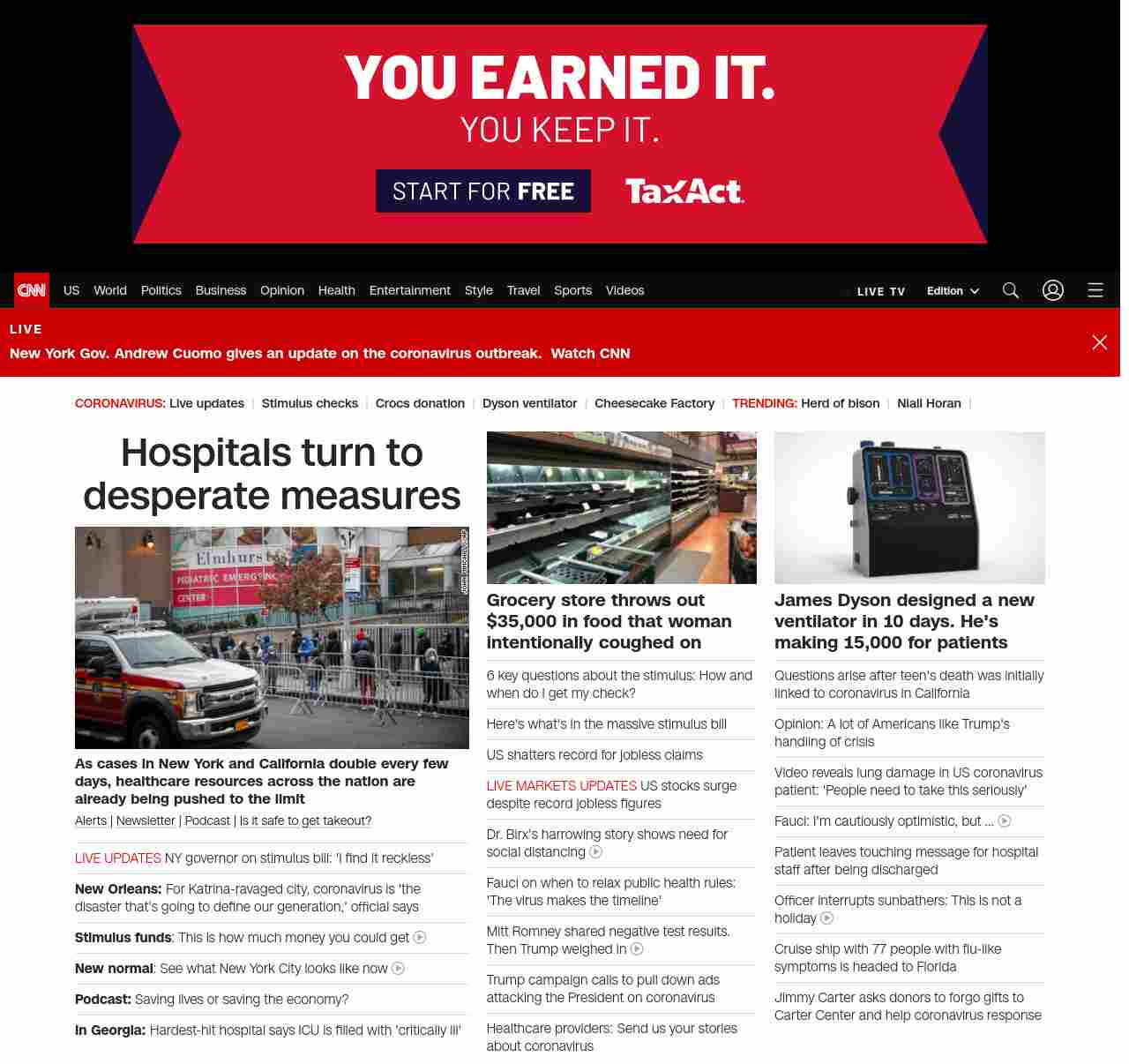 || screaming-banner-text banner-text-size–char-38″ data-analytics=”_list-hierarchical-xs_hyperlink_”> Hospitals turn to desperate measures ||” , title: “CNN – Breaking News, Latest News and Videos” , siblings: {“articleList”:[{“uri”:”/world/live-news/coronavirus-outbreak-03-26-20-intl-hnk/index.html”,”headline”:”NY governor on stimulus bill: ‘I find it reckless'”,”thumbnail”:”//cdn.cnn.com/cnnnext/dam/assets/200325201859-01-coronavirus-0325-illinois-small-11.jpg”,”duration”:””,”description”:””,”layout”:””