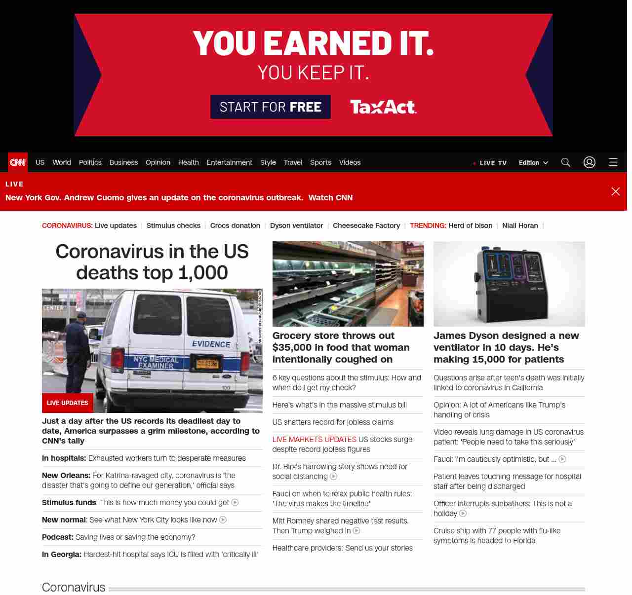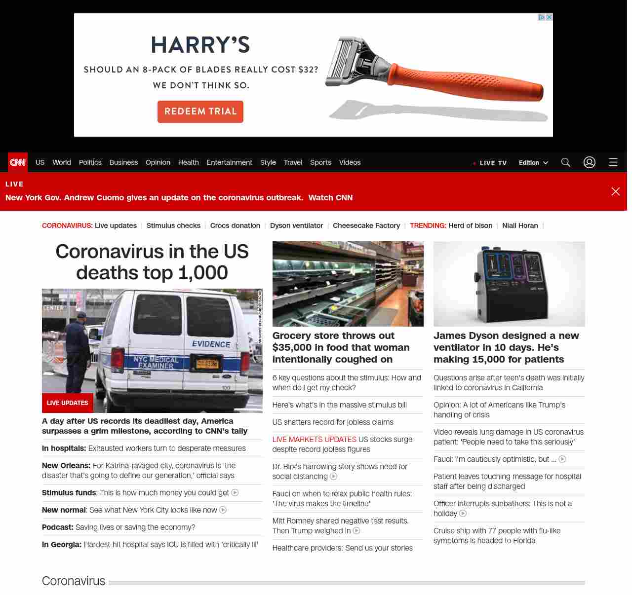 || screaming-banner-text banner-text-size–char-41″ data-analytics=”_list-hierarchical-xs_article_”> Coronavirus in the US deaths top 1,000 ||” , title: “CNN – Breaking News, Latest News and Videos” , siblings: {“articleList”:[{“uri”:”/world/live-news/coronavirus-outbreak-03-26-20-intl-hnk/index.html”,”headline”:”u003cstrong>A day after US records its deadliest day, America surpasses a grim milestone, according to CNN’s tallyu003c/strong>”,”thumbnail”:”//cdn.cnn.com/cnnnext/dam/assets/200326120556-nyc-makeshift-morgue-small-11.jpg”,”duration”:””,”description”:””,”layout”:””