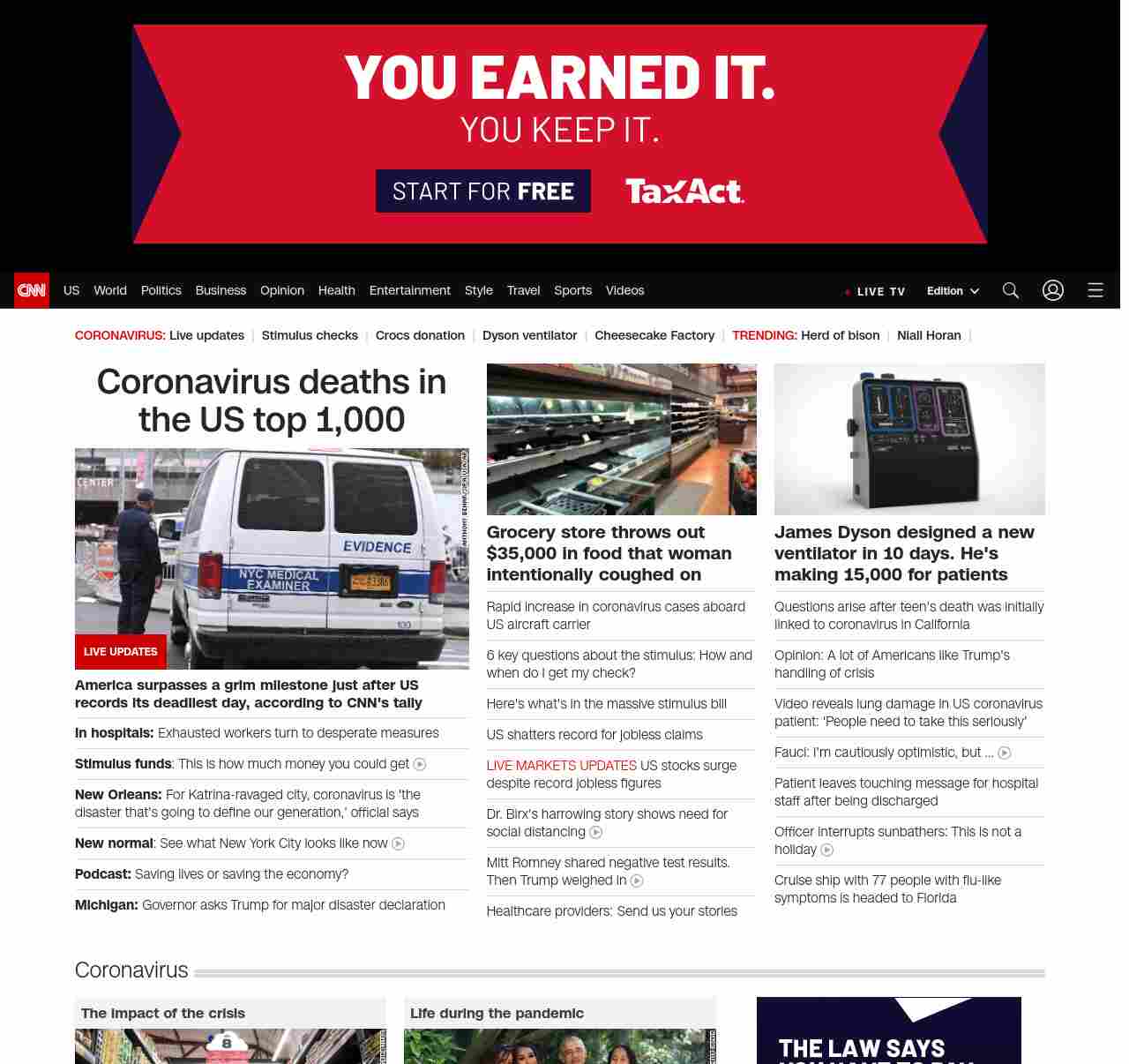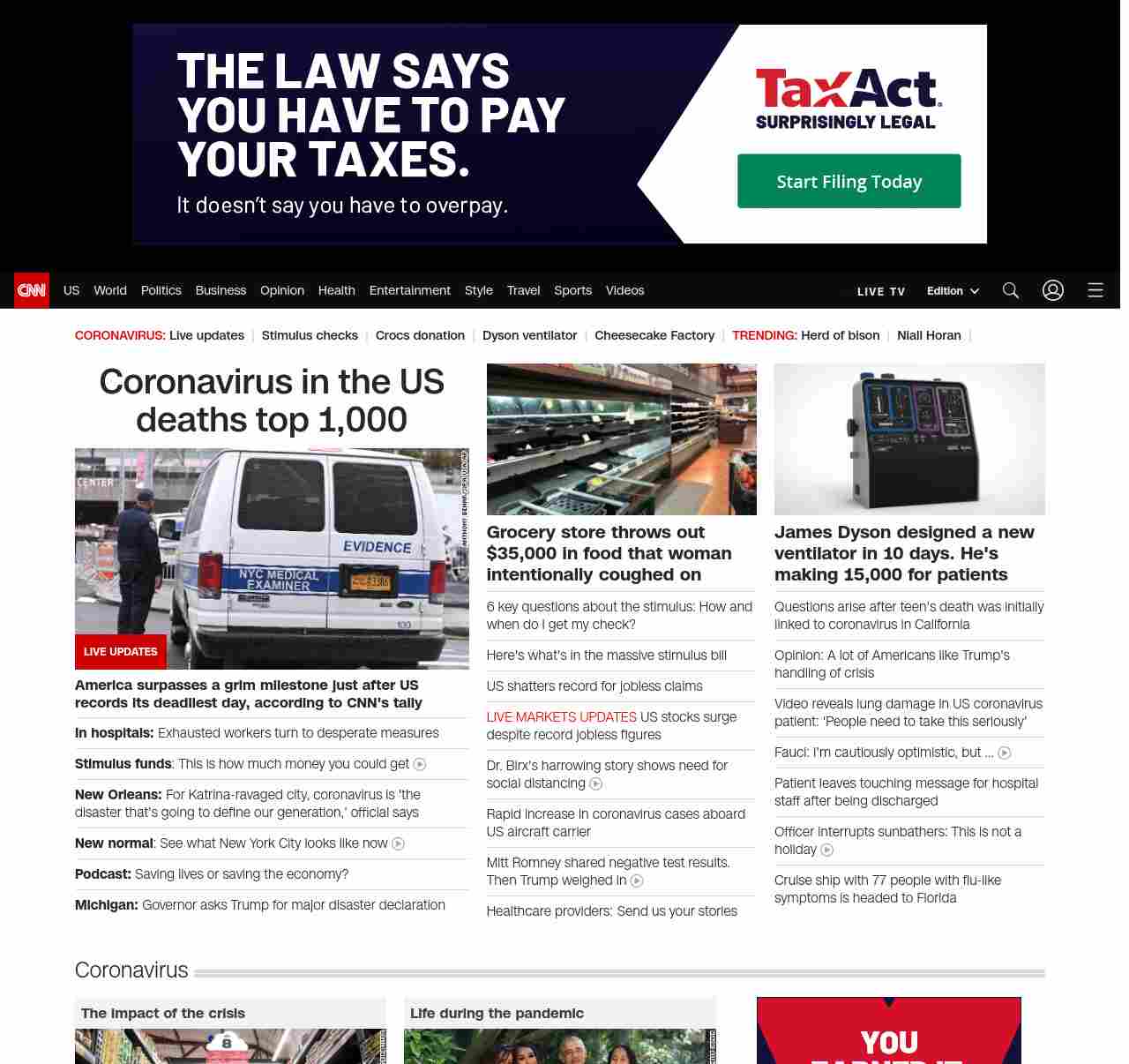 || screaming-banner-text banner-text-size–char-41″ data-analytics=”_list-hierarchical-xs_article_”> Coronavirus in the US deaths top 1,000 ||” , title: “CNN – Breaking News, Latest News and Videos” , siblings: {“articleList”:[{“uri”:”/world/live-news/coronavirus-outbreak-03-26-20-intl-hnk/index.html”,”headline”:”u003cstrong>America surpasses a grim milestone just after US records its deadliest day, according to CNN’s tallyu003c/strong>”,”thumbnail”:”//cdn.cnn.com/cnnnext/dam/assets/200326120556-nyc-makeshift-morgue-small-11.jpg”,”duration”:””,”description”:””,”layout”:””