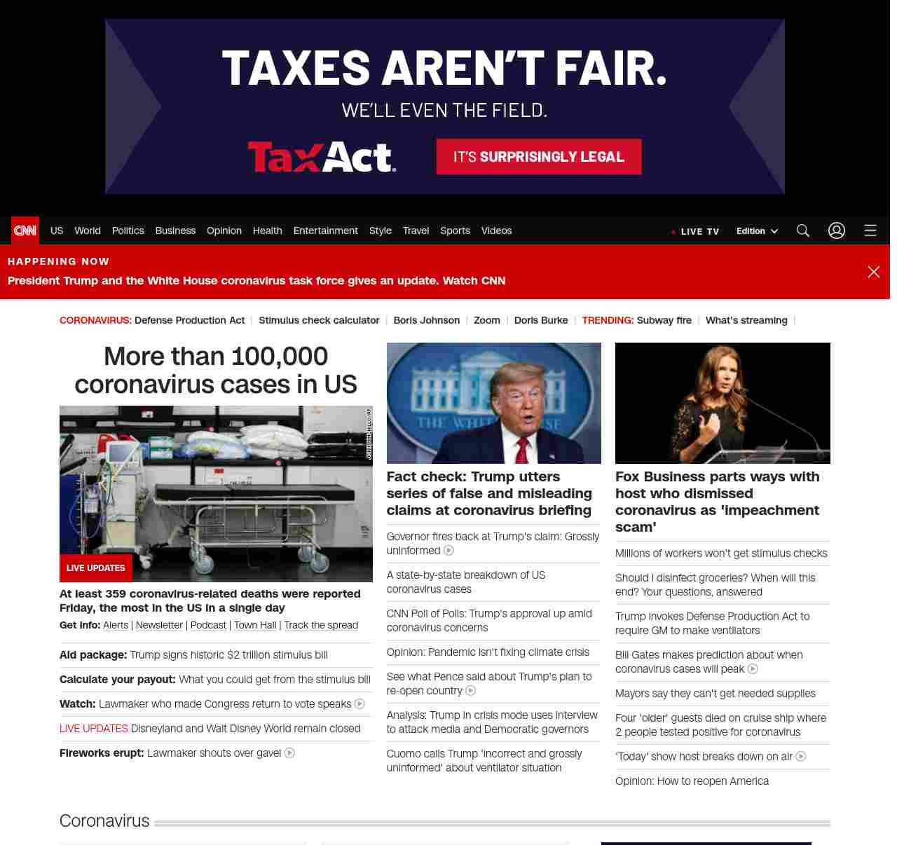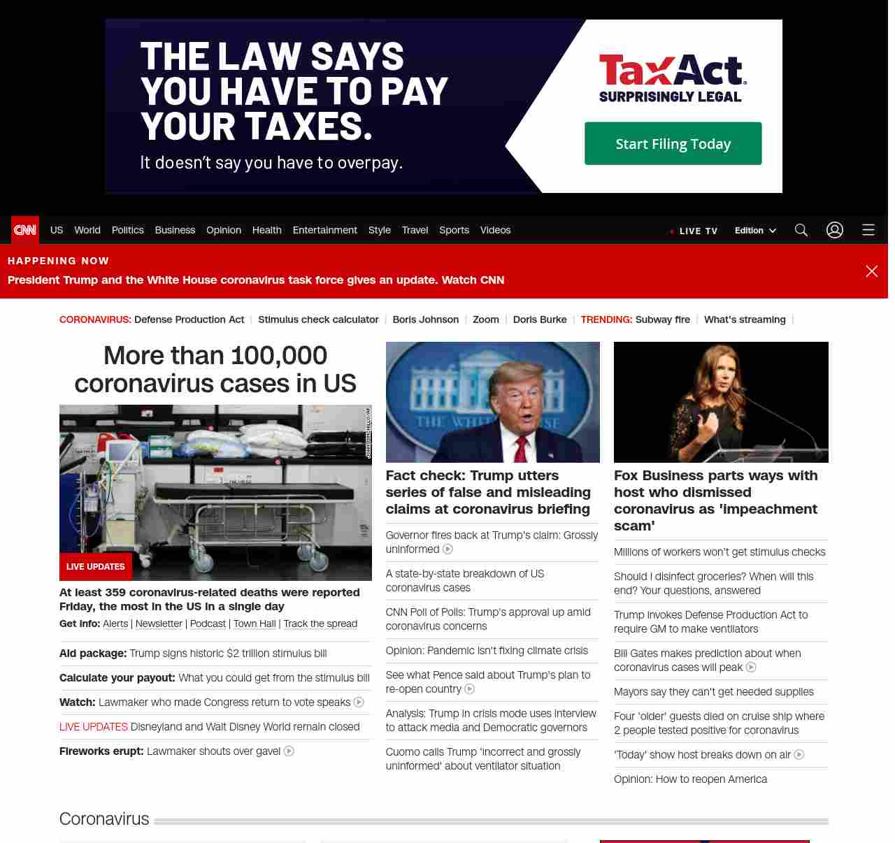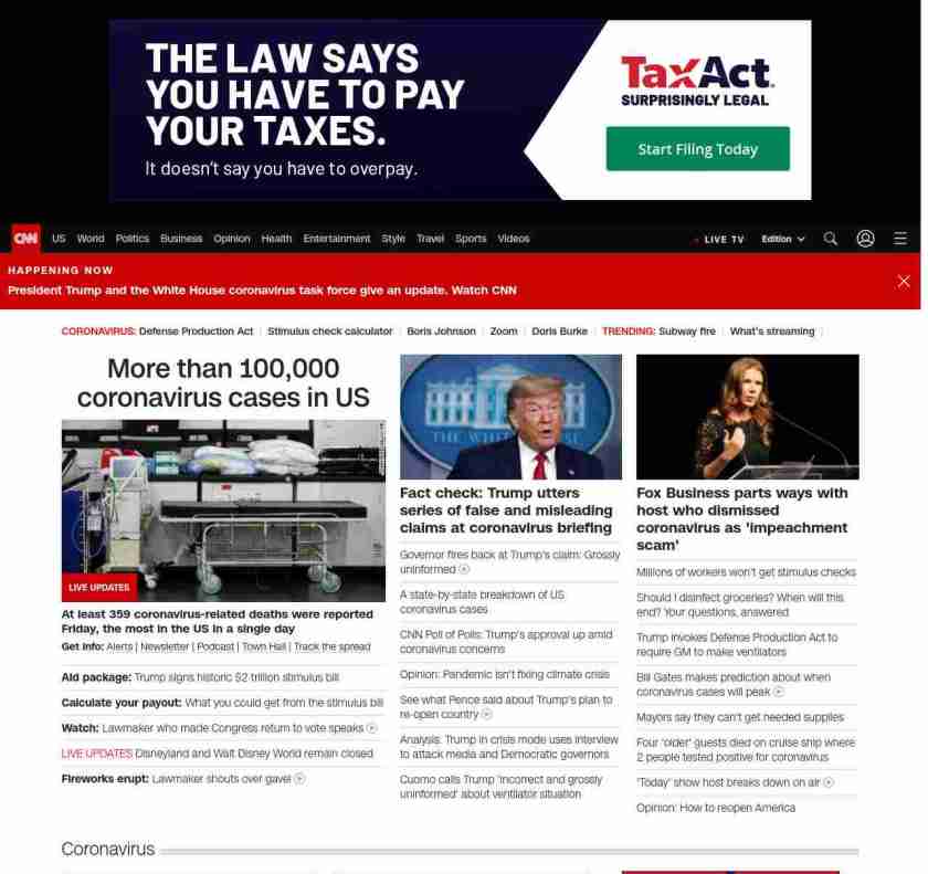 || screaming-banner-text banner-text-size–char-44″ data-analytics=”_list-hierarchical-xs_hyperlink_”> More than 100,000 coronavirus cases in US ||” , title: “CNN – Breaking News, Latest News and Videos” , siblings: {“articleList”:[{“uri”:”/2020/03/27/politics/coronavirus-stimulus-house-vote/index.html”,”headline”:”u003cstrong>Aid package:u003c/strong> Trump signs historic $2 trillion stimulus bill”,”thumbnail”:”//cdn.cnn.com/cnnnext/dam/assets/200327142427-01-pelosi-bill-signing-0327-small-11.jpg”,”duration”:””,”description”:”u003cstrong>Get info:u003c/strong> u003ca href=”https://www.cnn.com/specials/mobile-apps” target=”_blank”>Alertsu003c/a> | u003ca href=”https://www.cnn.com/specials/coronavirus-newsletter?utm_source=hp&source=hp” target=”_blank”>Newsletteru003c/a> | u003ca href=”https://www.cnn.com/audio/podcasts/corona-virus”>Podcastu003c/a> | u003ca href=”http://www.cnn.com/2020/03/26/app-news-section/full-coronavirus-town-hall-march-26-2020-app/index.html” target=”_blank”>Town Hallu003c/a> | u003ca href=”https://www.cnn.com/interactive/2020/health/coronavirus-maps-and-cases/” target=”_blank”>Track the spreadu003c/a>”,”layout”:””