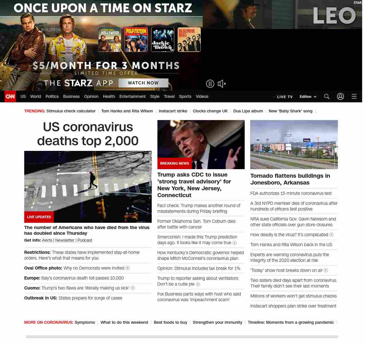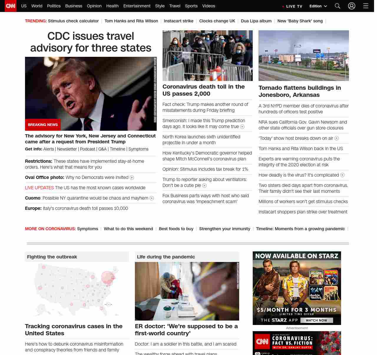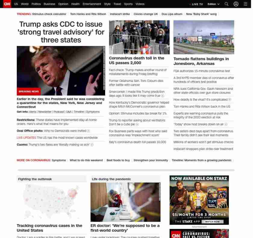 || screaming-banner-text banner-text-size–char-32″ data-analytics=”_list-hierarchical-xs_hyperlink_”> US coronavirus deaths top 2,000 ||” , title: “CNN – Breaking News, Latest News and Videos” , siblings: {“articleList”:[{“uri”:”/2020/03/28/politics/trump-new-york-new-jersey-quarantine-coronavirus/index.html”,”headline”:”u003cstrong>Earlier in the day, the President said he was considering a quarantine for the states, New York, New Jersey and Connecticutu003c/strong>”,”thumbnail”:”//cdn.cnn.com/cnnnext/dam/assets/200328091200-01-trump-coronavirus-press-briefing-0327-small-11.jpg”,”duration”:””,”description”:”u003cstrong>Get info:u003c/strong> u003ca href=”https://www.cnn.com/specials/mobile-apps” target=”_blank”>Alertsu003c/a> | u003ca href=”https://www.cnn.com/specials/coronavirus-newsletter?utm_source=hp&source=hp” target=”_blank”>Newsletteru003c/a> | u003ca href=”https://www.cnn.com/audio/podcasts/corona-virus”>Podcastu003c/a> | u003ca href=”https://www.cnn.com/interactive/2020/health/coronavirus-questions-answers/” target=”_blank”>Q&Au003c/a> | u003ca href=”https://www.cnn.com/2020/02/06/health/wuhan-coronavirus-timeline-fast-facts/index.html” target=”_blank”>Timelineu003c/a> | u003ca href=”https://www.cnn.com/2020/03/28/health/coronavirus-symptoms-list-what-to-do-wellness/index.html” target=”_blank”>Symptomsu003c/a>”,”layout”:””