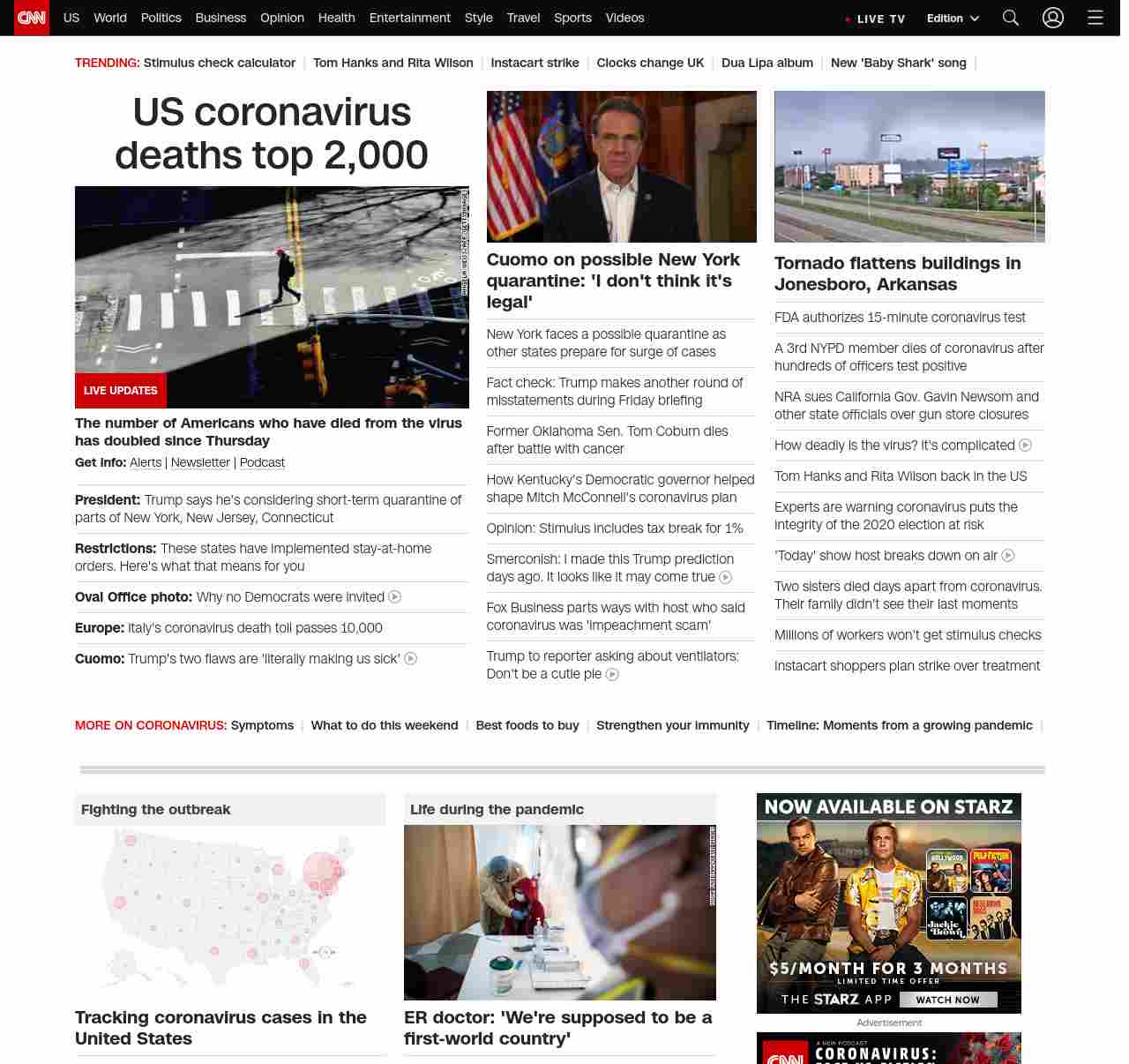 || screaming-banner-text banner-text-size–char-32″ data-analytics=”_list-hierarchical-xs_hyperlink_”> US coronavirus deaths top 2,000 ||” , title: “CNN – Breaking News, Latest News and Videos” , siblings: {“articleList”:[{“uri”:”/2020/03/28/politics/trump-new-york-new-jersey-quarantine-coronavirus/index.html”,”headline”:”u003cstrong>President: u003c/strong>Trump says he’s considering short-term quarantine of parts of New York, New Jersey, Connecticut “,”thumbnail”:”//cdn.cnn.com/cnnnext/dam/assets/200328091200-01-trump-coronavirus-press-briefing-0327-small-11.jpg”,”duration”:””,”description”:”President Donald Trump said Saturday that he’s considering a short-term quarantine of “hot spots” in parts of the tri-state area — New York, New Jersey and Connecticut — where cases of u003ca href=”https://www.cnn.com/world/live-news/coronavirus-outbreak-03-28-20-intl-hnk/index.html” target=”_blank”>coronavirusu003c/a> continue to rise. “,”layout”:””