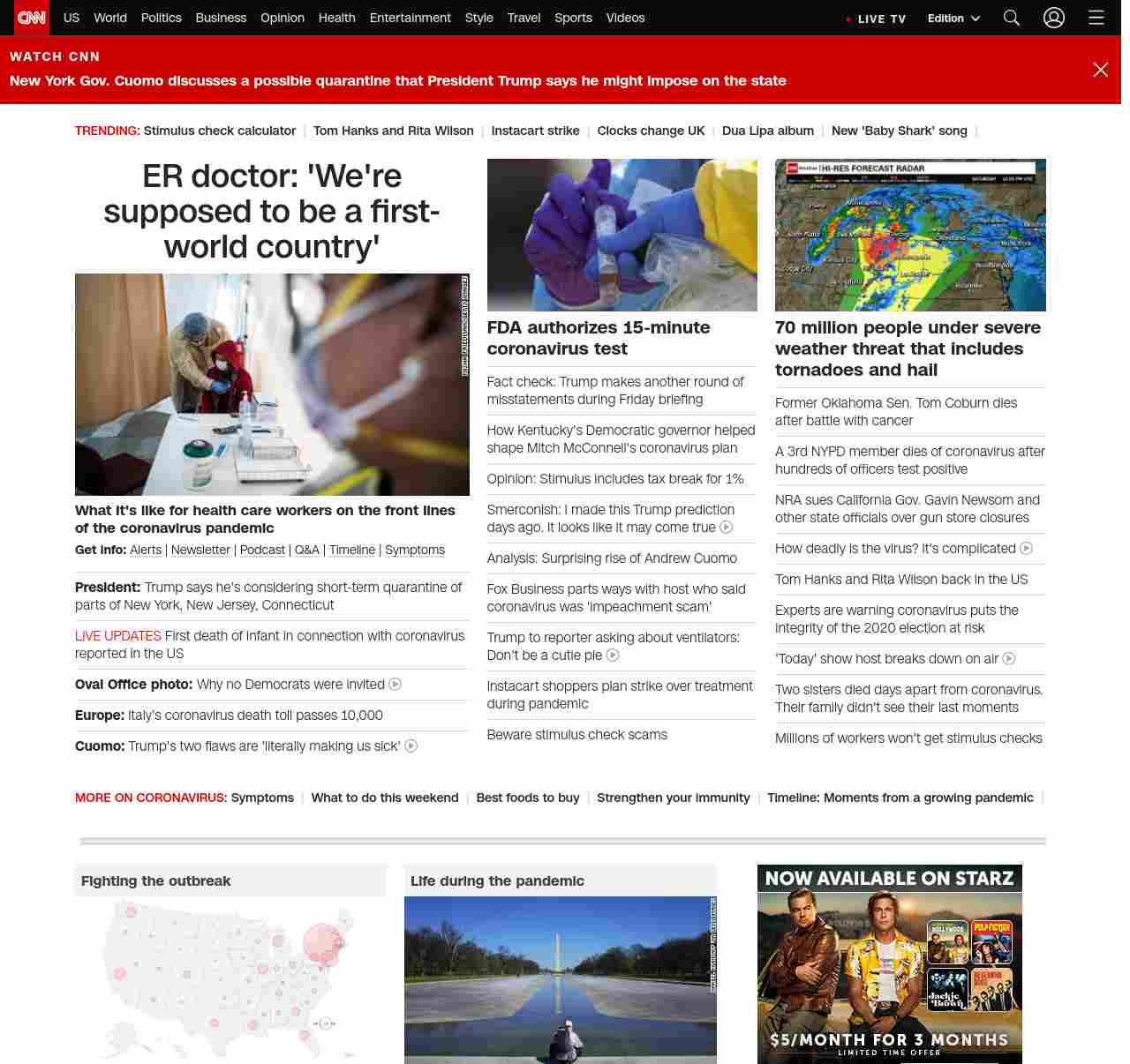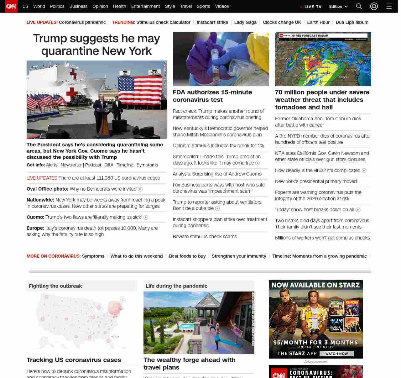 || screaming-banner-text banner-text-size–char-44″ data-analytics=”_list-hierarchical-xs_article_”> Trump suggests he may quarantine New York ||” , title: “CNN – Breaking News, Latest News and Videos” , siblings: {“articleList”:[{“uri”:”/2020/03/28/politics/trump-new-york-new-jersey-quarantine-coronavirus/index.html”,”headline”:”u003cstrong>The President says he’s considering quarantining some areas, but New York Gov. Cuomo says he hasn’t discussed the possibility with Trumpu003c/strong>”,”thumbnail”:”//cdn.cnn.com/cnnnext/dam/assets/200328141115-01-trump-usns-comfort-0328-small-11.jpg”,”duration”:””,”description”:”u003cstrong>Get info:u003c/strong> u003ca href=”https://www.cnn.com/specials/mobile-apps” target=”_blank”>Alertsu003c/a> | u003ca href=”https://www.cnn.com/specials/coronavirus-newsletter?utm_source=hp&source=hp” target=”_blank”>Newsletteru003c/a> | u003ca href=”https://www.cnn.com/audio/podcasts/corona-virus”>Podcastu003c/a> | u003ca href=”https://www.cnn.com/interactive/2020/health/coronavirus-questions-answers/” target=”_blank”>Q&Au003c/a> | u003ca href=”https://www.cnn.com/2020/02/06/health/wuhan-coronavirus-timeline-fast-facts/index.html” target=”_blank”>Timelineu003c/a> | u003ca href=”https://www.cnn.com/2020/03/28/health/coronavirus-symptoms-list-what-to-do-wellness/index.html” target=”_blank”>Symptomsu003c/a>”,”layout”:””