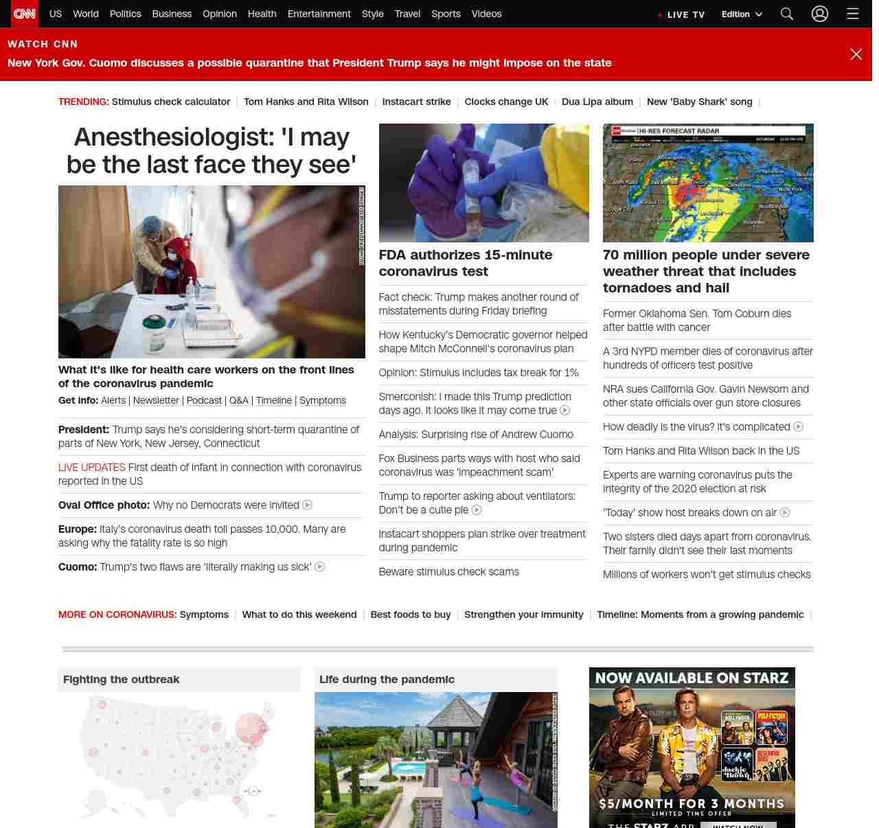 || screaming-banner-text banner-text-size–char-44″ data-analytics=”_list-hierarchical-xs_article_”> Trump suggests he may quarantine New York ||” , title: “CNN – Breaking News, Latest News and Videos” , siblings: {“articleList”:[{“uri”:”/2020/03/28/politics/trump-new-york-new-jersey-quarantine-coronavirus/index.html”,”headline”:”u003cstrong>The President said Saturday he’s considering a short-term quarantine of New York, New Jersey and parts of Connecticut, as coronavirus cases riseu003c/strong>”,”thumbnail”:”//cdn.cnn.com/cnnnext/dam/assets/200328141115-01-trump-usns-comfort-0328-small-11.jpg”,”duration”:””,”description”:”u003cstrong>Get info:u003c/strong> u003ca href=”https://www.cnn.com/specials/mobile-apps” target=”_blank”>Alertsu003c/a> | u003ca href=”https://www.cnn.com/specials/coronavirus-newsletter?utm_source=hp&source=hp” target=”_blank”>Newsletteru003c/a> | u003ca href=”https://www.cnn.com/audio/podcasts/corona-virus”>Podcastu003c/a> | u003ca href=”https://www.cnn.com/interactive/2020/health/coronavirus-questions-answers/” target=”_blank”>Q&Au003c/a> | u003ca href=”https://www.cnn.com/2020/02/06/health/wuhan-coronavirus-timeline-fast-facts/index.html” target=”_blank”>Timelineu003c/a> | u003ca href=”https://www.cnn.com/2020/03/28/health/coronavirus-symptoms-list-what-to-do-wellness/index.html” target=”_blank”>Symptomsu003c/a>”,”layout”:””
