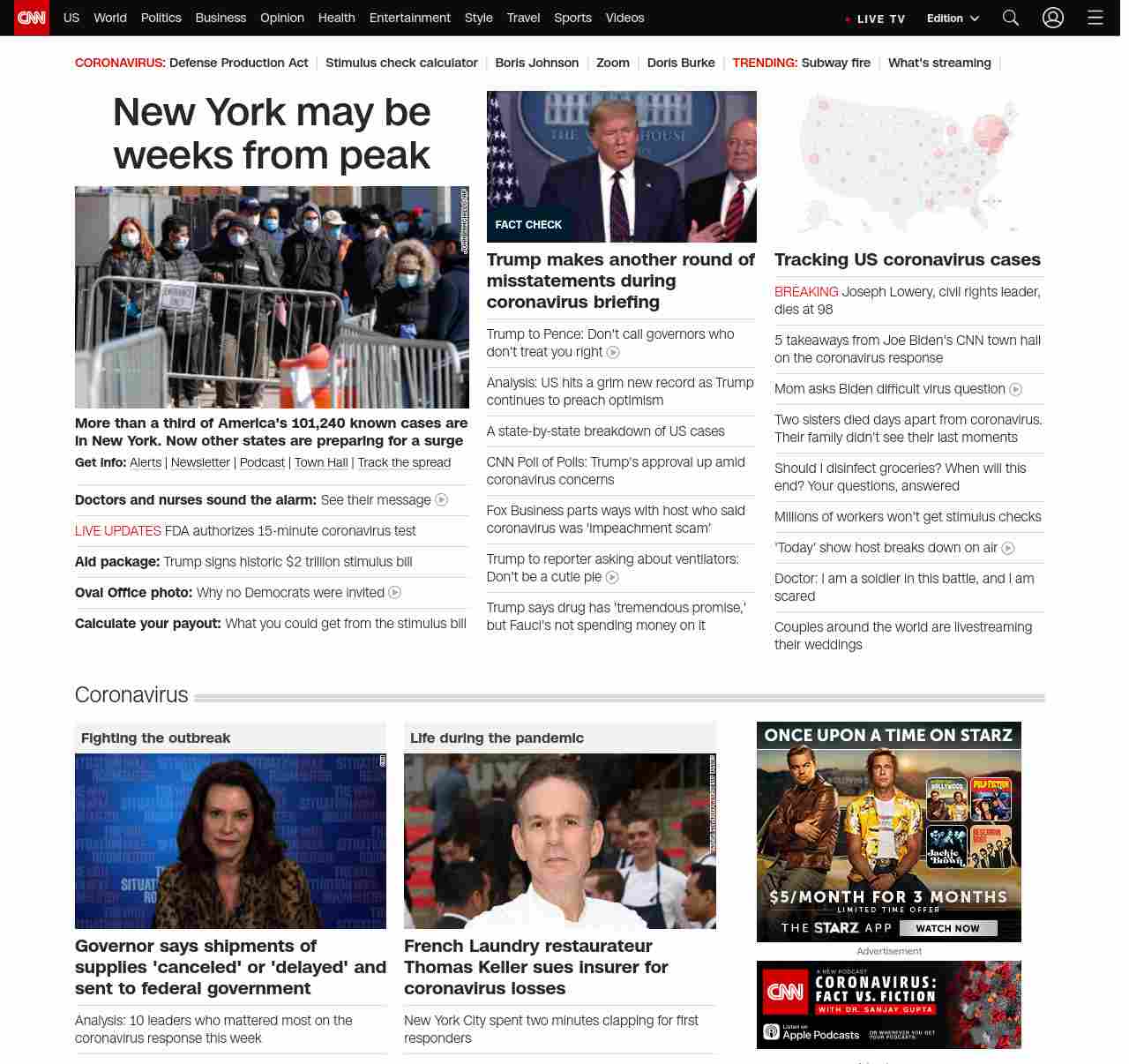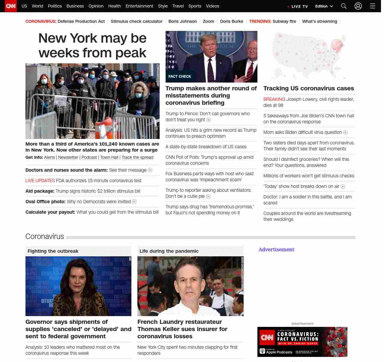 || screaming-banner-text banner-text-size–char-32″ data-analytics=”_list-hierarchical-xs_article_”> New York may be weeks from peak ||” , title: “CNN – Breaking News, Latest News and Videos” , siblings: {“articleList”:[{“uri”:”/2020/03/28/health/us-coronavirus-weekend-saturday/index.html”,”headline”:”u003cstrong>More than a third of America’s 101,240 known cases are in New York. Now other states are preparing for a surgeu003c/strong>”,”thumbnail”:”//cdn.cnn.com/cnnnext/dam/assets/200328031805-01-coronavirus-new-york-0327-small-11.jpg”,”duration”:””,”description”:”u003cstrong>Get info:u003c/strong> u003ca href=”https://www.cnn.com/specials/mobile-apps” target=”_blank”>Alertsu003c/a> | u003ca href=”https://www.cnn.com/specials/coronavirus-newsletter?utm_source=hp&source=hp” target=”_blank”>Newsletteru003c/a> | u003ca href=”https://www.cnn.com/audio/podcasts/corona-virus”>Podcastu003c/a> | u003ca href=”http://www.cnn.com/2020/03/26/app-news-section/full-coronavirus-town-hall-march-26-2020-app/index.html” target=”_blank”>Town Hallu003c/a> | u003ca href=”https://www.cnn.com/interactive/2020/health/coronavirus-maps-and-cases/” target=”_blank”>Track the spreadu003c/a>”,”layout”:””