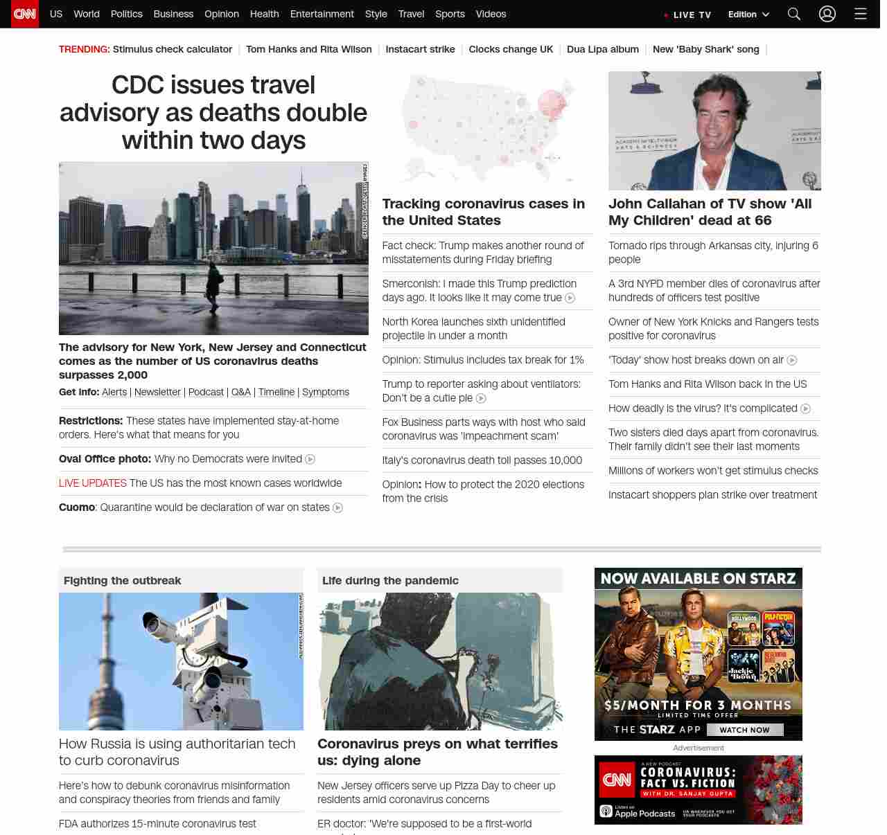 || screaming-banner-text banner-text-size–char-47″ data-analytics=”_list-hierarchical-xs_article_”> CDC issues travel advisory as deaths double within two days ||” , title: “CNN – Breaking News, Latest News and Videos” , siblings: {“articleList”:[{“uri”:”/2020/03/29/health/us-coronavirus-wrap-sunday/index.html”,”headline”:”u003cstrong>The advisory for New York, New Jersey and Connecticut comes as US coronavirus deaths surpass 2,000u003c/strong>”,”thumbnail”:”//cdn.cnn.com/cnnnext/dam/assets/200329010716-new-york-travel-advisory-small-11.jpg”,”duration”:””,”description”:”u003cstrong>Get info:u003c/strong> u003ca href=”https://www.cnn.com/specials/mobile-apps” target=”_blank”>Alertsu003c/a> | u003ca href=”https://www.cnn.com/specials/coronavirus-newsletter?utm_source=hp&source=hp” target=”_blank”>Newsletteru003c/a> | u003ca href=”https://www.cnn.com/audio/podcasts/corona-virus”>Podcastu003c/a> | u003ca href=”https://www.cnn.com/interactive/2020/health/coronavirus-questions-answers/” target=”_blank”>Q&Au003c/a> | u003ca href=”https://www.cnn.com/2020/02/06/health/wuhan-coronavirus-timeline-fast-facts/index.html” target=”_blank”>Timelineu003c/a> | u003ca href=”https://www.cnn.com/2020/03/28/health/coronavirus-symptoms-list-what-to-do-wellness/index.html” target=”_blank”>Symptomsu003c/a>”,”layout”:””