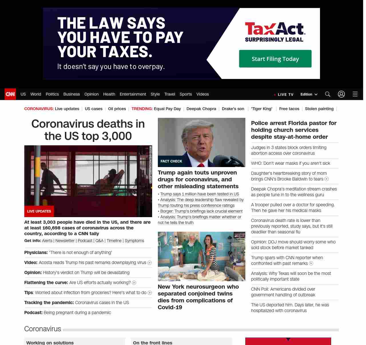|| screaming-banner-text banner-text-size–char-41″ data-analytics=”_list-hierarchical-xs_hyperlink_”> Coronavirus deaths in the US top 3,000 ||” , title: “CNN – Breaking News, Latest News and Videos” , siblings: {“articleList”:[{“uri”:”/2020/03/30/health/us-coronavirus-updates-monday/index.html”,”headline”:”u003cstrong>Physicians: u003c/strong>’There is not enough of anything'”,”thumbnail”:”//cdn.cnn.com/cnnnext/dam/assets/200330194448-jackson-memorial-hospital-file-restricted-small-11.jpg”,”duration”:””,”description”:”u003cstrong>Get info:u003c/strong> u003ca href=”https://www.cnn.com/specials/mobile-apps” target=”_blank”>Alertsu003c/a> | u003ca href=”https://www.cnn.com/specials/coronavirus-newsletter?utm_source=hp&source=hp” target=”_blank”>Newsletteru003c/a> | u003ca href=”https://www.cnn.com/audio/podcasts/corona-virus”>Podcastu003c/a> | u003ca href=”https://www.cnn.com/interactive/2020/health/coronavirus-questions-answers/” target=”_blank”>Q&Au003c/a> | u003ca href=”https://www.cnn.com/2020/02/06/health/wuhan-coronavirus-timeline-fast-facts/index.html” target=”_blank”>Timelineu003c/a> | u003ca href=”https://www.cnn.com/2020/03/28/health/coronavirus-symptoms-list-what-to-do-wellness/index.html” target=”_blank”>Symptomsu003c/a>”,”layout”:””
