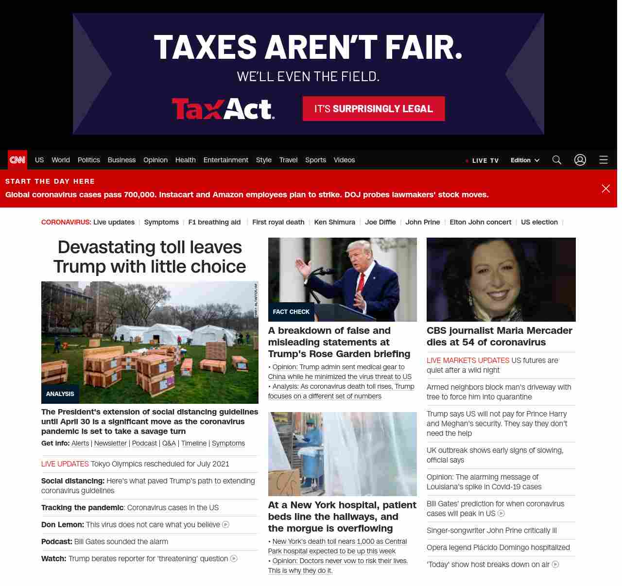 || screaming-banner-text banner-text-size–char-47″ data-analytics=”_list-hierarchical-xs_article_”> Devastating toll leaves Trump with little choice ||” , title: “CNN – Breaking News, Latest News and Videos” , siblings: {“articleList”:[{“uri”:”/2020/03/30/politics/donald-trump-coronavirus-easter-hospitals-deadline/index.html”,”headline”:”u003cstrong>The President’s extension of social distancing guidelines until April 30 is a significant move as the coronavirus pandemic is set to take a savage turnu003c/strong>”,”thumbnail”:”//cdn.cnn.com/cnnnext/dam/assets/200330074423-01-central-park-field-hospital-coronavirus-0329-small-11.jpg”,”duration”:””,”description”:”u003cstrong>Get info:u003c/strong> u003ca href=”https://www.cnn.com/specials/mobile-apps” target=”_blank”>Alertsu003c/a> | u003ca href=”https://www.cnn.com/specials/coronavirus-newsletter?utm_source=hp&source=hp” target=”_blank”>Newsletteru003c/a> | u003ca href=”https://www.cnn.com/audio/podcasts/corona-virus”>Podcastu003c/a> | u003ca href=”https://www.cnn.com/interactive/2020/health/coronavirus-questions-answers/” target=”_blank”>Q&Au003c/a> | u003ca href=”https://www.cnn.com/2020/02/06/health/wuhan-coronavirus-timeline-fast-facts/index.html” target=”_blank”>Timelineu003c/a> | u003ca href=”https://www.cnn.com/2020/03/28/health/coronavirus-symptoms-list-what-to-do-wellness/index.html” target=”_blank”>Symptomsu003c/a>”,”layout”:””