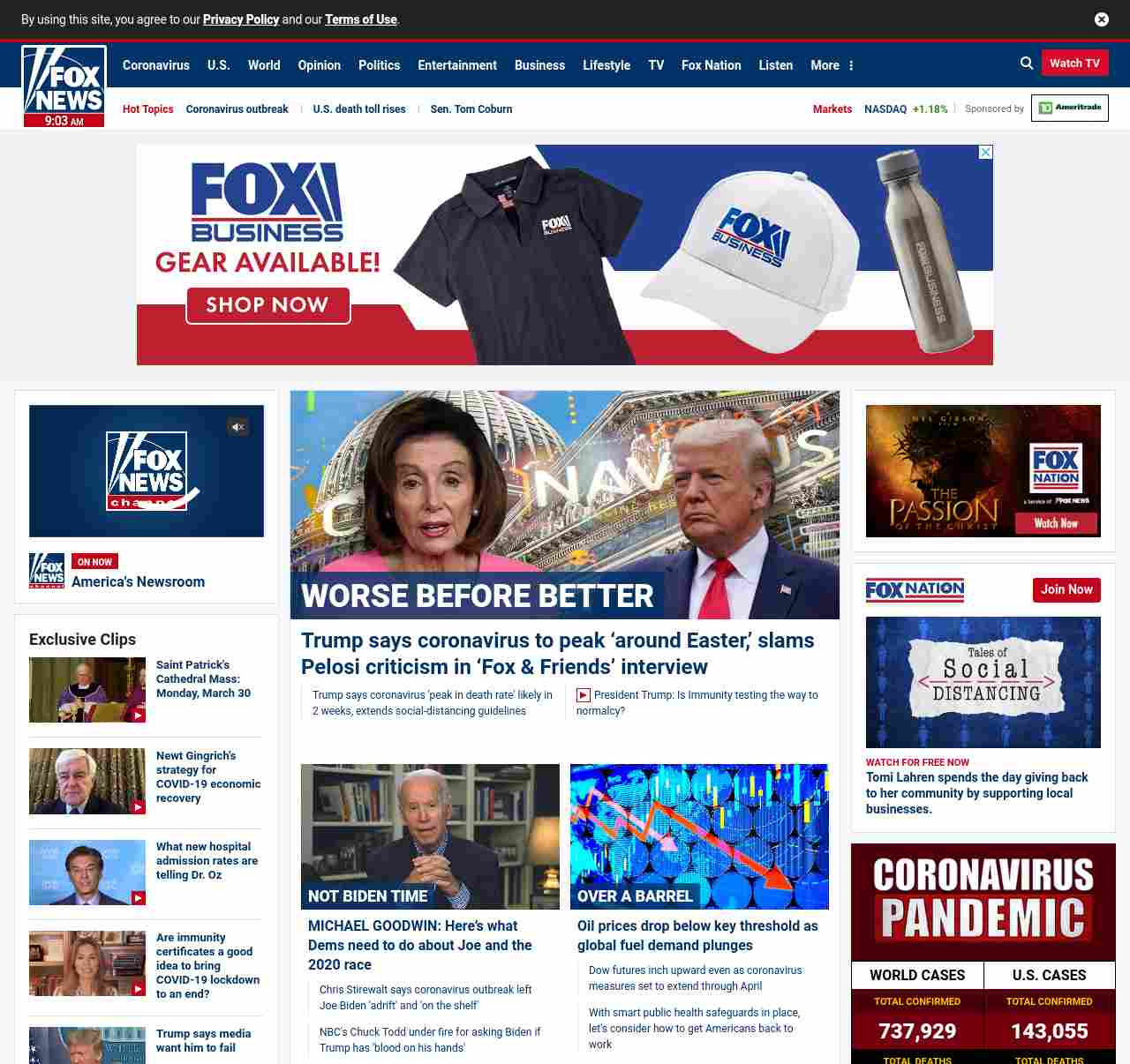 FN: [[WORSE BEFORE BETTER]] Trump says coronavirus to peak ‘around Easter,’ slams Pelosi criticism in ‘Fox & Friends’ interview ((lubuntu at wor2))