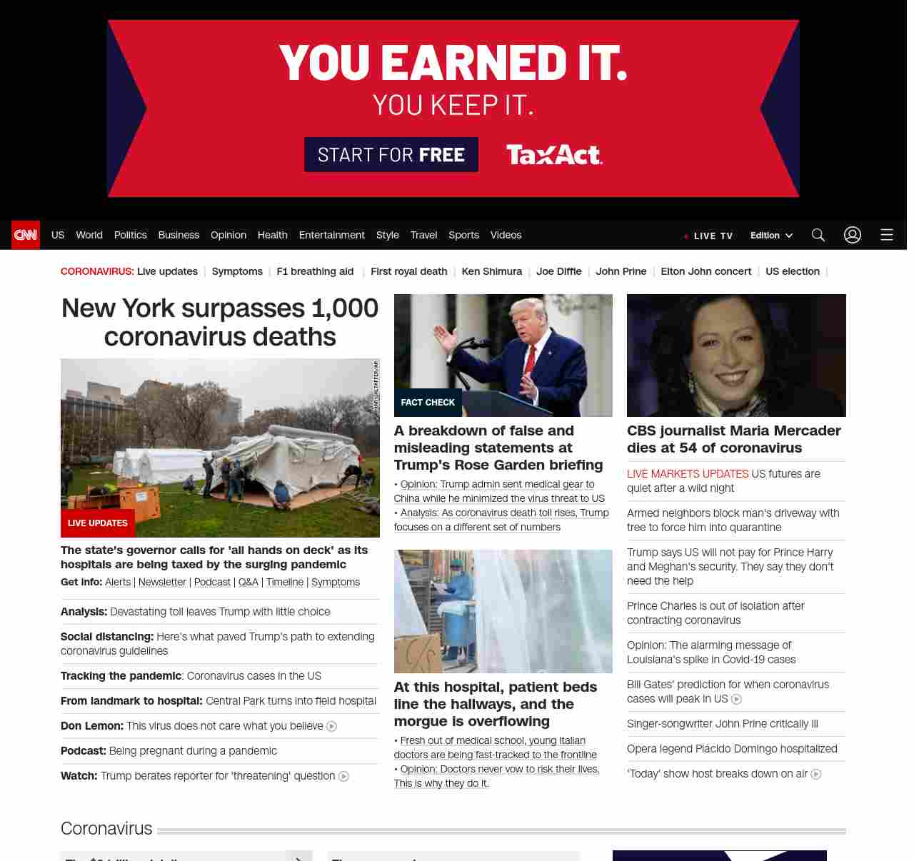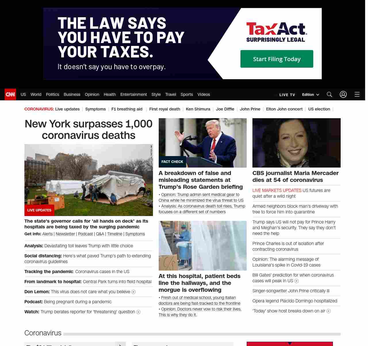 || screaming-banner-text banner-text-size–char-44″ data-analytics=”_list-hierarchical-xs_hyperlink_”> New York surpasses 1,000 coronavirus deaths ||” , title: “CNN – Breaking News, Latest News and Videos” , siblings: {“articleList”:[{“uri”:”/2020/03/30/politics/donald-trump-coronavirus-easter-hospitals-deadline/index.html”,”headline”:”u003cstrong>Analysis:u003c/strong> Devastating toll leaves Trump with little choice”,”thumbnail”:”//cdn.cnn.com/cnnnext/dam/assets/200330074423-01-central-park-field-hospital-coronavirus-0329-small-11.jpg”,”duration”:””,”description”:”u003cstrong>Get info:u003c/strong> u003ca href=”https://www.cnn.com/specials/mobile-apps” target=”_blank”>Alertsu003c/a> | u003ca href=”https://www.cnn.com/specials/coronavirus-newsletter?utm_source=hp&source=hp” target=”_blank”>Newsletteru003c/a> | u003ca href=”https://www.cnn.com/audio/podcasts/corona-virus”>Podcastu003c/a> | u003ca href=”https://www.cnn.com/interactive/2020/health/coronavirus-questions-answers/” target=”_blank”>Q&Au003c/a> | u003ca href=”https://www.cnn.com/2020/02/06/health/wuhan-coronavirus-timeline-fast-facts/index.html” target=”_blank”>Timelineu003c/a> | u003ca href=”https://www.cnn.com/2020/03/28/health/coronavirus-symptoms-list-what-to-do-wellness/index.html” target=”_blank”>Symptomsu003c/a>”,”layout”:””