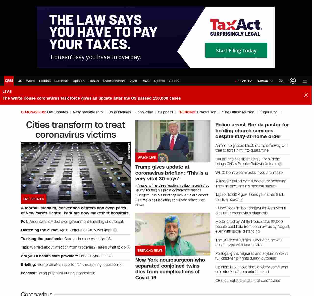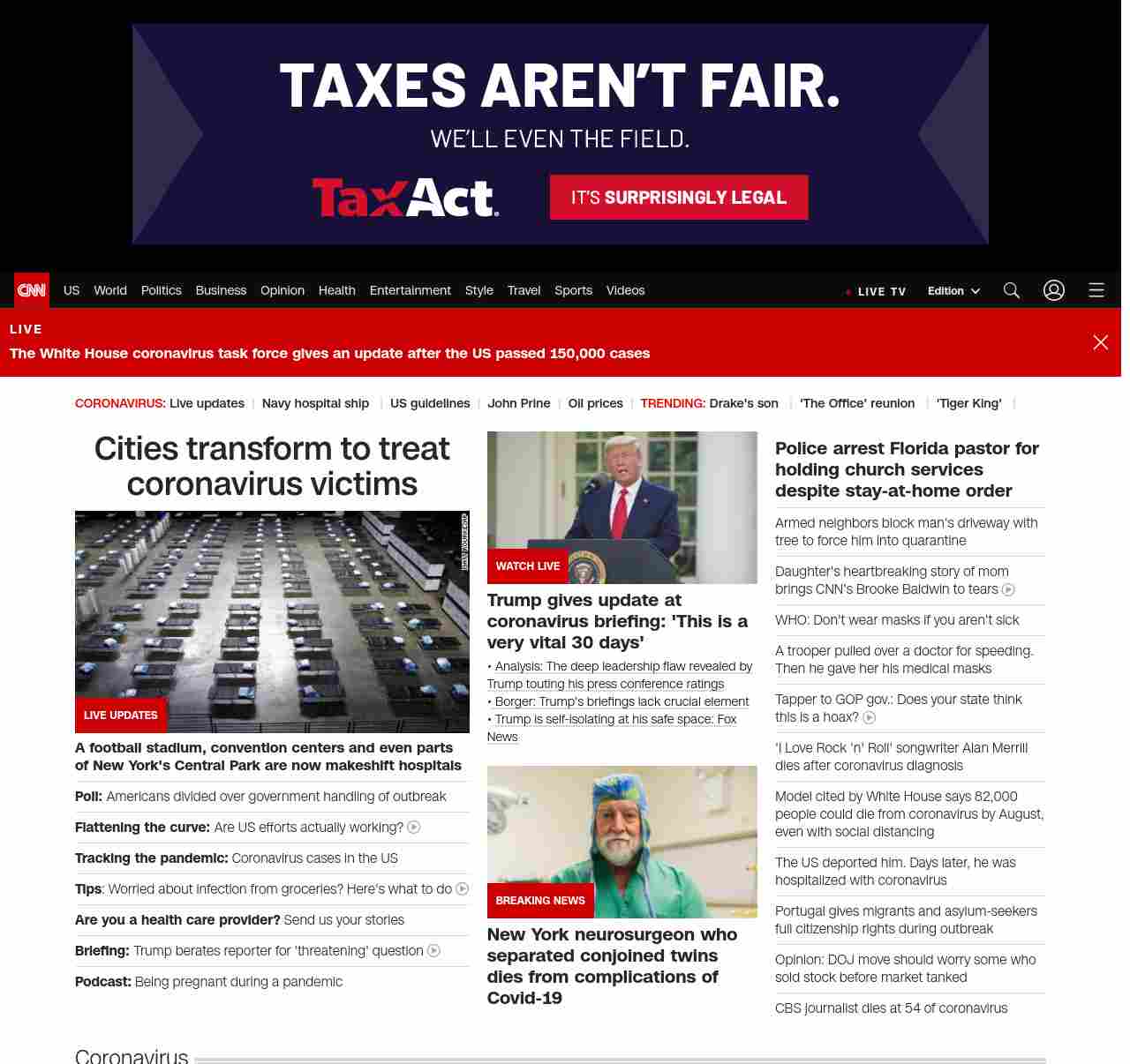 || screaming-banner-text banner-text-size–char-47″ data-analytics=”_list-hierarchical-xs_hyperlink_”> Cities transform to treat coronavirus victims ||” , title: “CNN – Breaking News, Latest News and Videos” , siblings: {“articleList”:[{“uri”:”/2020/03/30/politics/cnn-poll-americans-coronavirus-government-approval/index.html”,”headline”:”u003cstrong>Poll: u003c/strong>Americans divided over government handling of outbreak”,”thumbnail”:”//cdn.cnn.com/cnnnext/dam/assets/200330114929-usns-comfort-coronavirus-new-york-0330-small-11.jpg”,”duration”:””,”description”:”Americans are split over u003ca href=”https://www.cnn.com/2020/03/09/politics/cnn-coronavirus-poll/index.html” target=”_blank”>how the federal government is doingu003c/a> at preventing the spread of coronavirus, but an increasing number say they feel prepared to handle an infection should one happen in their family, according to u003ca href=”http://cdn.cnn.com/cnn/2020/images/03/30/rel3a.-.coronavirus.pdf” target=”_blank”>a new CNN poll conducted by SSRS.u003c/a>”,”layout”:””