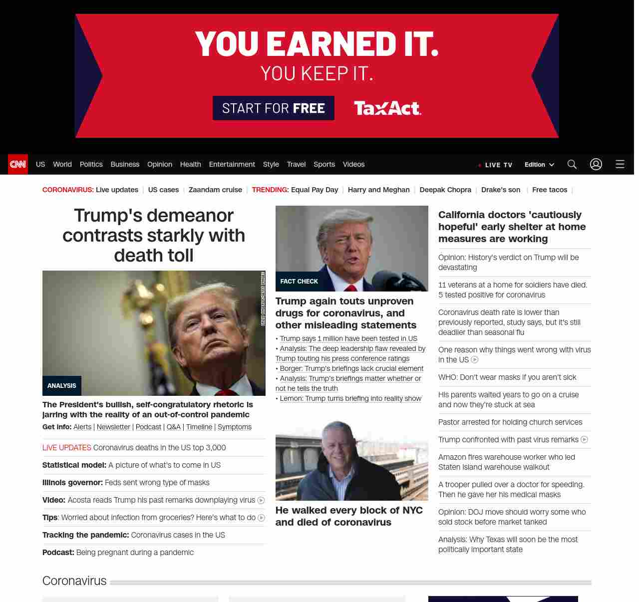|| screaming-banner-text banner-text-size–char-41″ data-analytics=”_list-hierarchical-xs_hyperlink_”> Coronavirus deaths in the US top 3,000 ||=”banner-text screaming-banner-text banner-text-size–char-47″ data-analytics=”_list-hierarchical-xs_article_”>Trump’s demeanor contrasts starkly with death toll