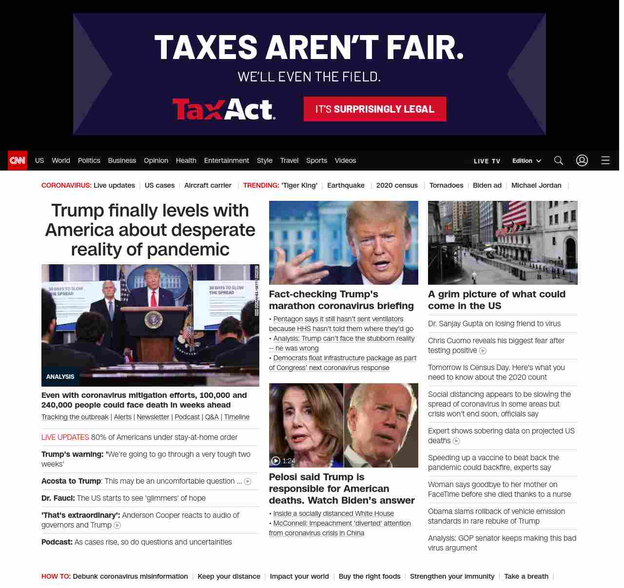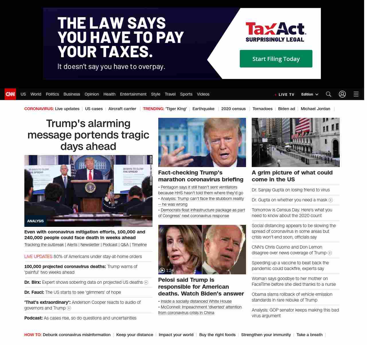 || screaming-banner-text banner-text-size–char-47″ data-analytics=”_list-hierarchical-xs_article_”> Trump’s alarming message portends tragic days ahead ||” , title: “CNN – Breaking News, Latest News and Videos” , siblings: {“articleList”:[{“uri”:”/2020/03/31/politics/trump-coronavirus/index.html”,”headline”:”u003cstrong>Even with coronavirus mitigation efforts, 100,000 and 240,000 people could face death in weeks aheadu003c/strong>”,”thumbnail”:”//cdn.cnn.com/cnnnext/dam/assets/200331180942-04-coronavirus-presser-0331-small-11.jpg”,”duration”:””,”description”:”u003ca href=”https://www.cnn.com/interactive/2020/health/coronavirus-us-maps-and-cases/” target=”_blank”>Tracking the outbreaku003c/a> | u003ca href=”https://www.cnn.com/specials/mobile-apps” target=”_blank”>Alertsu003c/a> | u003ca href=”https://www.cnn.com/specials/coronavirus-newsletter?utm_source=hp&source=hp” target=”_blank”>Newsletteru003c/a> | u003ca href=”https://www.cnn.com/audio/podcasts/corona-virus”>Podcastu003c/a> | u003ca href=”https://www.cnn.com/interactive/2020/health/coronavirus-questions-answers/” target=”_blank”>Q&Au003c/a> | u003ca href=”https://www.cnn.com/2020/02/06/health/wuhan-coronavirus-timeline-fast-facts/index.html” target=”_blank”>Timelineu003c/a> “,”layout”:””