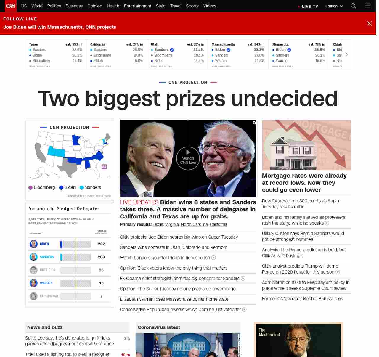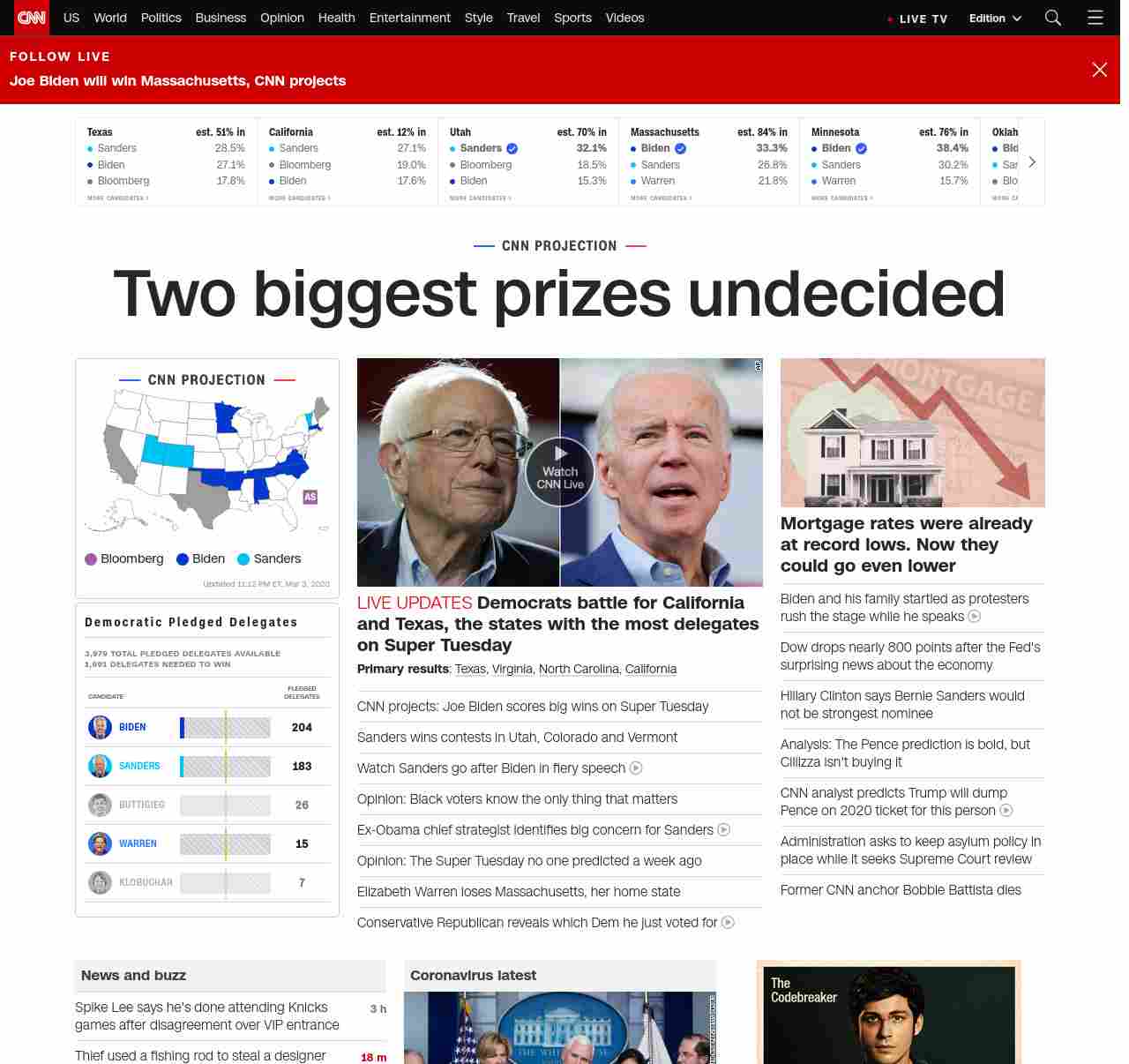 CNN3: “:”u003cstrong>Biden wins eight states and Sanders takes three. A massive number of delegates in California and Texas are up for grabs.u003c/strong>”, “BANNER=|pagerendered| ((lubuntu at wor2))