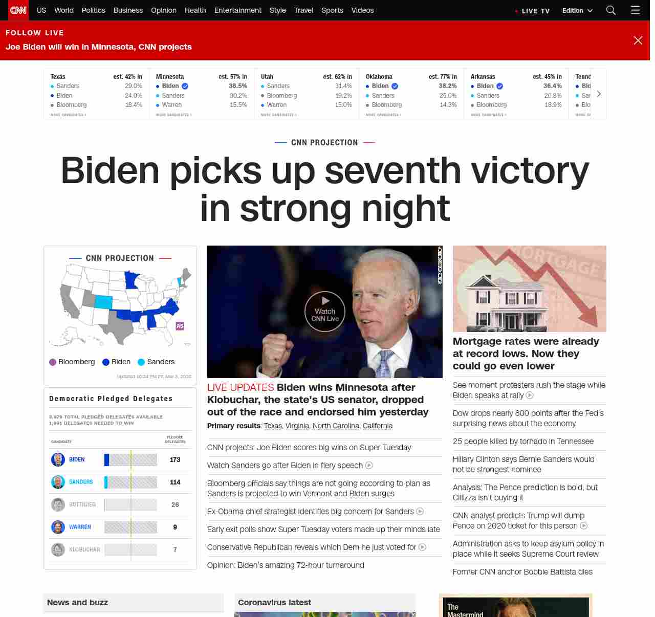 || banner-text–natural”> Biden picks up seventh victory in strong night ||” , title: “CNN – Breaking News, Latest News and Videos” , siblings: {“articleList”:[{“uri”:”/politics/live-news/super-tuesday-results-2020/index.html”,”headline”:”u003cstrong>Biden wins Minnesota after Klobuchar, the state’s US senator, dropped out of the race and endorsed him yesterdayu003c/strong>”,”thumbnail”:”//cdn.cnn.com/cnnnext/dam/assets/200303224514-05-biden-super-tuesday-0303-small-11.jpg”,”duration”:””,”description”:”u003cstrong>Primary resultsu003c/strong>: u003ca href=”http://www.cnn.com/2020/03/03/politics/texas-primary-results-live/index.html” target=”_blank”>Texasu003c/a>, u003ca href=”http://www.cnn.com/2020/03/03/politics/virginia-primary-results-live/index.html” target=”_blank”>Virginiau003c/a>, u003ca href=”https://www.cnn.com/2020/03/03/politics/north-carolina-primary-results-live/index.html” target=”_blank”>North Carolinau003c/a>, u003ca href=”http://www.cnn.com/2020/03/03/politics/california-primary-results-live/index.html” target=”_blank”>Californiau003c/a>”,”layout”:””
