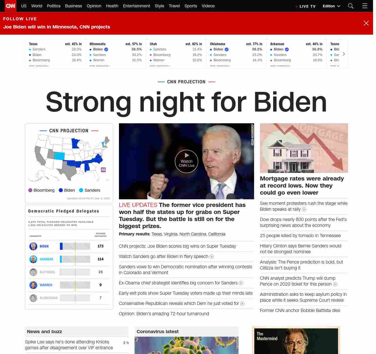 || banner-text–maximized banner-text-size–char-23″> Strong night for Biden ||” , title: “CNN – Breaking News, Latest News and Videos” , siblings: {“articleList”:[{“uri”:”/politics/live-news/super-tuesday-results-2020/index.html”,”headline”:”u003cstrong>The former vice president has won half the states up for grabs on Super Tuesday. But the battle is still on for the biggest prizes.u003c/strong>”,”thumbnail”:”//cdn.cnn.com/cnnnext/dam/assets/200303225423-07-biden-super-tuesday-0303-small-11.jpg”,”duration”:””,”description”:”u003cstrong>Primary resultsu003c/strong>: u003ca href=”http://www.cnn.com/2020/03/03/politics/texas-primary-results-live/index.html” target=”_blank”>Texasu003c/a>, u003ca href=”http://www.cnn.com/2020/03/03/politics/virginia-primary-results-live/index.html” target=”_blank”>Virginiau003c/a>, u003ca href=”https://www.cnn.com/2020/03/03/politics/north-carolina-primary-results-live/index.html” target=”_blank”>North Carolinau003c/a>, u003ca href=”http://www.cnn.com/2020/03/03/politics/california-primary-results-live/index.html” target=”_blank”>Californiau003c/a>”,”layout”:””