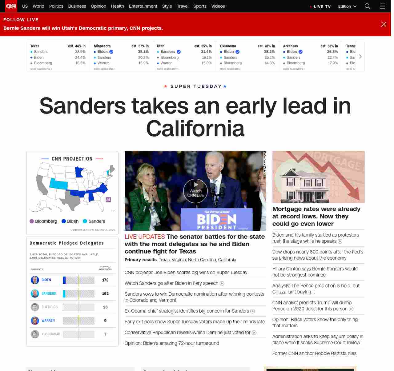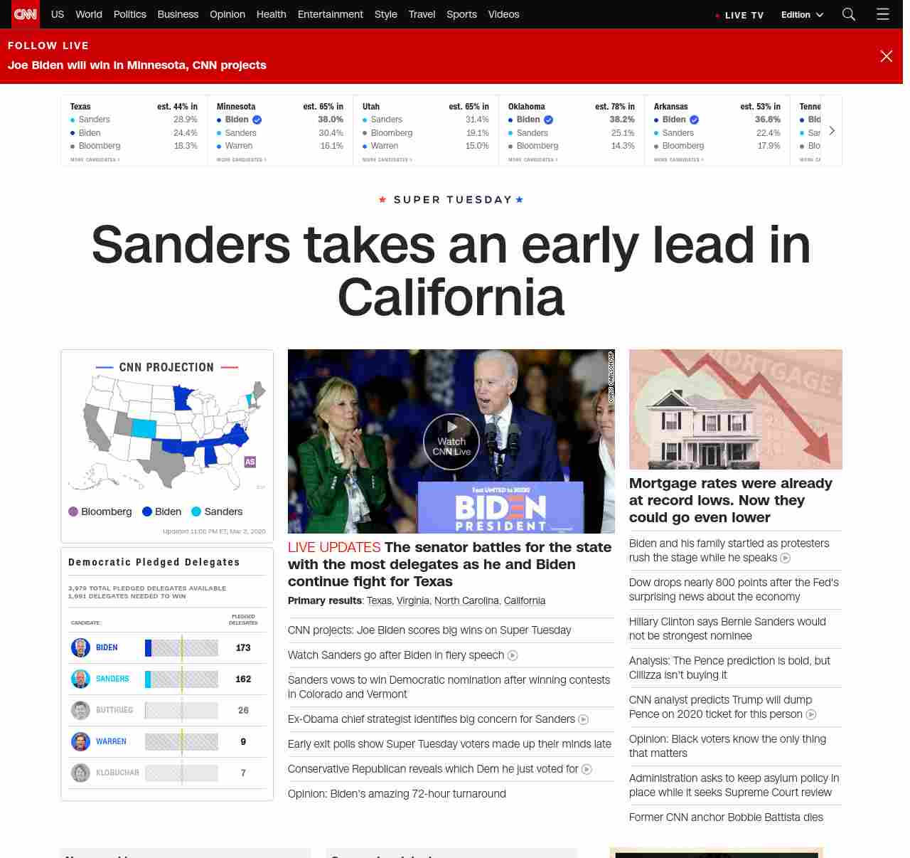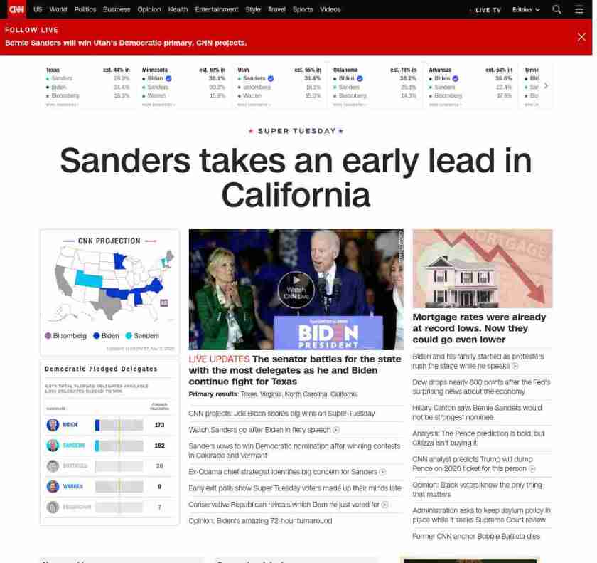 || banner-text–natural”> Sanders takes an early lead in California ||” , title: “CNN – Breaking News, Latest News and Videos” , siblings: {“articleList”:[{“uri”:”/politics/live-news/super-tuesday-results-2020/index.html”,”headline”:”u003cstrong>The senator battles for the state with the most delegates as he and Biden continue fight for Texas u003c/strong>”,”thumbnail”:”//cdn.cnn.com/cnnnext/dam/assets/200303225423-07-biden-super-tuesday-0303-small-11.jpg”,”duration”:””,”description”:”u003cstrong>Primary resultsu003c/strong>: u003ca href=”http://www.cnn.com/2020/03/03/politics/texas-primary-results-live/index.html” target=”_blank”>Texasu003c/a>, u003ca href=”http://www.cnn.com/2020/03/03/politics/virginia-primary-results-live/index.html” target=”_blank”>Virginiau003c/a>, u003ca href=”https://www.cnn.com/2020/03/03/politics/north-carolina-primary-results-live/index.html” target=”_blank”>North Carolinau003c/a>, u003ca href=”http://www.cnn.com/2020/03/03/politics/california-primary-results-live/index.html” target=”_blank”>Californiau003c/a>”,”layout”:””