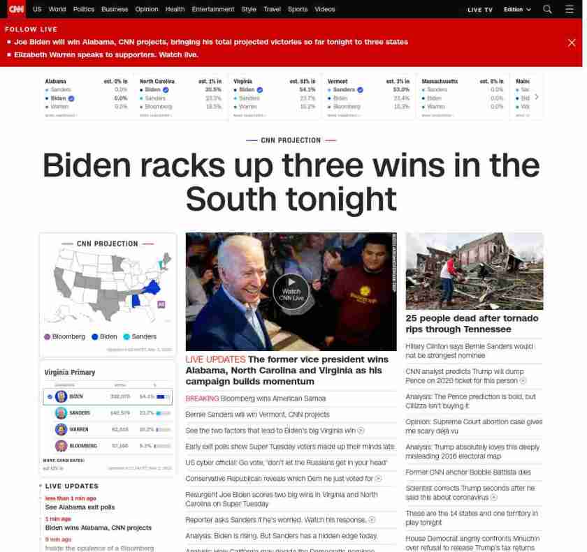 || banner-text–natural”> Biden racks up three wins in the South tonight ||” , title: “CNN – Breaking News, Latest News and Videos” , siblings: {“articleList”:[{“uri”:”/politics/live-news/super-tuesday-results-2020/index.html”,”headline”:”u003cstrong>The former vice president wins Alabama, North Carolina and Virginia as his campaign builds momentumu003c/strong>”,”thumbnail”:”//cdn.cnn.com/cnnnext/dam/assets/200303181309-02-super-tuesday-biden-0303-small-11.jpg”,”duration”:””,”description”:””,”layout”:””