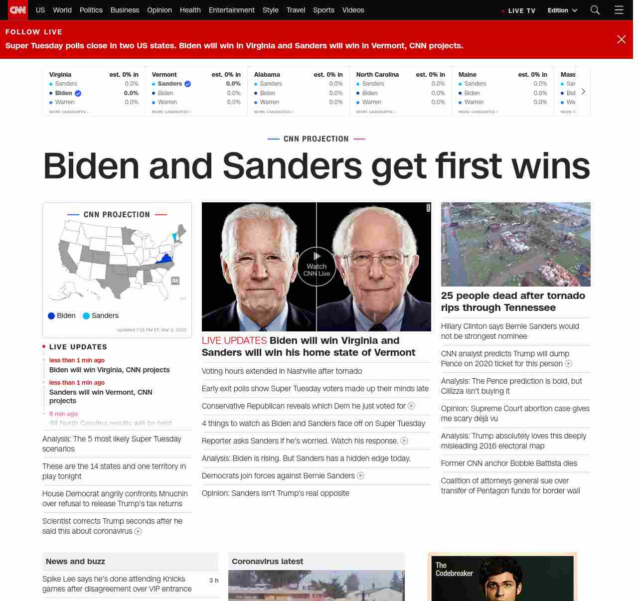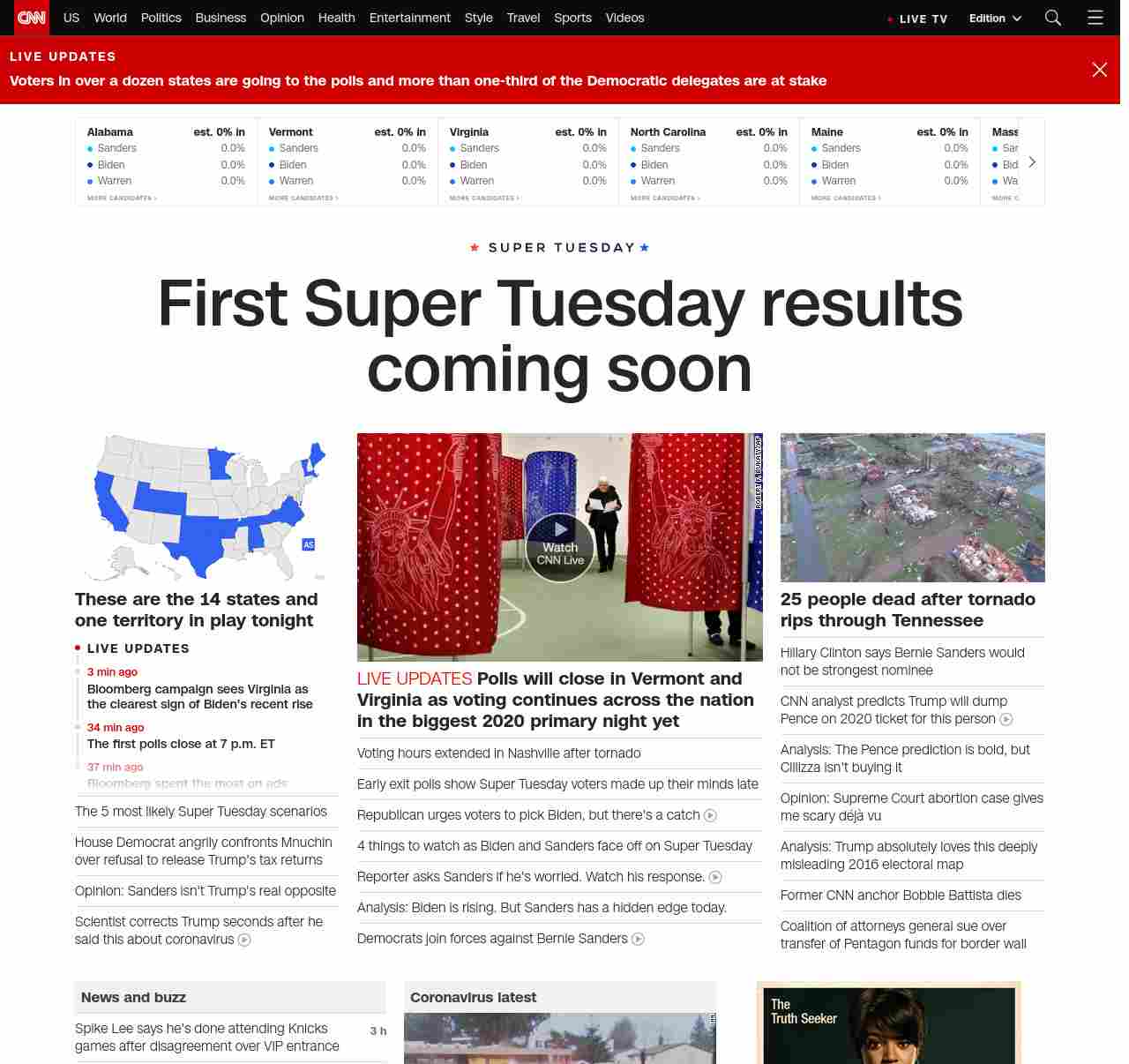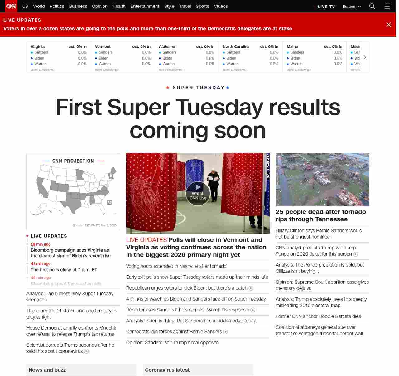 || banner-text–natural”> First Super Tuesday results coming soon ||” , title: “CNN – Breaking News, Latest News and Videos” , siblings: {“articleList”:[{“uri”:”/2020/03/03/politics/super-tuesday-bernie-sanders-joe-biden-michael-bloomberg/index.html”,”headline”:”Analysis: The 5 most likely Super Tuesday scenarios”,”thumbnail”:”//cdn.cnn.com/cnnnext/dam/assets/200302165907-biden-bloomberg-sanders-warren-split-small-11.jpg”,”duration”:””,”description”:”A third of u003cem>allu003c/em> pledged delegates in the Democratic presidential race will be doled out on Tuesday u003ca href=”https://www.cnn.com/2020/03/03/politics/super-tuesday-polls-voting/index.html” target=”_blank”>across 14 statesu003c/a> — from California to Maine — in the single biggest day of the 2020 contest.”,”layout”:””