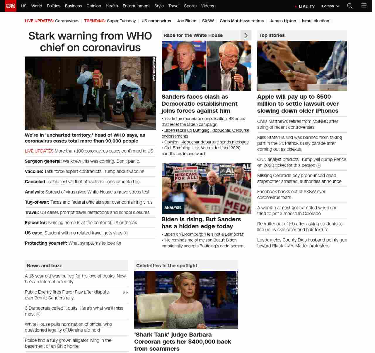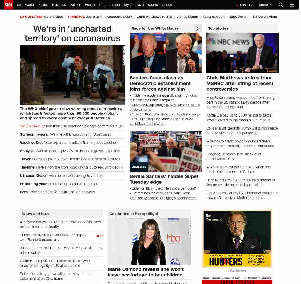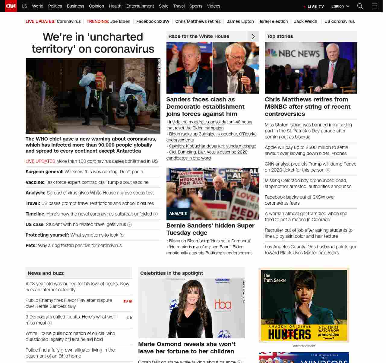 || screaming-banner-text banner-text-size–char-47″ data-analytics=”_list-hierarchical-xs_article_”> We’re in ‘uncharted territory’ on coronavirus ||” , title: “CNN – Breaking News, Latest News and Videos” , siblings: {“articleList”:[{“uri”:”/2020/03/03/asia/novel-coronavirus-covid-19-intl-hnk/index.html”,”headline”:”u003cstrong>We’re in ‘uncharted territory,’ head of WHO says, as coronavirus cases total more than 90,000 people u003c/strong>”,”thumbnail”:”//cdn.cnn.com/cnnnext/dam/assets/200302151908-06-coronavirus-0301-washington-small-11.jpg”,”duration”:””,”description”:”The head of the World Health Organization (WHO) said that public health officials are operating in “unchartered territory” as they combat the spread of the u003ca href=”https://www.cnn.com/specials/asia/coronavirus-outbreak-intl-hnk” target=”_blank”>novel coronavirusu003c/a>, which has infected more than 90,000 people u003ca href=”https://www.cnn.com/2020/01/29/asia/coronavirus-cases-worldwide-intl-hnk/index.html” target=”_blank”>across 73 countries and territoriesu003c/a> as of Monday evening.”,”layout”:””
