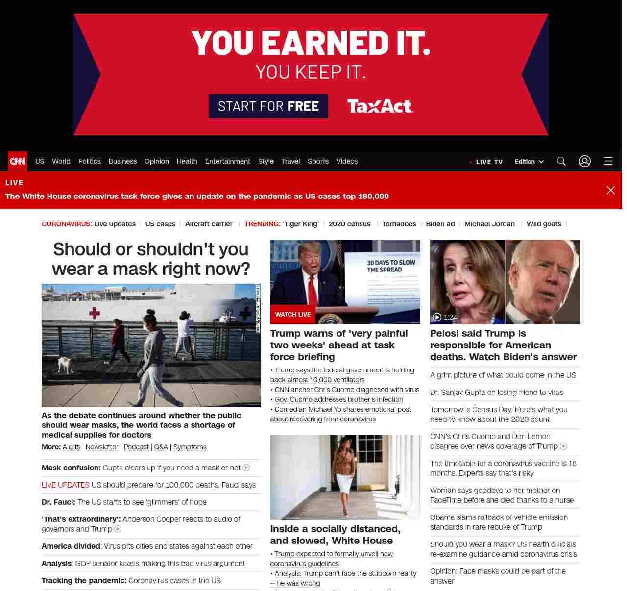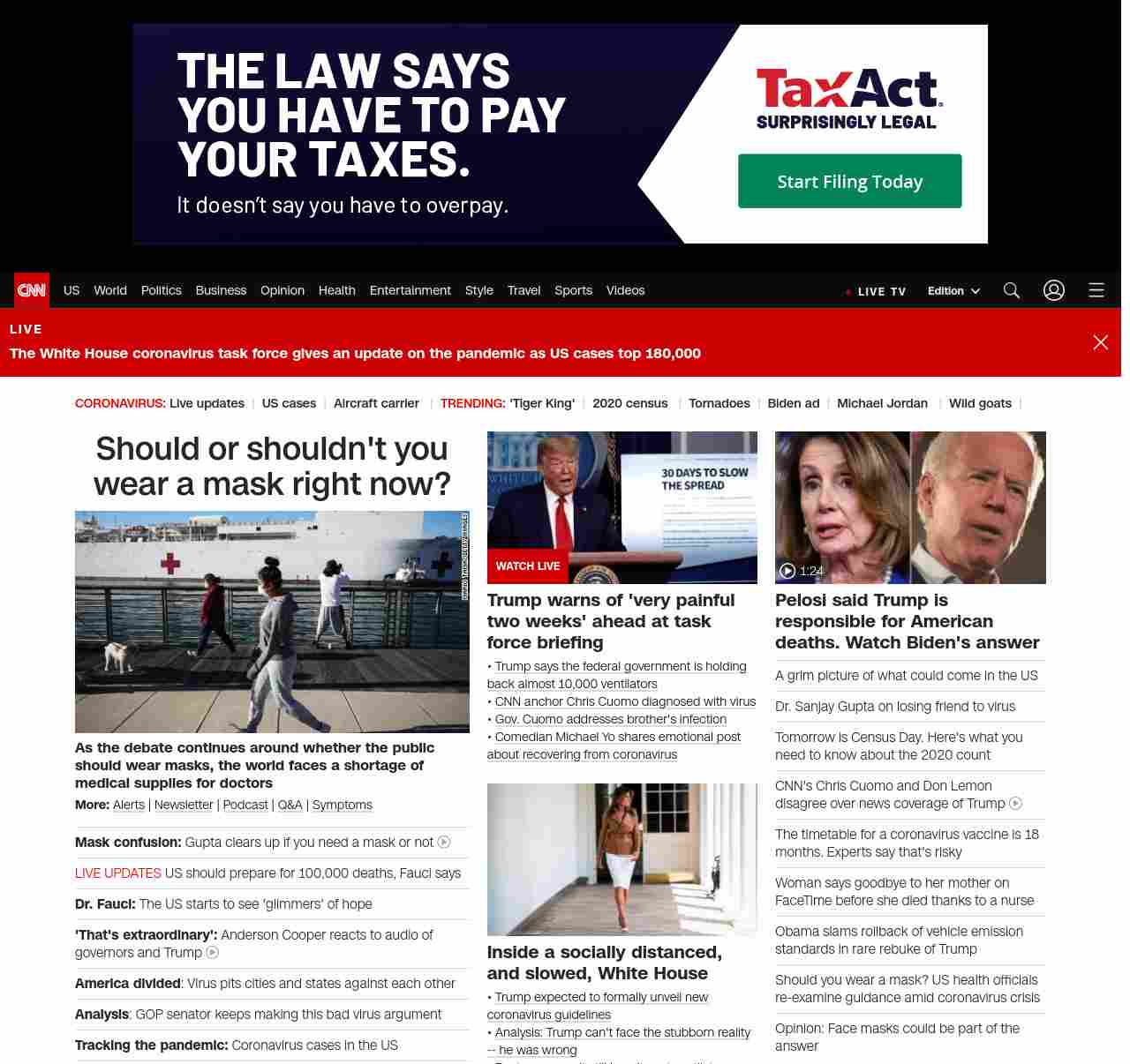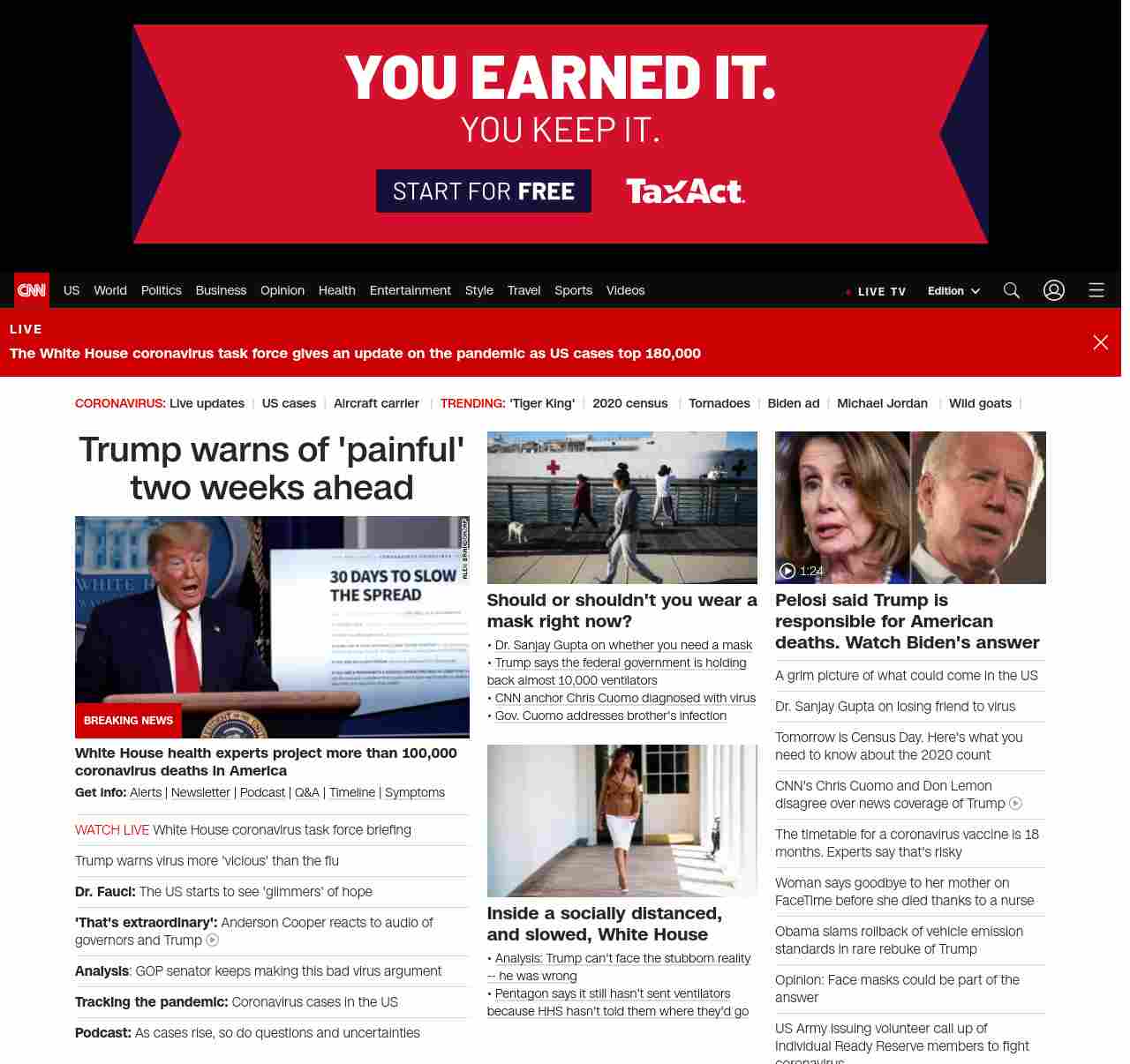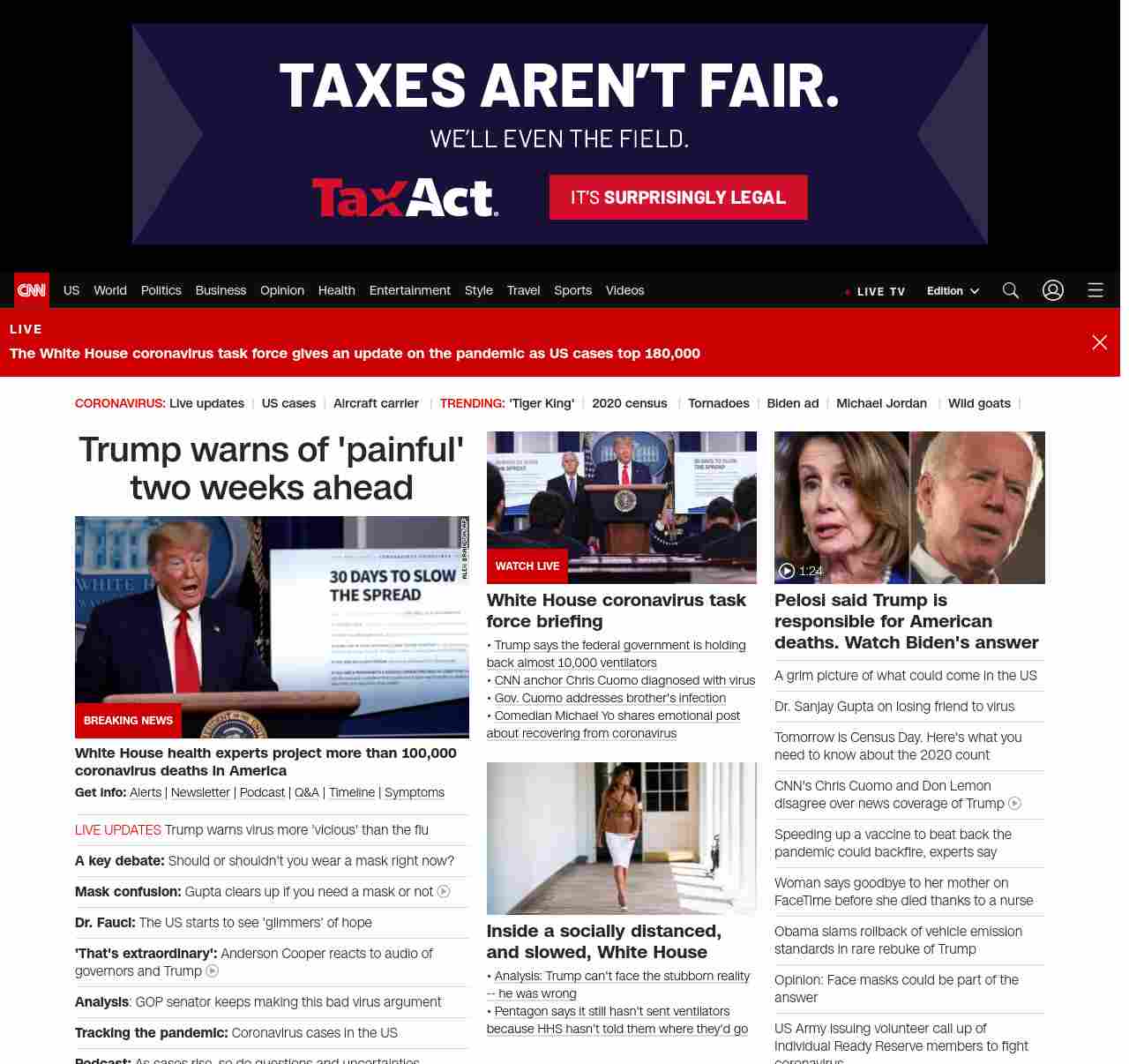 || screaming-banner-text banner-text-size–char-41″ data-analytics=”_list-hierarchical-xs_hyperlink_”> Trump warns of ‘painful’ two weeks ahead ||” , title: “CNN – Breaking News, Latest News and Videos” , siblings: {“articleList”:[{“uri”:”/2020/03/31/health/coronavirus-masks-experts-debate/index.html”,”headline”:”u003cstrong>A key debate:u003c/strong> Should or shouldn’t you wear a mask right now?”,”thumbnail”:”//cdn.cnn.com/cnnnext/dam/assets/200327141643-02-coronavirus-los-angeles-0327-small-11.jpg”,”duration”:””,”description”:”u003cstrong>More:u003c/strong> u003ca href=”https://www.cnn.com/specials/mobile-apps” target=”_blank”>Alertsu003c/a> | u003ca href=”https://www.cnn.com/specials/coronavirus-newsletter?utm_source=hp&source=hp” target=”_blank”>Newsletteru003c/a> | u003ca href=”https://www.cnn.com/audio/podcasts/corona-virus”>Podcastu003c/a> | u003ca href=”https://www.cnn.com/interactive/2020/health/coronavirus-questions-answers/” target=”_blank”>Q&Au003c/a> | u003ca href=”https://www.cnn.com/2020/03/31/health/coronavirus-symptoms-list-what-to-do-wellness/index.html” target=”_blank”>Symptomsu003c/a>”,”layout”:””