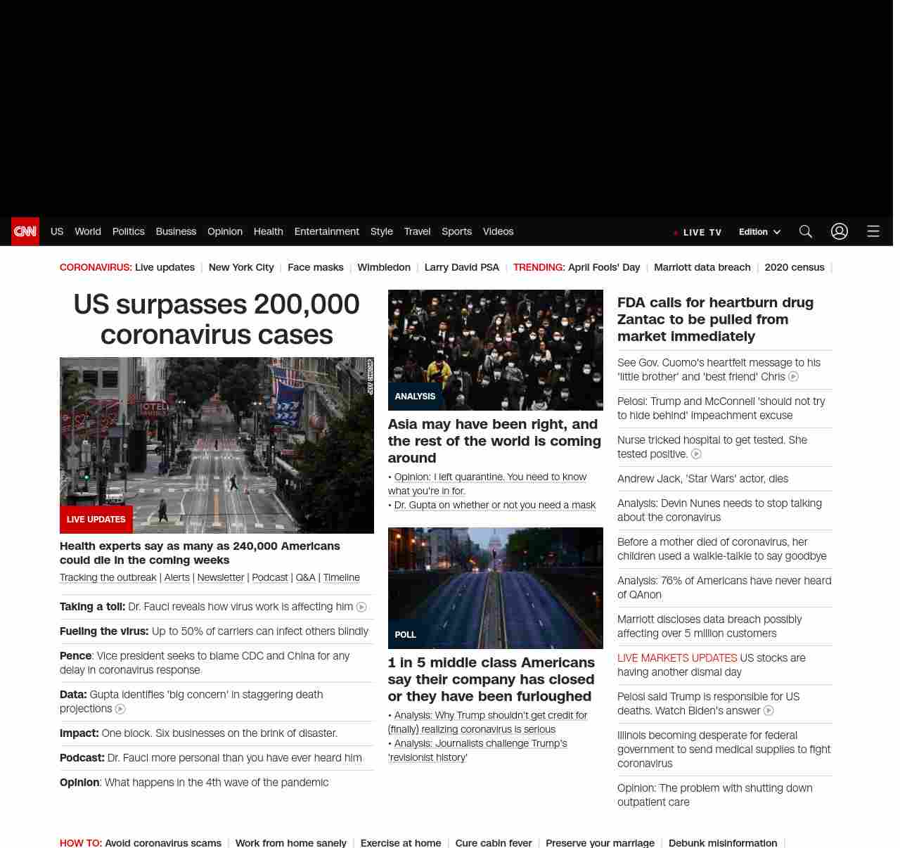 || screaming-banner-text banner-text-size–char-41″ data-analytics=”_list-hierarchical-xs_hyperlink_”> US surpasses 200,000 coronavirus cases ||” , title: “CNN – Breaking News, Latest News and Videos” , siblings: {“articleList”:[{“uri”:”/videos/health/2020/04/01/anthony-fauci-health-coronavirus-pandemic-cooper-vpx.cnn”,”headline”:”u003cstrong>Taking a toll:u003c/strong>Â Dr. Fauci reveals how virus work is affecting him”,”thumbnail”:”//cdn.cnn.com/cnnnext/dam/assets/200331124419-02-fauci-0327-small-11.jpg”,”duration”:”01:22″,”description”:”Dr. Anthony Fauci opens up to Dr. u003ca href=”/profiles/sanjay-gupta-profile” target=”_blank”>Sanjay Guptau003c/a> on CNN’s podcast about how he’s coping with his personal health while juggling daily demands. “,”layout”:””,”iconType”:”video”