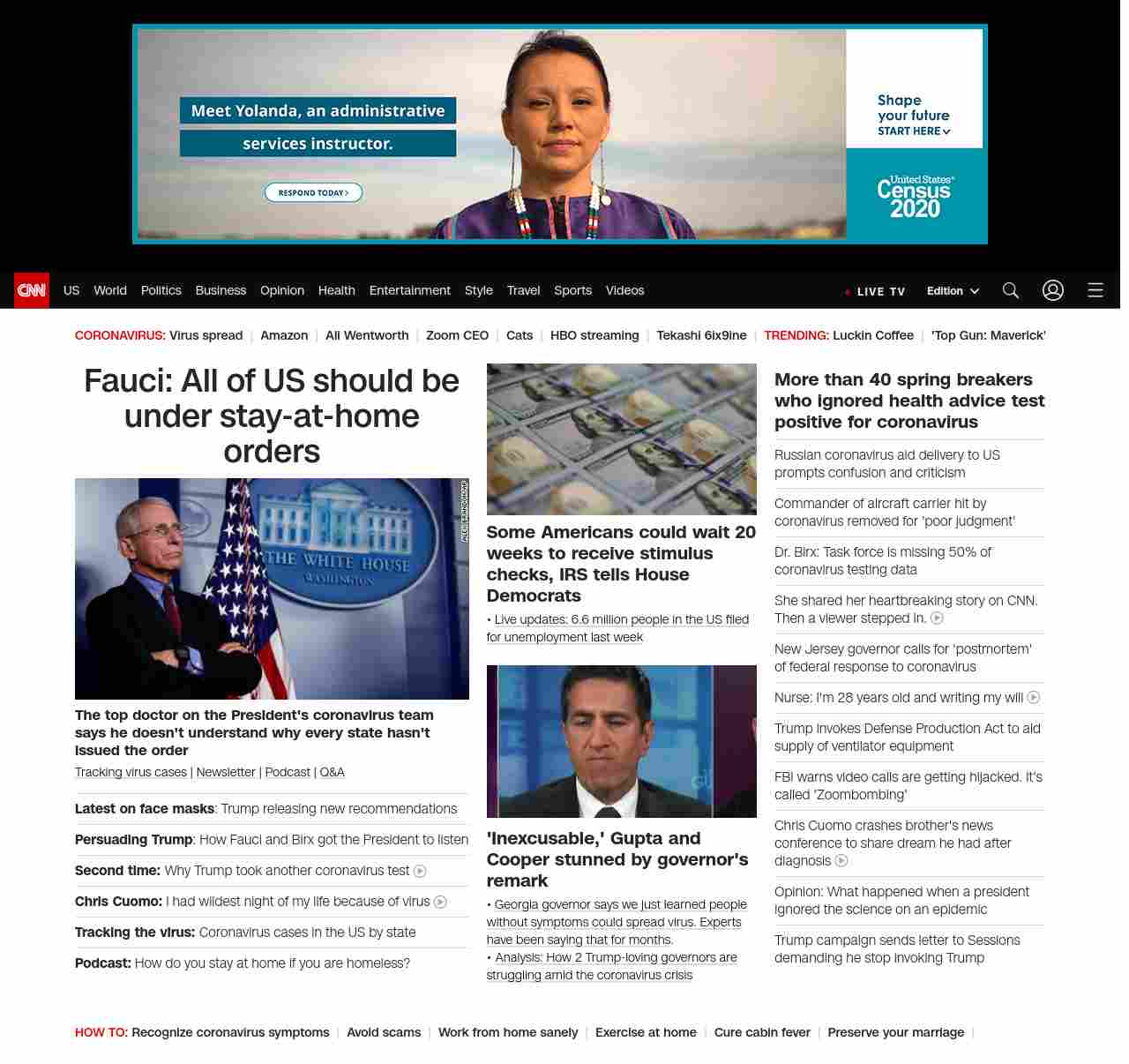 || screaming-banner-text banner-text-size–char-47″ data-analytics=”_list-hierarchical-xs_story_”> Fauci: All of US should be under stay-at-home orders ||” , title: “CNN – Breaking News, Latest News and Videos” , siblings: {“articleList”:[{“uri”:”/2020/04/02/politics/fauci-stay-home-coronavirus-states-cnntv/index.html”,”headline”:”u003cstrong>The top doctor on the President’s coronavirus team says he doesn’t understand why’ every state hasn’t issued the orderu003c/strong>”,”thumbnail”:”//cdn.cnn.com/cnnnext/dam/assets/200331124419-02-fauci-0327-small-11.jpg”,”duration”:””,”description”:”u003ca href=”https://www.cnn.com/interactive/2020/health/coronavirus-us-maps-and-cases/” target=”_blank”>Tracking virus casesu003c/a> | u003ca href=”https://www.cnn.com/specials/coronavirus-newsletter?utm_source=hp&source=hp” target=”_blank”>Newsletteru003c/a> | u003ca href=”https://www.cnn.com/audio/podcasts/corona-virus”>Podcastu003c/a> | u003ca href=”https://www.cnn.com/interactive/2020/health/coronavirus-questions-answers/” target=”_blank”>Q&Au003c/a>”,”layout”:””