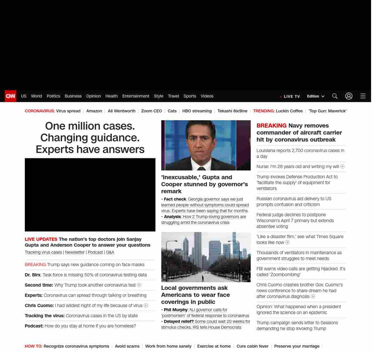 || screaming-banner-text banner-text-size–char-47″ data-analytics=”_list-hierarchical-xs_story_”> One million cases. Changing guidance. Experts have answers ||” , title: “CNN – Breaking News, Latest News and Videos” , siblings: {“articleList”:[{“uri”:”/world/live-news/coronavirus-pandemic-04-02-20-intl/index.html”,”headline”:”u003cstrong>The nation’s top doctors join Sanjay Gupta and Anderson Cooper to answer your questionsu003c/strong>”,”thumbnail”:”//cdn.cnn.com/cnnnext/dam/assets/200402200635-01-coronavirus-town-hall-0402-split-small-11.jpg”,”duration”:””,”description”:”u003ca href=”https://www.cnn.com/interactive/2020/health/coronavirus-us-maps-and-cases/” target=”_blank”>Tracking virus casesu003c/a> | u003ca href=”https://www.cnn.com/specials/coronavirus-newsletter?utm_source=hp&source=hp” target=”_blank”>Newsletteru003c/a> | u003ca href=”https://www.cnn.com/audio/podcasts/corona-virus”>Podcastu003c/a> | u003ca href=”https://www.cnn.com/interactive/2020/health/coronavirus-questions-answers/” target=”_blank”>Q&Au003c/a>”,”layout”:””