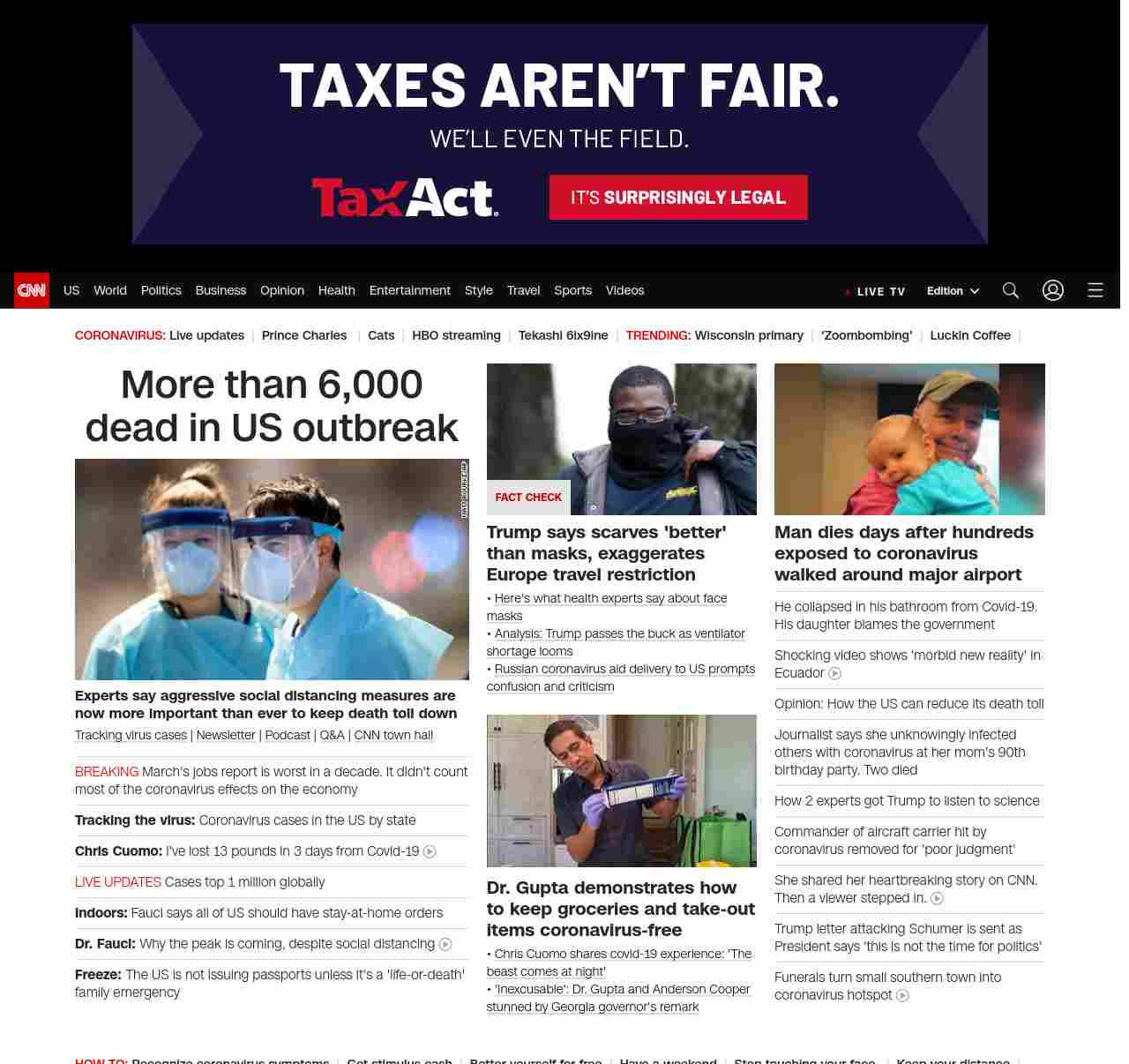 || screaming-banner-text banner-text-size–char-38″ data-analytics=”_list-hierarchical-xs_article_”> More than 6,000 dead in US outbreak ||” , title: “CNN – Breaking News, Latest News and Videos” , siblings: {“articleList”:[{“uri”:”/2020/04/03/health/us-coronavirus-friday/index.html”,”headline”:”u003cstrong>Experts say aggressive social distancing measures are now more important than ever to keep death toll downu003c/strong>”,”thumbnail”:”//cdn.cnn.com/cnnnext/dam/assets/200403033822-coronavirus-masks-0401-small-11.jpg”,”duration”:””,”description”:”u003ca href=”https://www.cnn.com/interactive/2020/health/coronavirus-us-maps-and-cases/” target=”_blank”>Tracking virus casesu003c/a> | u003ca href=”https://www.cnn.com/specials/coronavirus-newsletter?utm_source=hp&source=hp” target=”_blank”>Newsletteru003c/a> | u003ca href=”https://www.cnn.com/audio/podcasts/corona-virus”>Podcastu003c/a> | u003ca href=”https://www.cnn.com/interactive/2020/health/coronavirus-questions-answers/” target=”_blank”>Q&Au003c/a> | u003ca href=”https://www.cnn.com/2020/04/02/app-news-section/full-coronavirus-town-hall-april-2-2020-app/index.html” target=”_blank”>CNN town hallu003c/a>”,”layout”:””