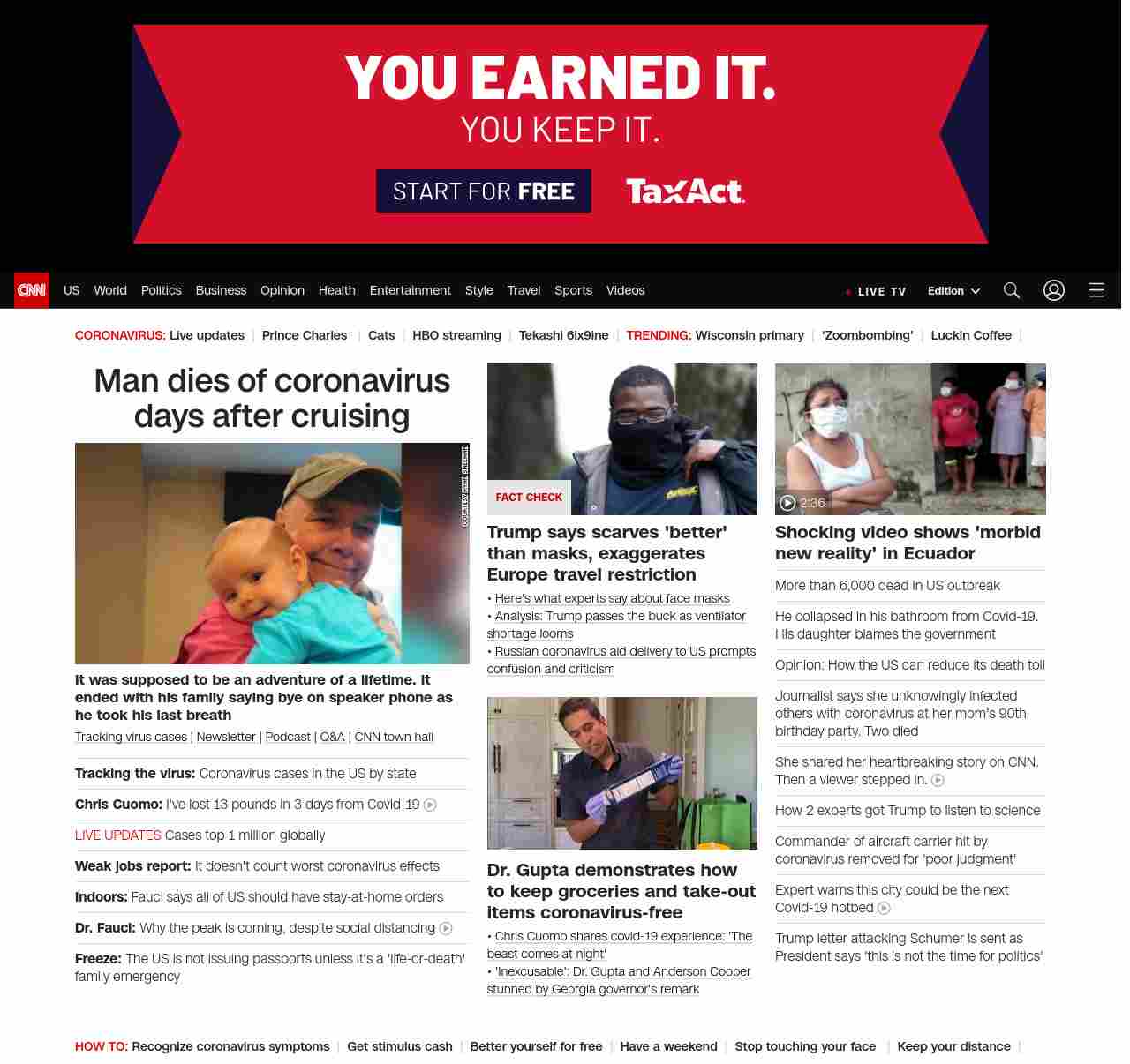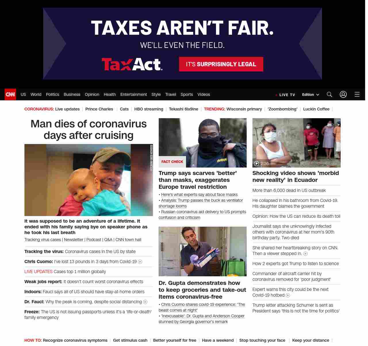 || screaming-banner-text banner-text-size–char-38″ data-analytics=”_list-hierarchical-xs_article_”> More than 6,000 dead in US outbreak ||” , title: “CNN – Breaking News, Latest News and Videos” , siblings: {“articleList”:[{“uri”:”/2020/04/03/us/costa-luminosa-passengers-ordeal/index.html”,”headline”:”u003cstrong>It was supposed to be an adventure of a lifetime. It ended with his family saying bye on speaker phone as he took his last breathu003c/strong>”,”thumbnail”:”//cdn.cnn.com/cnnnext/dam/assets/200330131533-tom-sheehan-coronavirus-victim-small-11.jpg”,”duration”:””,”description”:”u003ca href=”https://www.cnn.com/interactive/2020/health/coronavirus-us-maps-and-cases/” target=”_blank”>Tracking virus casesu003c/a> | u003ca href=”https://www.cnn.com/specials/coronavirus-newsletter?utm_source=hp&source=hp” target=”_blank”>Newsletteru003c/a> | u003ca href=”https://www.cnn.com/audio/podcasts/corona-virus”>Podcastu003c/a> | u003ca href=”https://www.cnn.com/interactive/2020/health/coronavirus-questions-answers/” target=”_blank”>Q&Au003c/a> | u003ca href=”https://www.cnn.com/2020/04/02/app-news-section/full-coronavirus-town-hall-april-2-2020-app/index.html” target=”_blank”>CNN town hallu003c/a>”,”layout”:””