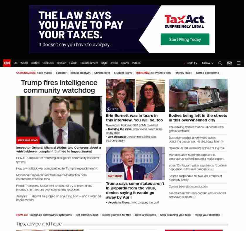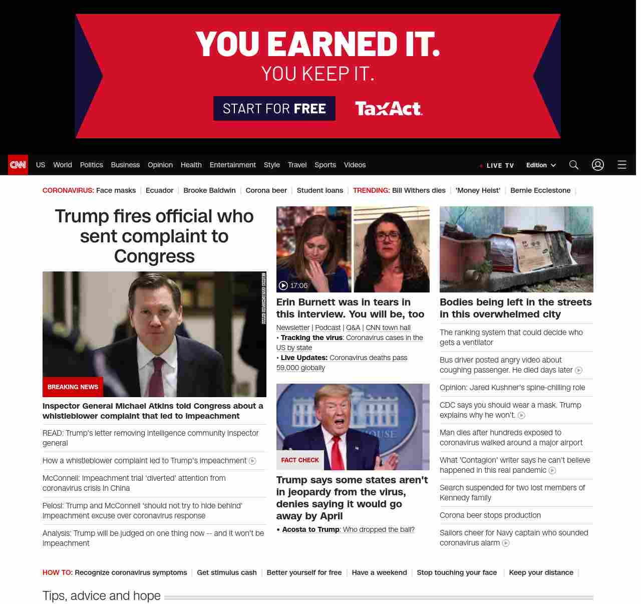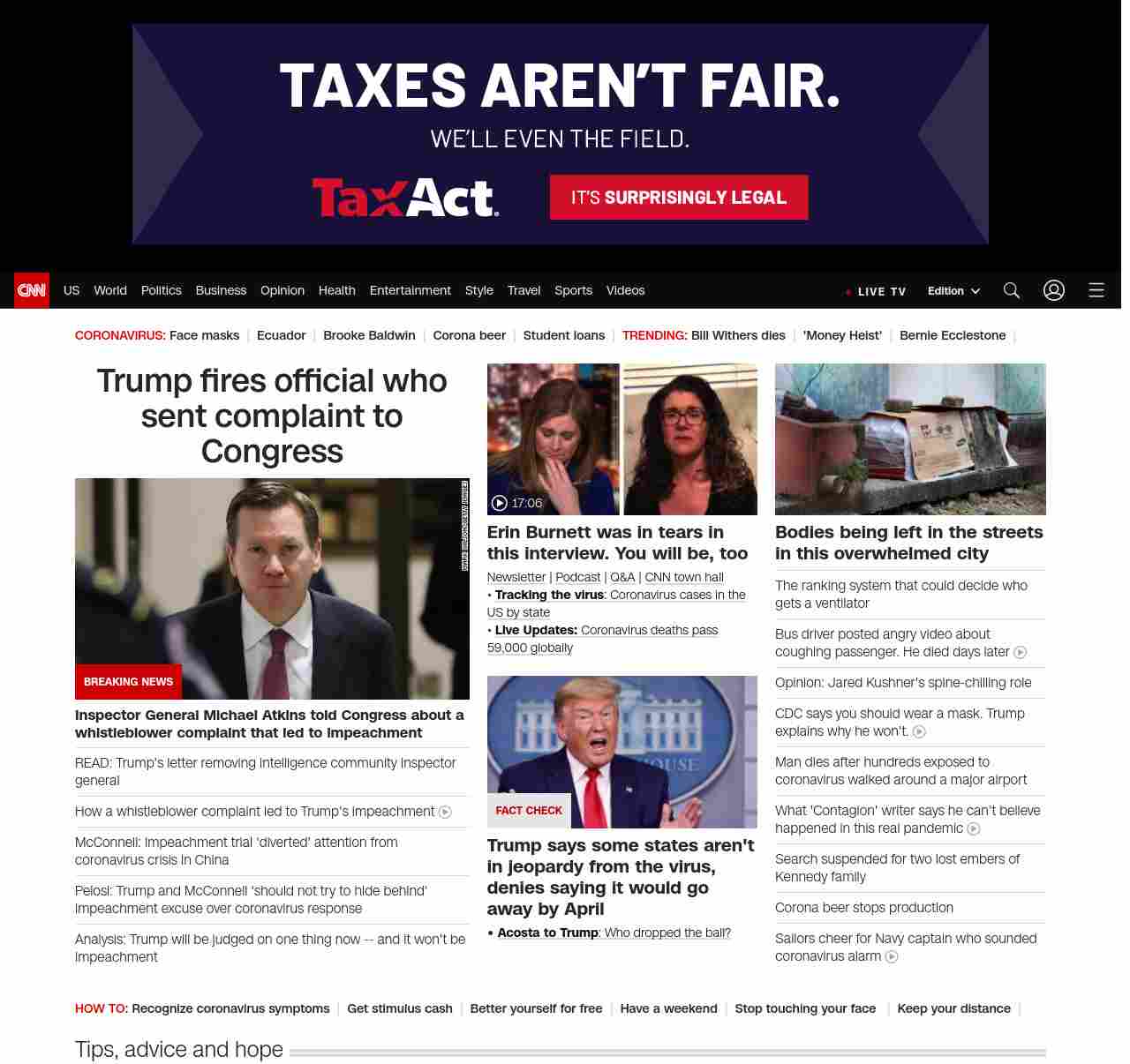 || screaming-banner-text banner-text-size–char-44″ data-analytics=”_list-hierarchical-xs_article_”> Trump fires official who sent complaint to Congress ||” , title: “CNN – Breaking News, Latest News and Videos” , siblings: {“articleList”:[{“uri”:”/2020/04/03/politics/trump-fires-inspector-general-michael-atkinson/index.html”,”headline”:”u003cstrong>Inspector General Michael Atkins told Congress about a whistleblower complaint that led to impeachmentu003c/strong>”,”thumbnail”:”//cdn.cnn.com/cnnnext/dam/assets/191112163149-02-michael-atkinson-file-small-11.jpg”,”duration”:””,”description”:”President Donald Trump on Friday removed u003ca href=”https://www.cnn.com/2019/09/23/politics/ic-ig-michael-atkinson-whistleblower-complaint/index.html” target=”_blank”>Intelligence Community Inspector General Michael Atkinsonu003c/a> — who had told Congress u003ca href=”https://www.cnn.com/2019/10/04/politics/michael-atkinson-house-intelligence-hearing-impeachment/index.html” target=”_blank”>about the whistleblower complaint u003c/a>that led to Trump’s impeachment — from his post, the President told Congress in a letter obtained by CNN.”,”layout”:””