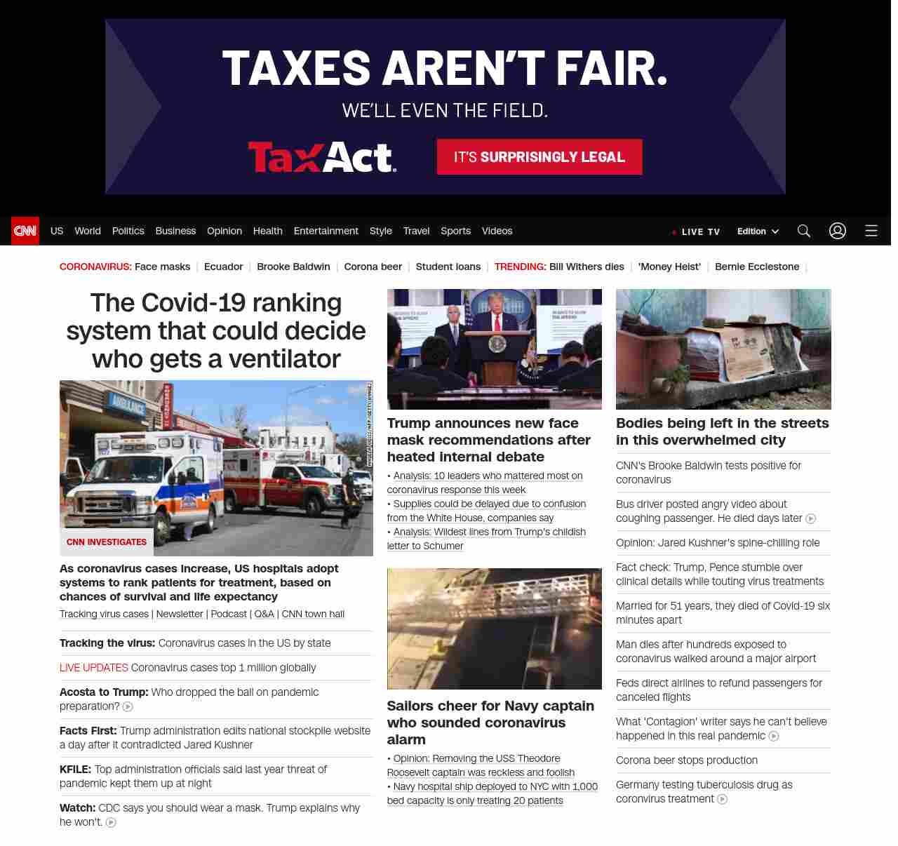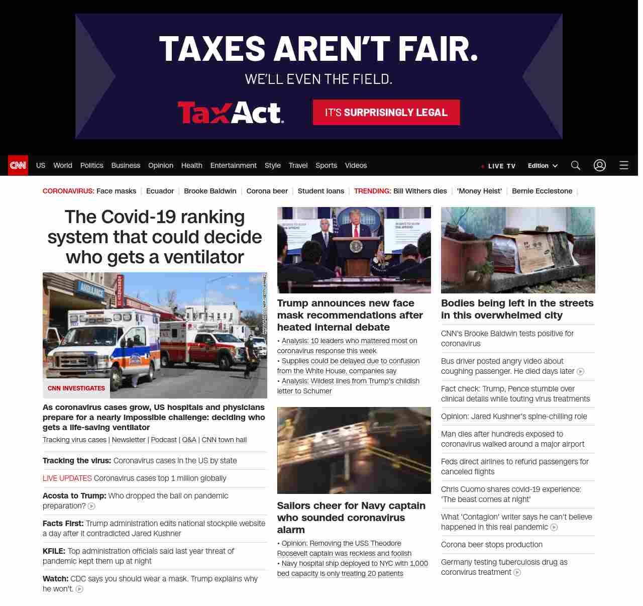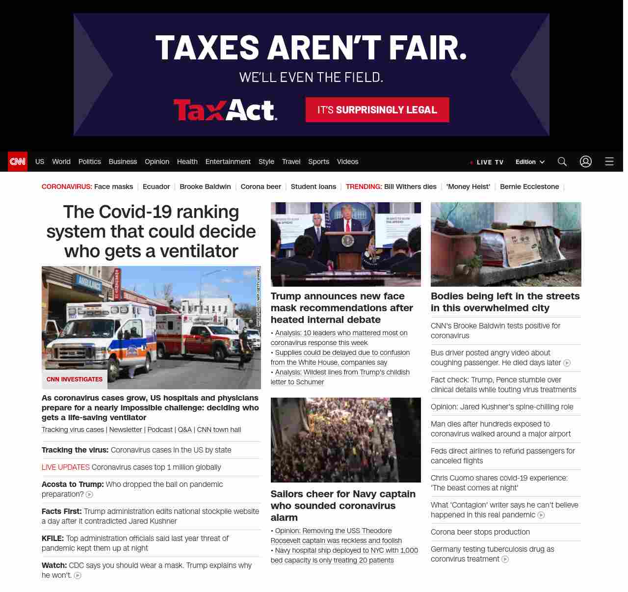 || screaming-banner-text banner-text-size–char-47″ data-analytics=”_list-hierarchical-xs_article_”> Trump announces new face mask recommendations ||” , title: “CNN – Breaking News, Latest News and Videos” , siblings: {“articleList”:[{“uri”:”/2020/04/03/health/coronavirus-hospital-ethics-ventilators-invs/index.html”,”headline”:”u003cstrong>As coronavirus cases grow, US hospitals and physicians prepare for a nearly impossible challenge: deciding who gets a life-saving ventilator u003c/strong>”,”thumbnail”:”//cdn.cnn.com/cnnnext/dam/assets/200403005446-new-york-hospital-cardiac-arrest-patients-memo-small-11.jpg”,”duration”:””,”description”:”u003ca href=”https://www.cnn.com/interactive/2020/health/coronavirus-maps-and-cases/” target=”_blank”>Tracking virus casesu003c/a> | u003ca href=”https://www.cnn.com/specials/coronavirus-newsletter?utm_source=hp&source=hp” target=”_blank”>Newsletteru003c/a> | u003ca href=”https://www.cnn.com/audio/podcasts/corona-virus”>Podcastu003c/a> | u003ca href=”https://www.cnn.com/interactive/2020/health/coronavirus-questions-answers/” target=”_blank”>Q&Au003c/a> | u003ca href=”https://www.cnn.com/2020/04/02/app-news-section/full-coronavirus-town-hall-april-2-2020-app/index.html” target=”_blank”>CNN town hallu003c/a>”,”layout”:””
