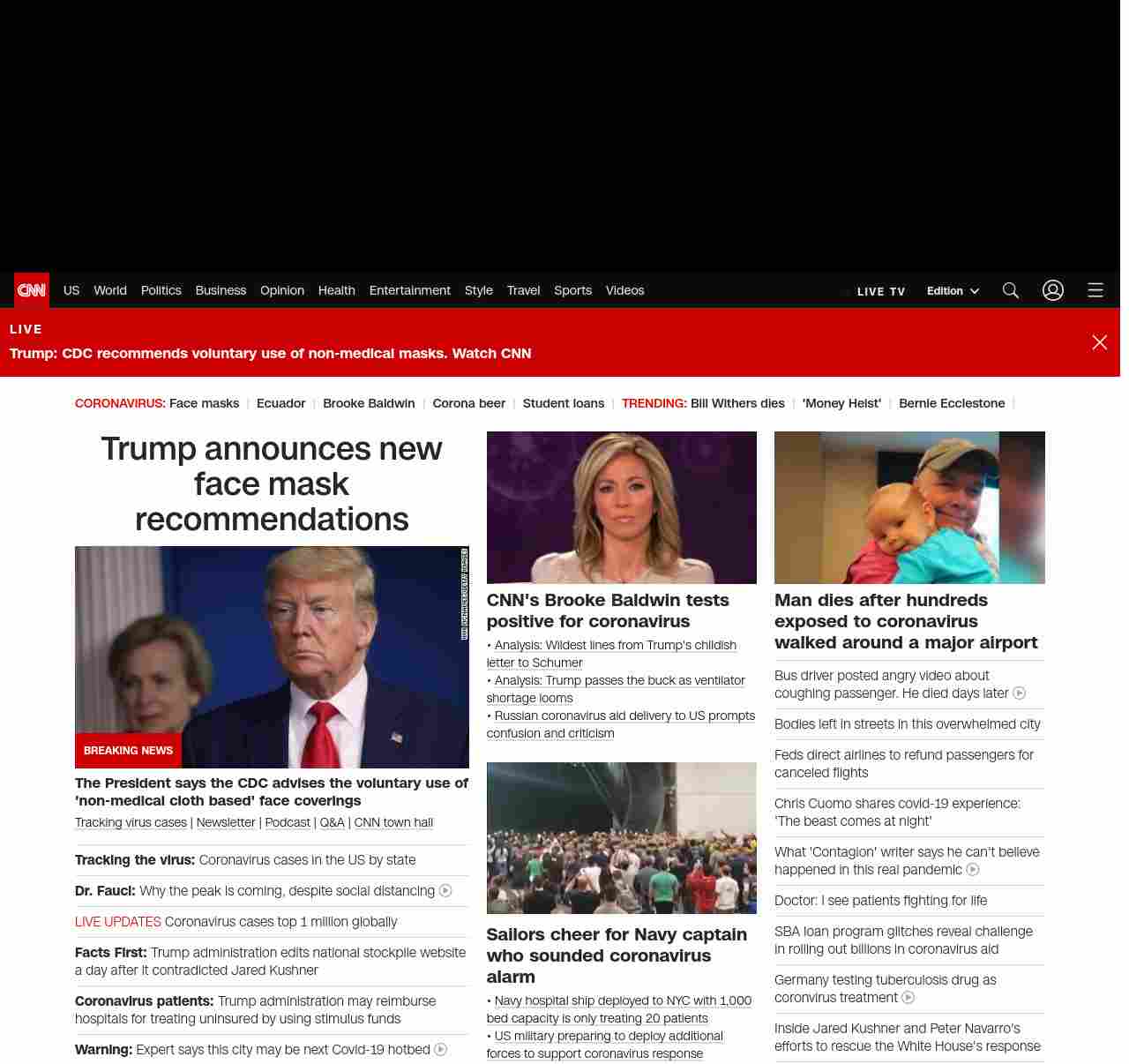 || screaming-banner-text banner-text-size–char-38″ data-analytics=”_list-hierarchical-xs_article_”> Trump announces new face mask recommendations ||” , title: “CNN – Breaking News, Latest News and Videos” , siblings: {“articleList”:[{“uri”:”/2020/04/03/politics/trump-white-house-face-masks/index.html”,”headline”:”u003cstrong>The President says the CDC advises the voluntary use of ‘non-medical cloth based’ face coveringsu003c/strong>”,”thumbnail”:”//cdn.cnn.com/cnnnext/dam/assets/200403175217-01-trump-coronavirus-presser-0403-small-11.jpg”,”duration”:””,”description”:”u003ca href=”https://www.cnn.com/interactive/2020/health/coronavirus-maps-and-cases/” target=”_blank”>Tracking virus casesu003c/a> | u003ca href=”https://www.cnn.com/specials/coronavirus-newsletter?utm_source=hp&source=hp” target=”_blank”>Newsletteru003c/a> | u003ca href=”https://www.cnn.com/audio/podcasts/corona-virus”>Podcastu003c/a> | u003ca href=”https://www.cnn.com/interactive/2020/health/coronavirus-questions-answers/” target=”_blank”>Q&Au003c/a> | u003ca href=”https://www.cnn.com/2020/04/02/app-news-section/full-coronavirus-town-hall-april-2-2020-app/index.html” target=”_blank”>CNN town hallu003c/a>”,”layout”:””
