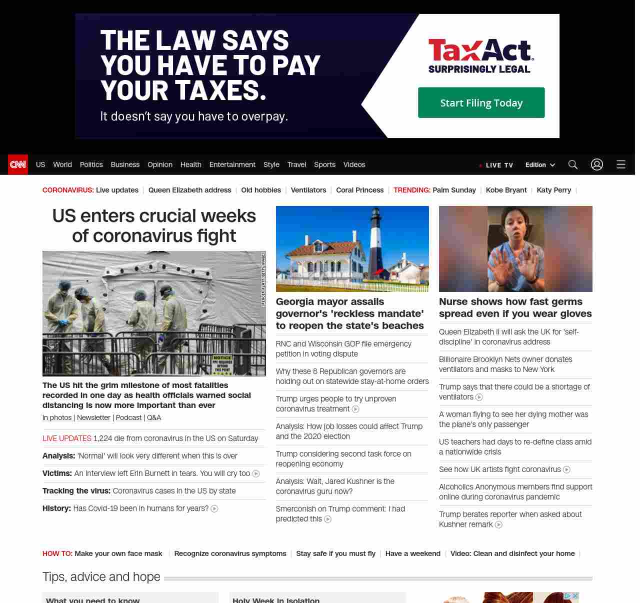 || screaming-banner-text banner-text-size–char-47″ data-analytics=”_list-hierarchical-xs_article_”> US enters crucial weeks of coronavirus fight ||” , title: “CNN – Breaking News, Latest News and Videos” , siblings: {“articleList”:[{“uri”:”/2020/04/05/health/us-coronavirus-sunday/index.html”,”headline”:”u003cstrong>The US hit the grim milestone of most fatalities recorded in one day as health officials warned social distancing is now more important than everu003c/strong>”,”thumbnail”:”//cdn.cnn.com/cnnnext/dam/assets/200405013851-02-coronavirus-0404-new-york-small-11.jpg”,”duration”:””,”description”:”u003ca href=”https://www.cnn.com/2020/03/19/world/gallery/novel-coronavirus-outbreak/index.html” target=”_blank”>In photos u003c/a>| u003ca href=”https://www.cnn.com/specials/coronavirus-newsletter?utm_source=hp&source=hp” target=”_blank”>Newsletteru003c/a> | u003ca href=”https://www.cnn.com/audio/podcasts/corona-virus”>Podcastu003c/a> | u003ca href=”https://www.cnn.com/interactive/2020/health/coronavirus-questions-answers/” target=”_blank”>Q&Au003c/a>”,”layout”:””
