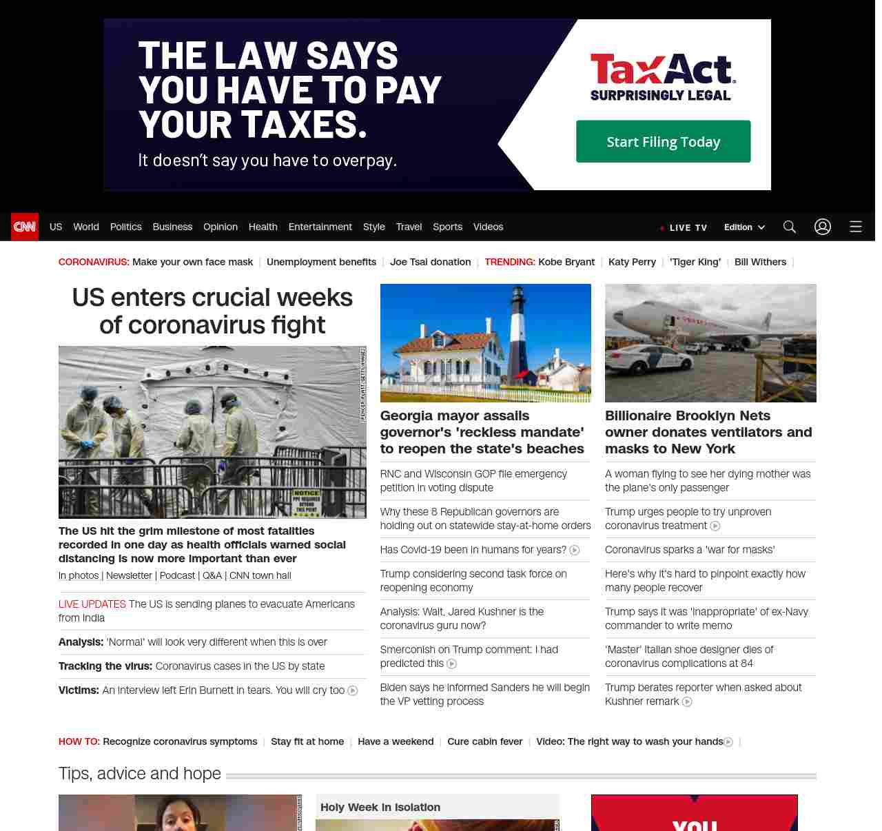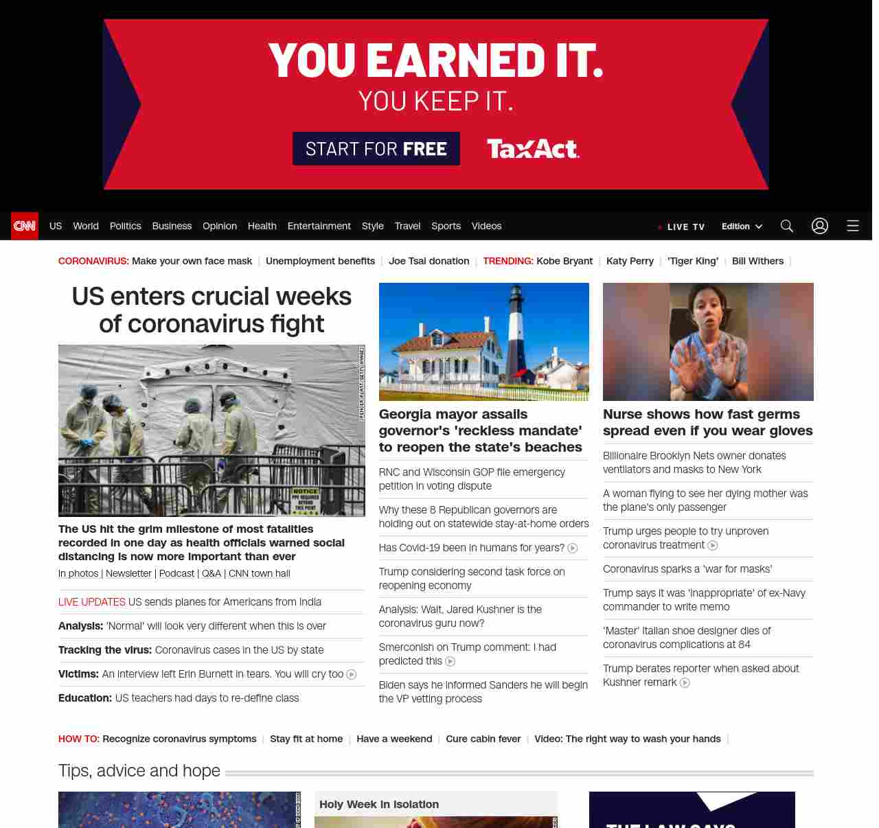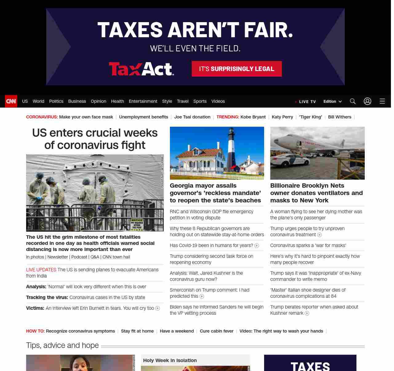 || screaming-banner-text banner-text-size–char-47″ data-analytics=”_list-hierarchical-xs_article_”> US enters crucial weeks of coronavirus fight ||” , title: “CNN – Breaking News, Latest News and Videos” , siblings: {“articleList”:[{“uri”:”/2020/04/05/health/us-coronavirus-sunday/index.html”,”headline”:”u003cstrong>The US hit the grim milestone of most fatalities recorded in one day as health officials warned social distancing is now more important than everu003c/strong>”,”thumbnail”:”//cdn.cnn.com/cnnnext/dam/assets/200405013851-02-coronavirus-0404-new-york-small-11.jpg”,”duration”:””,”description”:”u003ca href=”https://www.cnn.com/2020/03/19/world/gallery/novel-coronavirus-outbreak/index.html” target=”_blank”>In photos u003c/a>| u003ca href=”https://www.cnn.com/specials/coronavirus-newsletter?utm_source=hp&source=hp” target=”_blank”>Newsletteru003c/a> | u003ca href=”https://www.cnn.com/audio/podcasts/corona-virus”>Podcastu003c/a> | u003ca href=”https://www.cnn.com/interactive/2020/health/coronavirus-questions-answers/” target=”_blank”>Q&Au003c/a> | u003ca href=”https://www.cnn.com/2020/04/02/app-news-section/full-coronavirus-town-hall-april-2-2020-app/index.html” target=”_blank”>CNN town hallu003c/a>”,”layout”:””