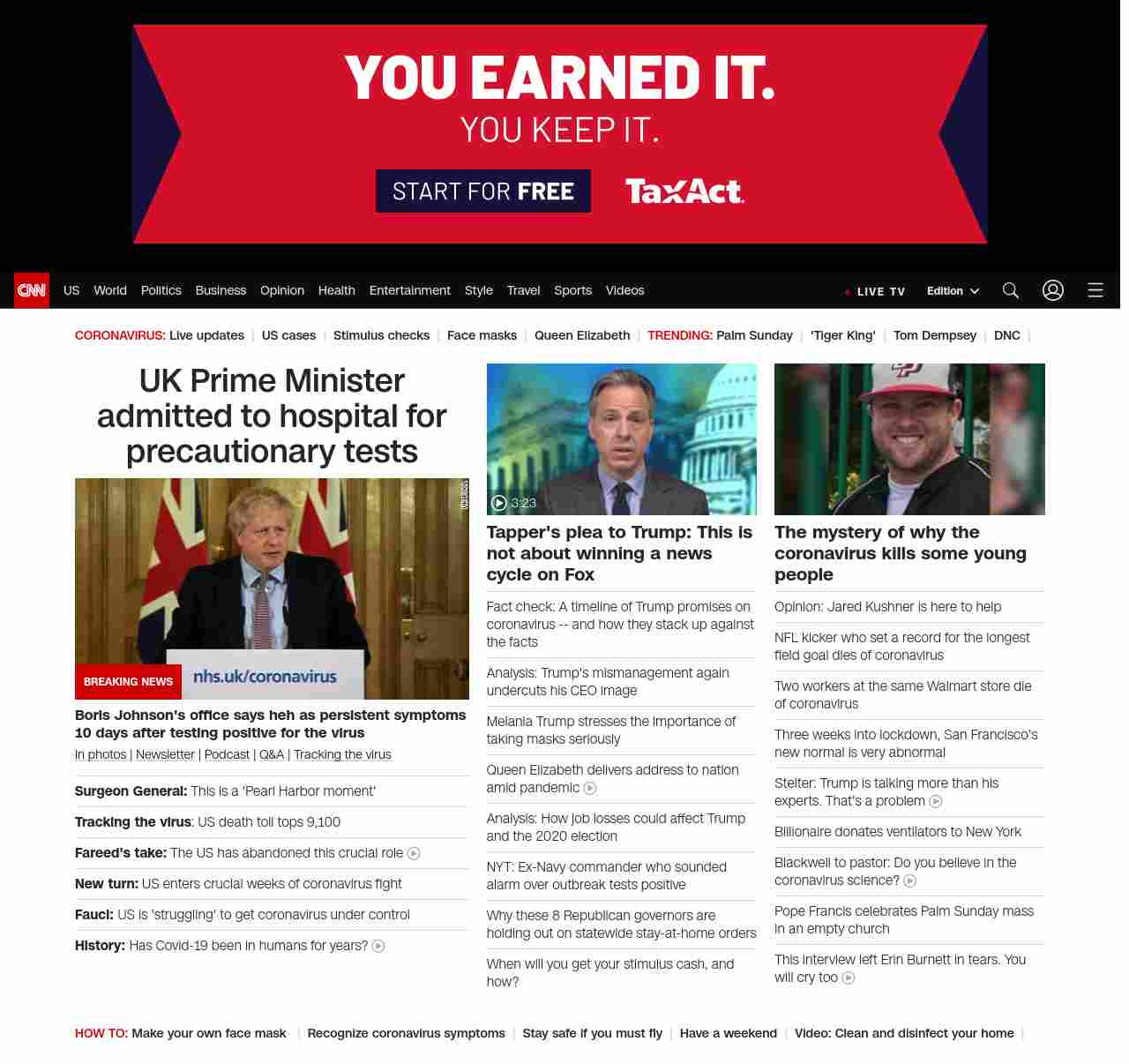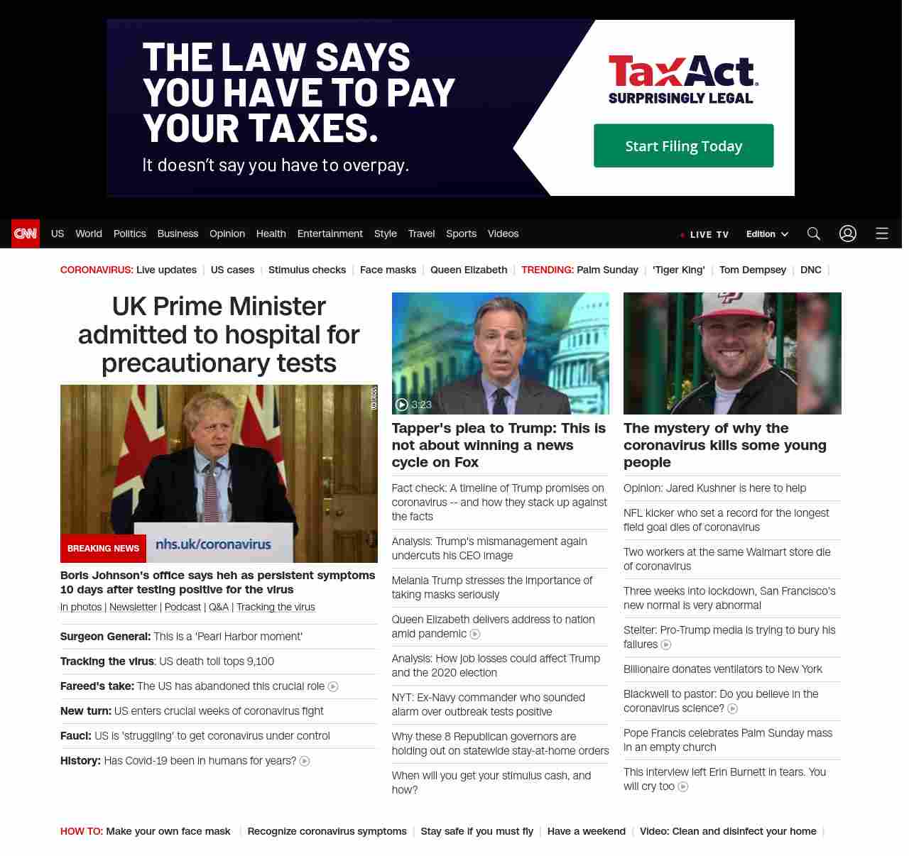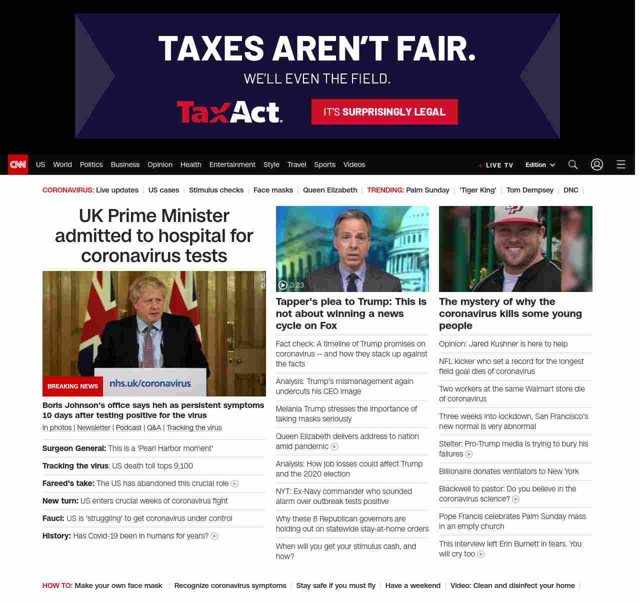 || screaming-banner-text banner-text-size–char-47″ data-analytics=”_list-hierarchical-xs_hyperlink_”> UK Prime Minister admitted to hospital for coronavirus tests ||” , title: “CNN – Breaking News, Latest News and Videos” , siblings: {“articleList”:[{“uri”:”/2020/04/05/politics/jerome-adams-coronavirus/index.html”,”headline”:”u003cstrong>Surgeon General:u003c/strong> This is a ‘Pearl Harbor moment'”,”thumbnail”:”//cdn.cnn.com/cnnnext/dam/assets/200323182037-us-surgeon-general-jerome-adams-small-11.jpg”,”duration”:””,”description”:”u003ca href=”https://www.cnn.com/2020/03/19/world/gallery/novel-coronavirus-outbreak/index.html” target=”_blank”>In photos u003c/a>| u003ca href=”https://www.cnn.com/specials/coronavirus-newsletter?utm_source=hp&source=hp” target=”_blank”>Newsletteru003c/a> | u003ca href=”https://www.cnn.com/audio/podcasts/corona-virus”>Podcastu003c/a> | u003ca href=”https://www.cnn.com/interactive/2020/health/coronavirus-questions-answers/” target=”_blank”>Q&Au003c/a> | u003ca href=”https://www.cnn.com/interactive/2020/health/coronavirus-us-maps-and-cases/” target=”_blank”>Tracking the virusu003c/a>”,”layout”:””