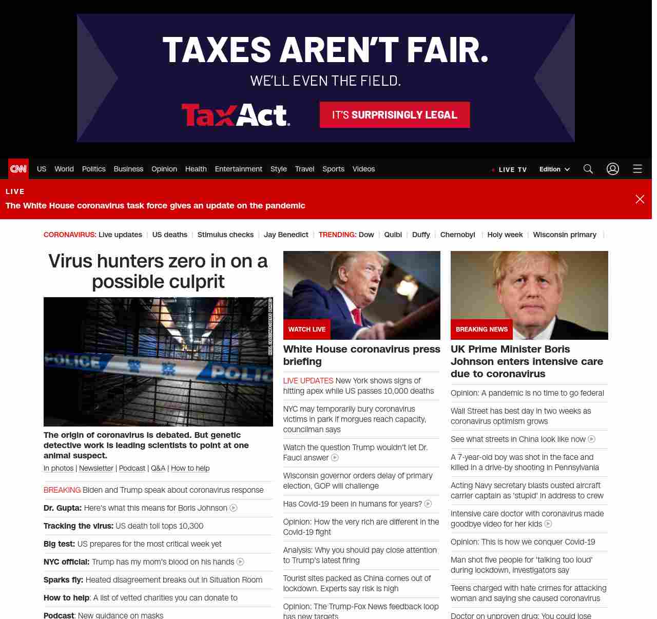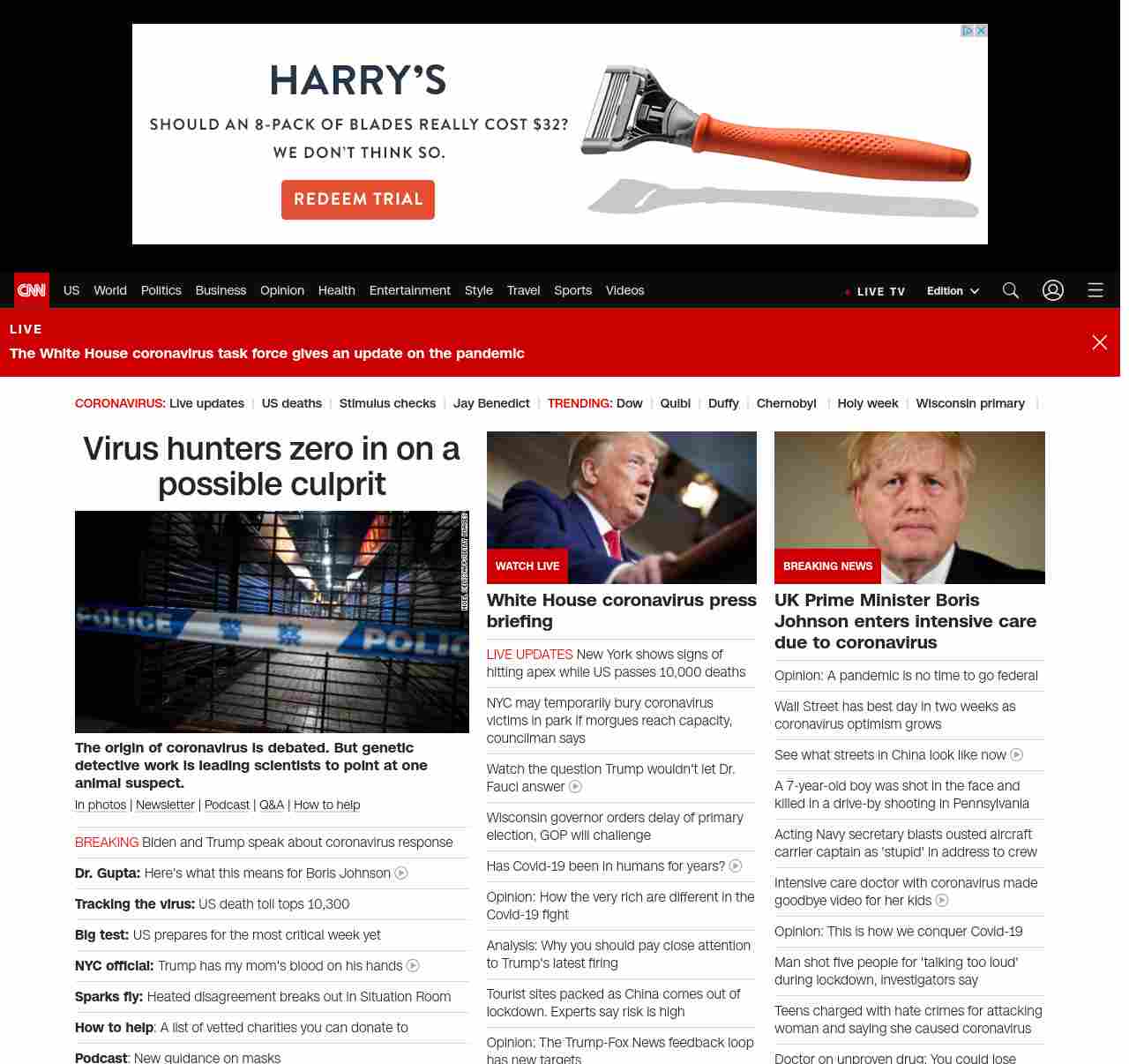 || screaming-banner-text banner-text-size–char-41″ data-analytics=”_list-hierarchical-xs_hyperlink_”> UK Prime Minister enters intensive care ||” , title: “CNN – Breaking News, Latest News and Videos” , siblings: {“articleList”:[{“uri”:”/2020/04/06/us/coronavirus-scientists-debate-origin-theories-invs/index.html”,”headline”:”u003cstrong>The origin of coronavirus is debated. But genetic detective work is leading scientists to point at one animal suspect. u003c/strong>”,”thumbnail”:”//cdn.cnn.com/cnnnext/dam/assets/200127165755-02-wuhan-seafood-market-jan-11-small-11.jpg”,”duration”:””,”description”:”u003ca href=”https://www.cnn.com/2020/03/19/world/gallery/novel-coronavirus-outbreak/index.html” target=”_blank”>In photos u003c/a>| u003ca href=”https://www.cnn.com/specials/coronavirus-newsletter?utm_source=hp&source=hp” target=”_blank”>Newsletteru003c/a> | u003ca href=”https://www.cnn.com/audio/podcasts/corona-virus”>Podcastu003c/a> | u003ca href=”https://www.cnn.com/interactive/2020/health/coronavirus-questions-answers/” target=”_blank”>Q&Au003c/a> | u003ca href=”https://www.cnn.com/interactive/2020/health/coronavirus-how-to-help/” target=”_blank”>How to helpu003c/a>”,”layout”:””