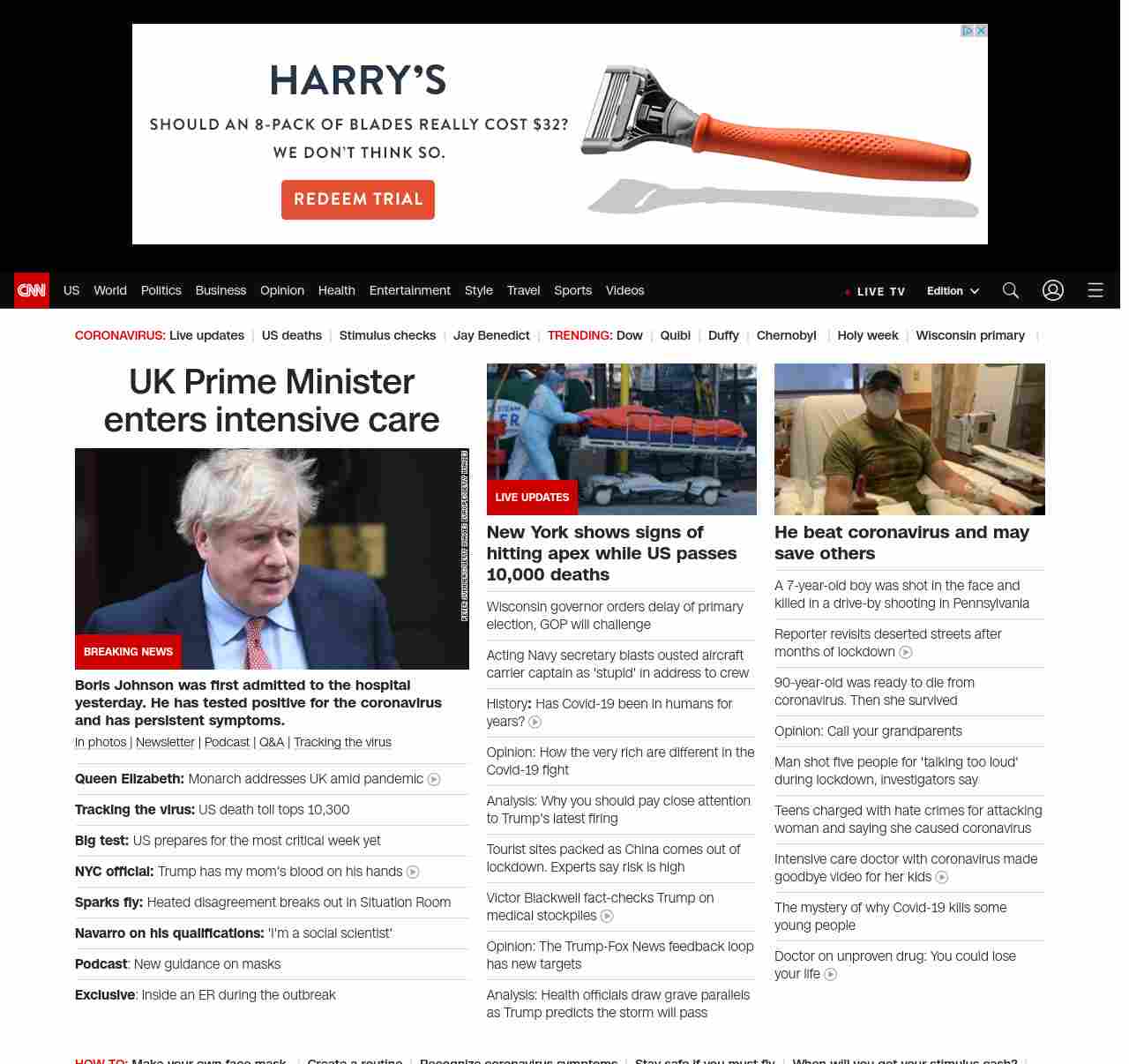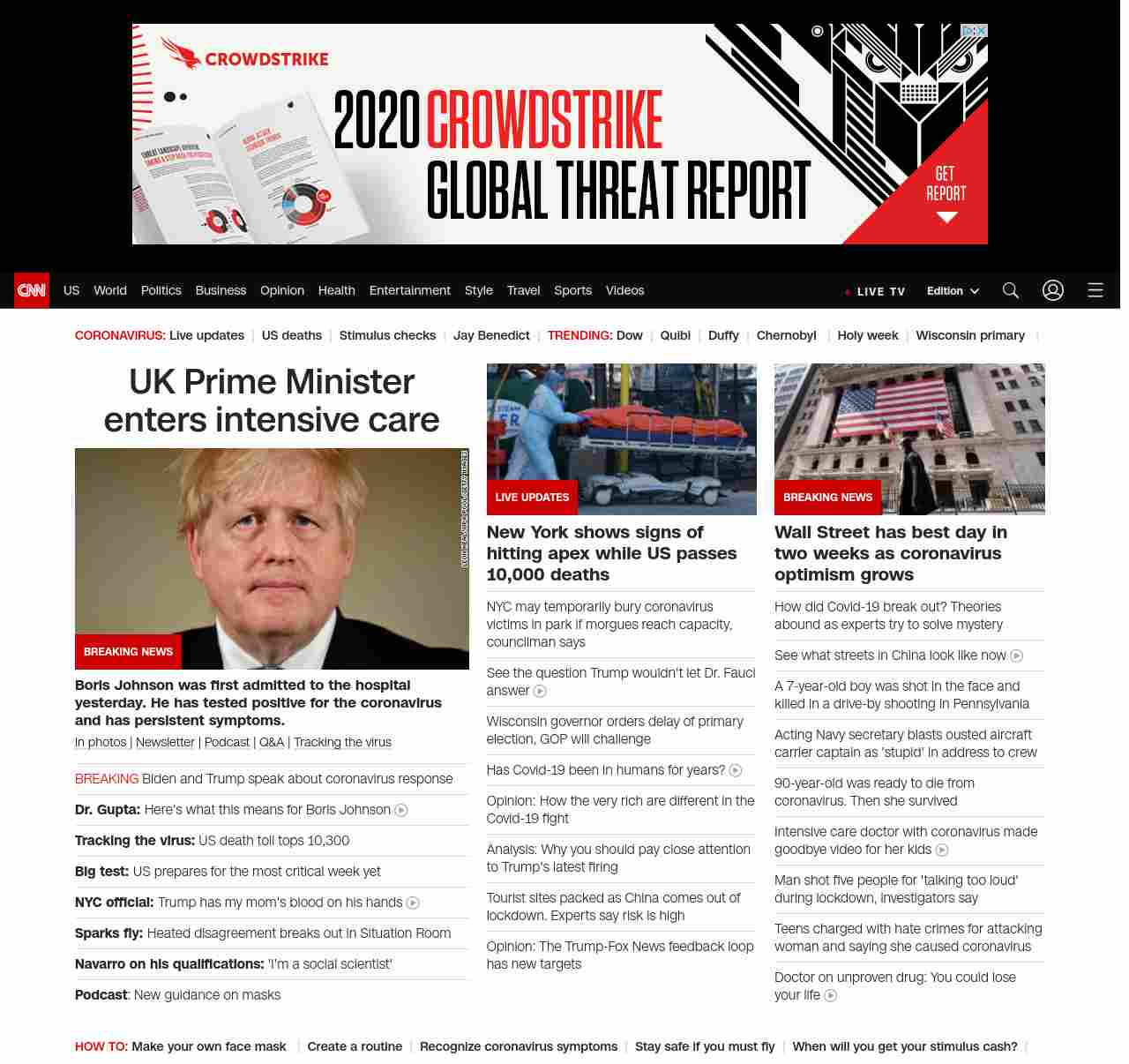 || screaming-banner-text banner-text-size–char-41″ data-analytics=”_list-hierarchical-xs_hyperlink_”> UK Prime Minister enters intensive care ||” , title: “CNN – Breaking News, Latest News and Videos” , siblings: {“articleList”:[{“uri”:”/2020/04/06/politics/biden-trump-call/index.html”,”headline”:”Biden and Trump speak about coronavirus response “,”thumbnail”:”//cdn.cnn.com/cnnnext/dam/assets/191205005729-joe-biden-donald-trump-split-file-small-11.jpg”,”duration”:””,”description”:”Former Vice President u003ca href=”https://www.cnn.com/election/2020/candidate/biden” target=”_blank”>Joe Bidenu003c/a> and President u003ca href=”https://www.cnn.com/election/2020/candidate/trump” target=”_blank”>Donald Trumpu003c/a> spoke by phone on Monday about the response to the coronavirus pandemic, a source familiar with the call and a White House official tell CNN.”,”layout”:””