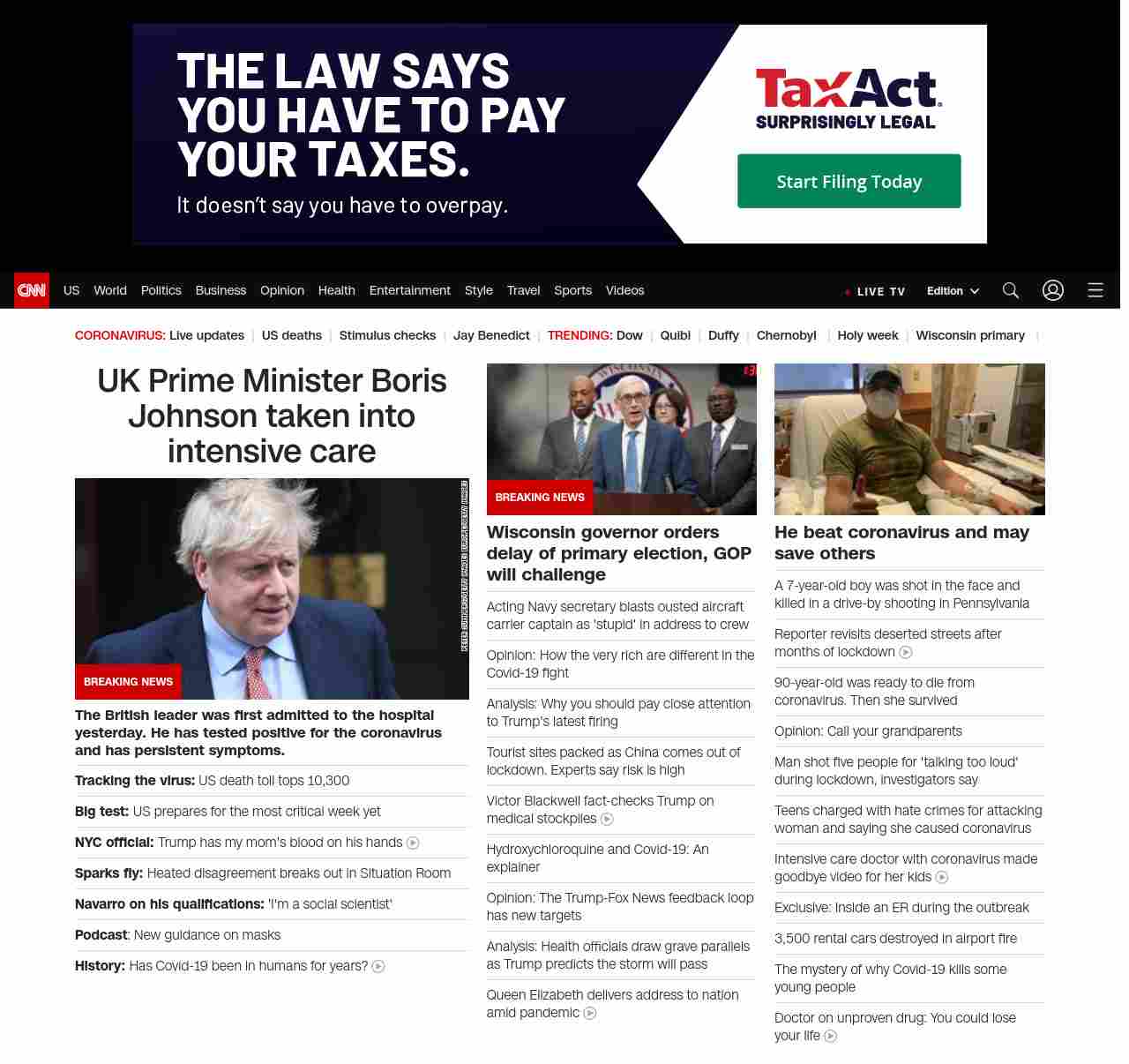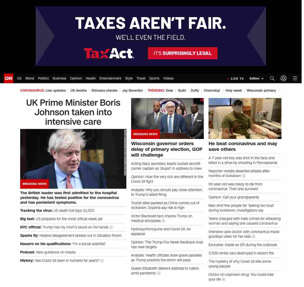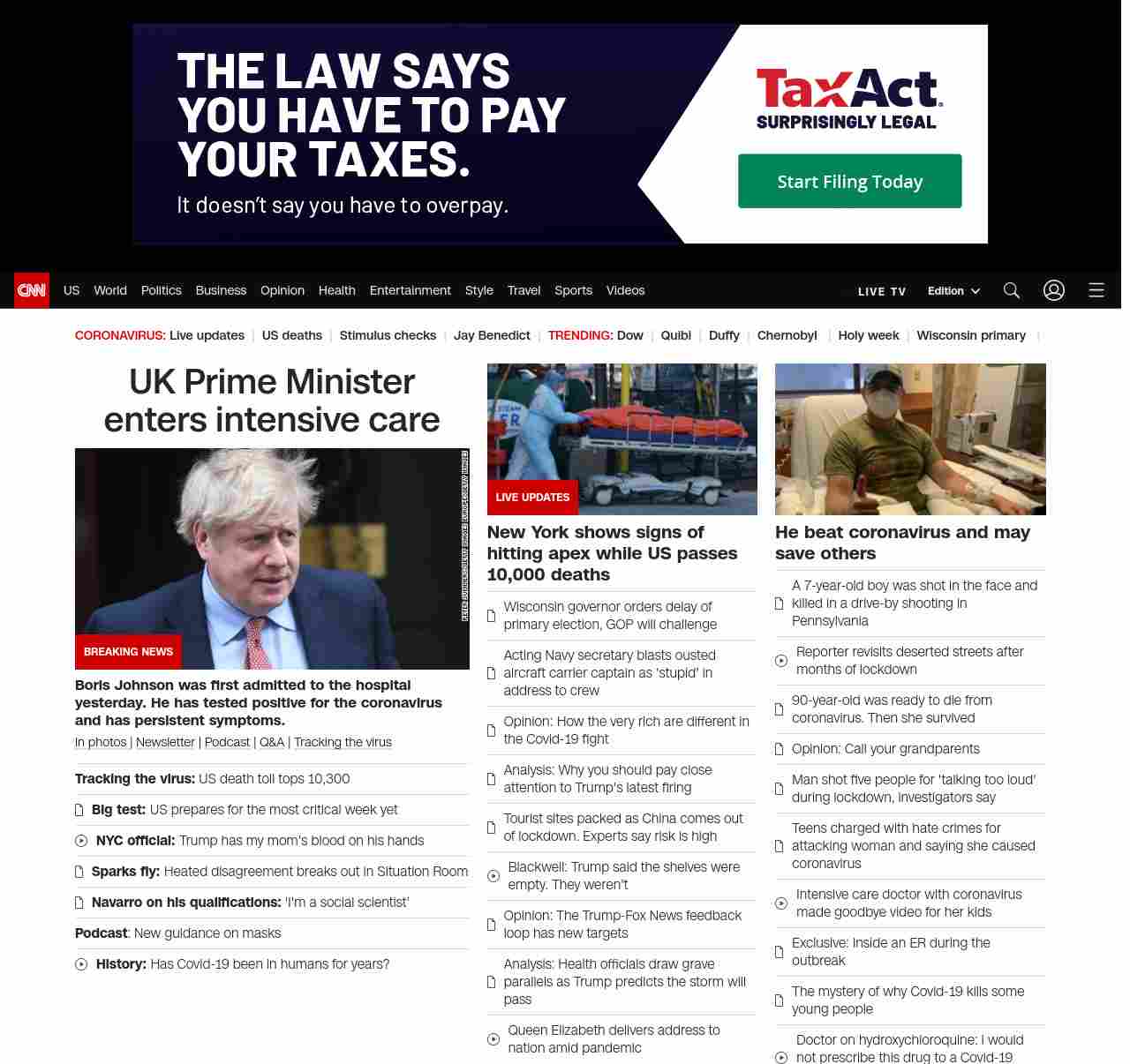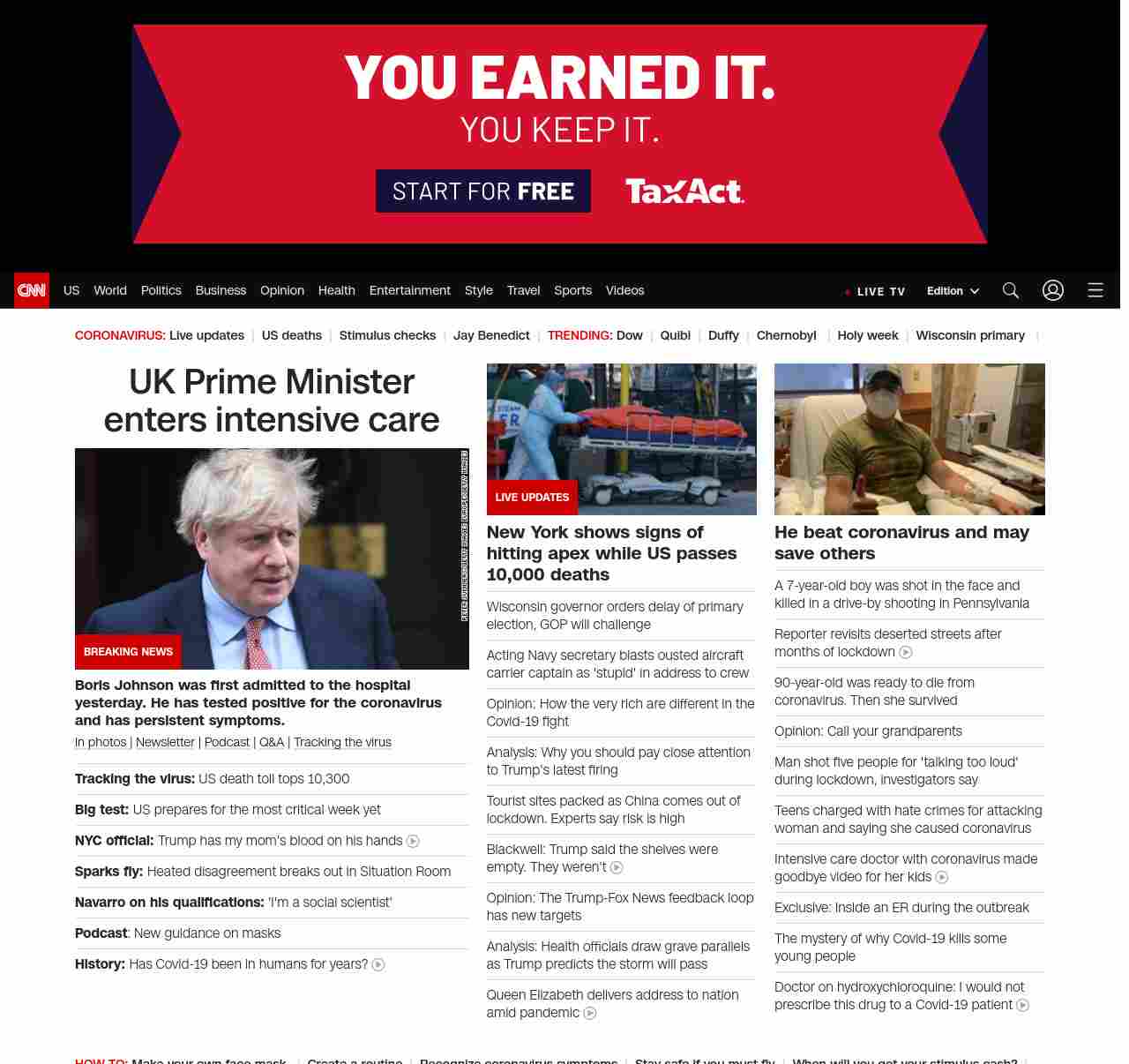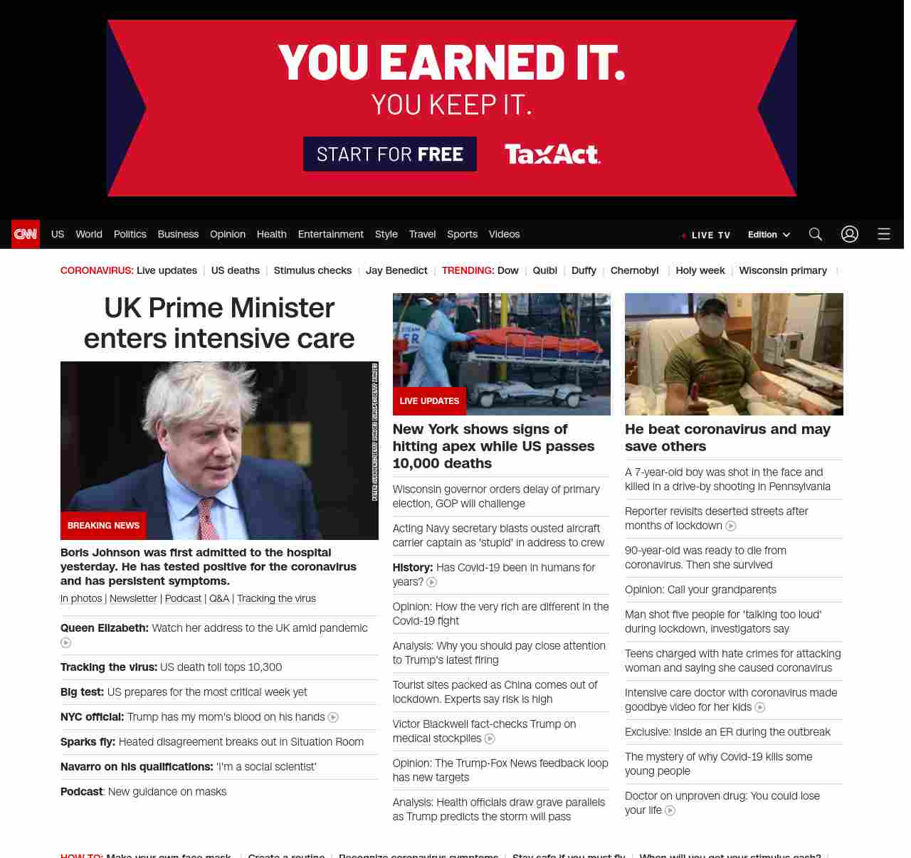 || screaming-banner-text banner-text-size–char-47″ data-analytics=”_list-hierarchical-xs_hyperlink_”> UK Prime Minister Boris Johnson taken into intensive care ||” , title: “CNN – Breaking News, Latest News and Videos” , siblings: {“articleList”:[{“uri”:”/2020/04/06/health/us-coronavirus-updates-monday/index.html”,”headline”:”u003cstrong>Big test: u003c/strong>US prepares for the most critical week yet”,”thumbnail”:”//cdn.cnn.com/cnnnext/dam/assets/200404195352-02-coronavirus-deaths-new-york-0404-small-11.jpg”,”duration”:””,”description”:”u003ca href=”https://www.cnn.com/2020/03/19/world/gallery/novel-coronavirus-outbreak/index.html” target=”_blank”>In photos u003c/a>| u003ca href=”https://www.cnn.com/specials/coronavirus-newsletter?utm_source=hp&source=hp” target=”_blank”>Newsletteru003c/a> | u003ca href=”https://www.cnn.com/audio/podcasts/corona-virus”>Podcastu003c/a> | u003ca href=”https://www.cnn.com/interactive/2020/health/coronavirus-questions-answers/” target=”_blank”>Q&Au003c/a> | u003ca href=”https://www.cnn.com/interactive/2020/health/coronavirus-us-maps-and-cases/” target=”_blank”>Tracking the virusu003c/a>”,”layout”:””
