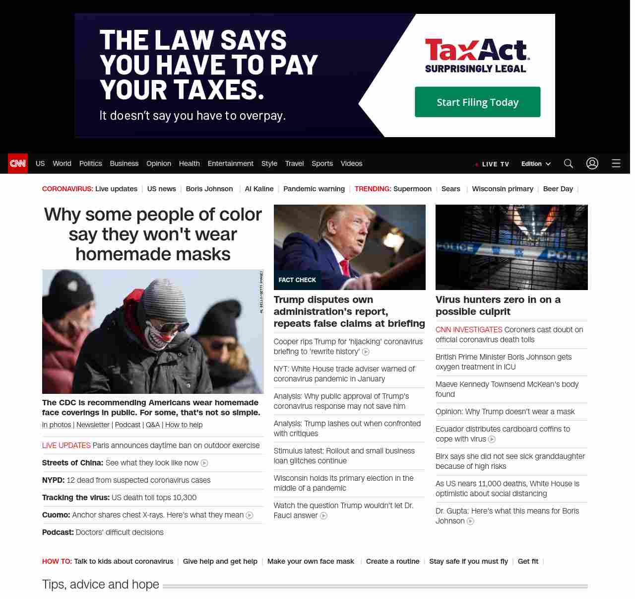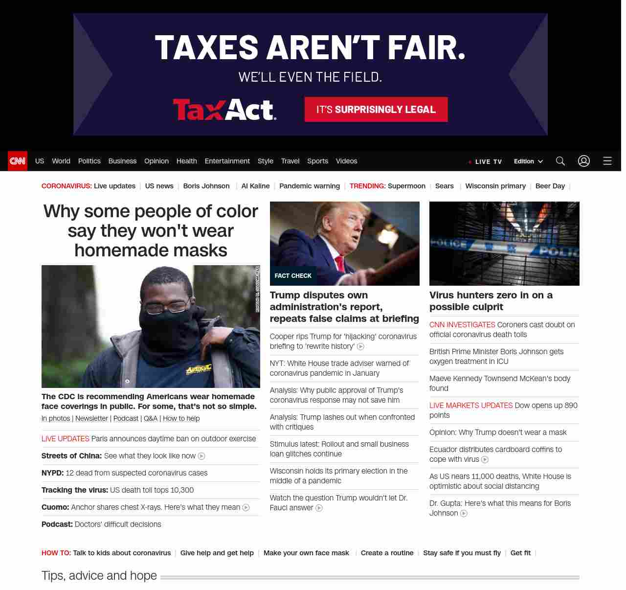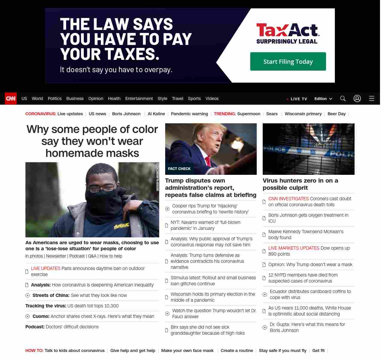 || screaming-banner-text banner-text-size–char-47″ data-analytics=”_list-hierarchical-xs_article_”> Why some people of color say they won’t wear homemade masks ||” , title: “CNN – Breaking News, Latest News and Videos” , siblings: {“articleList”:[{“uri”:”/2020/04/07/us/face-masks-ethnicity-coronavirus-cdc-trnd/index.html”,”headline”:”u003cstrong>The CDC is recommending Americans wear homemade face coverings in public. For some, that’s not so simple.u003c/strong>”,”thumbnail”:”//cdn.cnn.com/cnnnext/dam/assets/200403082112-02-coronavirus-scarf-0319-small-11.jpg”,”duration”:””,”description”:”u003ca href=”https://www.cnn.com/2020/03/19/world/gallery/novel-coronavirus-outbreak/index.html” target=”_blank”>In photos u003c/a>| u003ca href=”https://www.cnn.com/specials/coronavirus-newsletter?utm_source=hp&source=hp” target=”_blank”>Newsletteru003c/a> | u003ca href=”https://www.cnn.com/audio/podcasts/corona-virus”>Podcastu003c/a> | u003ca href=”https://www.cnn.com/interactive/2020/health/coronavirus-questions-answers/” target=”_blank”>Q&Au003c/a> | u003ca href=”https://www.cnn.com/interactive/2020/health/coronavirus-how-to-help/” target=”_blank”>How to helpu003c/a>”,”layout”:””