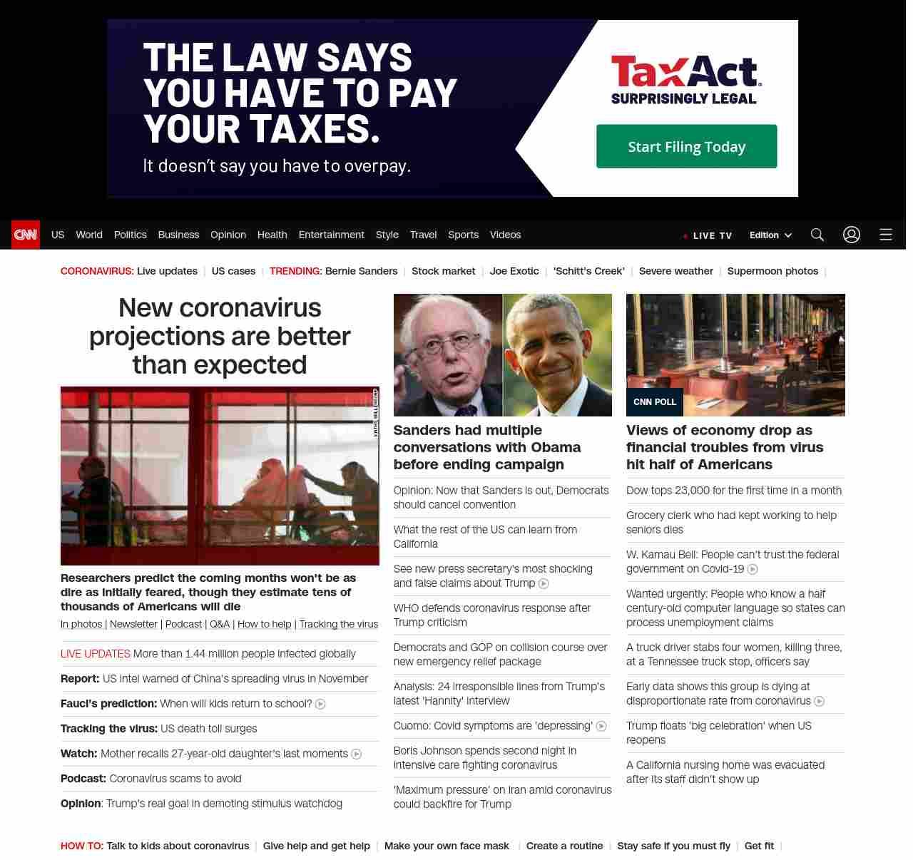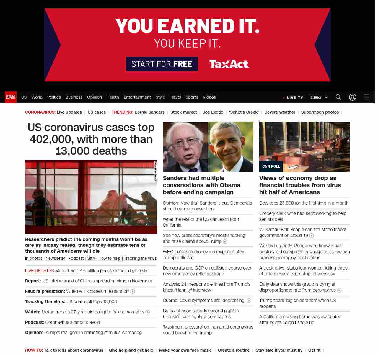 || screaming-banner-text banner-text-size–char-47″ data-analytics=”_list-hierarchical-xs_article_”> US coronavirus cases top 402,000, with more than 13,000 deaths ||” , title: “CNN – Breaking News, Latest News and Videos” , siblings: {“articleList”:[{“uri”:”/2020/04/08/health/us-coronavirus-wednesday/index.html”,”headline”:”u003cstrong>Researchers predict the coming months won’t be as dire as initially feared, though they estimate tens of thousands of Americans will dieu003c/strong>”,”thumbnail”:”//cdn.cnn.com/cnnnext/dam/assets/200408013302-us-coronavirus-wednesday-0407-small-11.jpg”,”duration”:””,”description”:”u003ca href=”https://www.cnn.com/2020/03/19/world/gallery/novel-coronavirus-outbreak/index.html” target=”_blank”>In photos u003c/a>| u003ca href=”https://www.cnn.com/specials/coronavirus-newsletter?utm_source=hp&source=hp” target=”_blank”>Newsletteru003c/a> | u003ca href=”https://www.cnn.com/audio/podcasts/corona-virus”>Podcastu003c/a> | u003ca href=”https://www.cnn.com/interactive/2020/health/coronavirus-questions-answers/” target=”_blank”>Q&Au003c/a> | u003ca href=”https://www.cnn.com/interactive/2020/health/coronavirus-how-to-help/” target=”_blank”>How to helpu003c/a> | u003ca href=”https://www.cnn.com/interactive/2020/health/coronavirus-us-maps-and-cases/” target=”_blank”>Tracking the virusu003c/a>”,”layout”:””