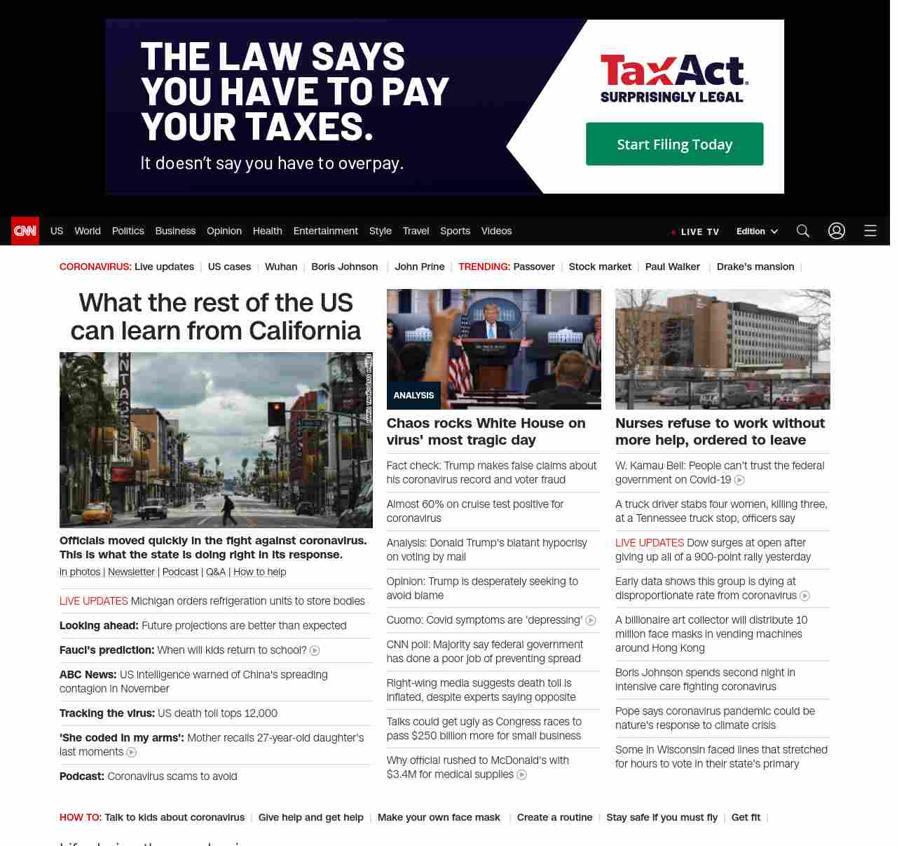 || screaming-banner-text banner-text-size–char-47″ data-analytics=”_list-hierarchical-xs_article_”> Chaos rocks White House on virus’ most tragic day ||” , title: “CNN – Breaking News, Latest News and Videos” , siblings: {“articleList”:[{“uri”:”/2020/04/08/us/california-coronavirus-explainer/index.html”,”headline”:”u003cstrong>Officials moved quickly in the fight against coronavirus. This is what the state is doing right in its response.u003c/strong>”,”thumbnail”:”//cdn.cnn.com/cnnnext/dam/assets/200402031651-shelter-in-place-california-0325-small-11.jpg”,”duration”:””,”description”:”u003ca href=”https://www.cnn.com/2020/03/19/world/gallery/novel-coronavirus-outbreak/index.html” target=”_blank”>In photos u003c/a>| u003ca href=”https://www.cnn.com/specials/coronavirus-newsletter?utm_source=hp&source=hp” target=”_blank”>Newsletteru003c/a> | u003ca href=”https://www.cnn.com/audio/podcasts/corona-virus”>Podcastu003c/a> | u003ca href=”https://www.cnn.com/interactive/2020/health/coronavirus-questions-answers/” target=”_blank”>Q&Au003c/a> | u003ca href=”https://www.cnn.com/interactive/2020/health/coronavirus-how-to-help/” target=”_blank”>How to helpu003c/a>”,”layout”:””