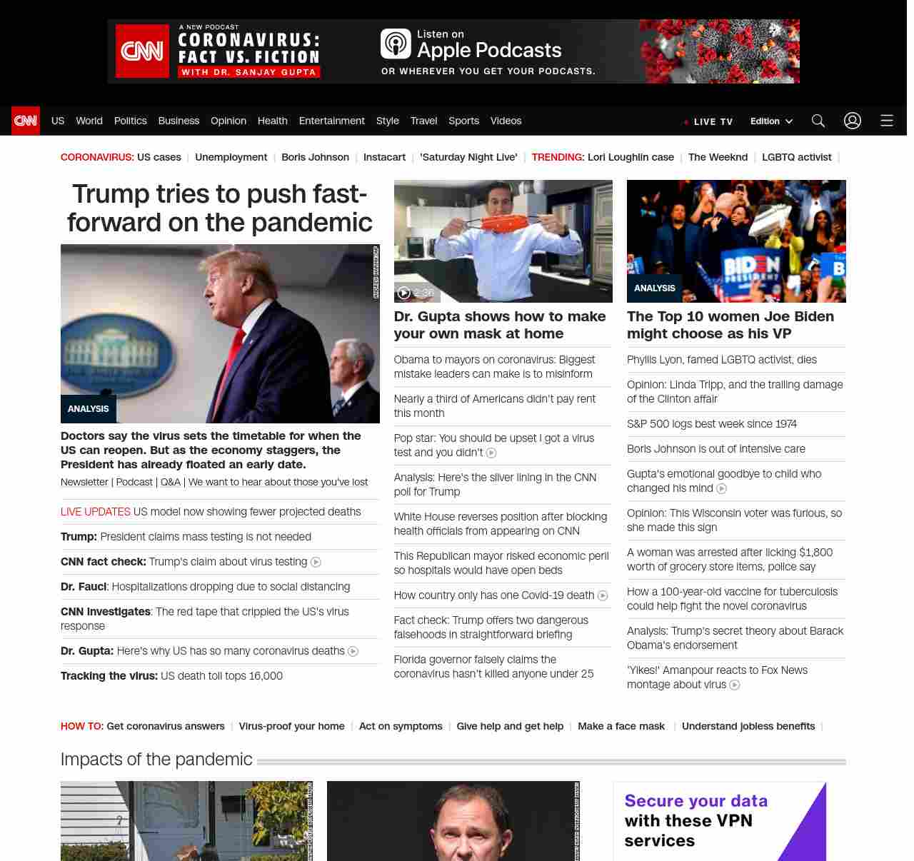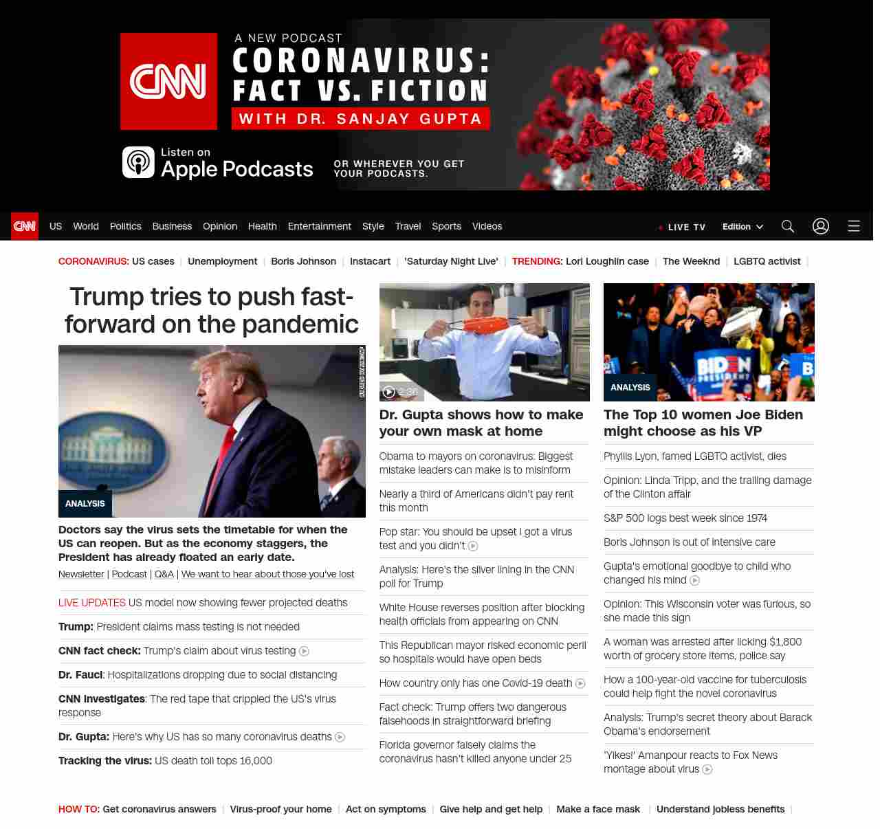 || screaming-banner-text banner-text-size–char-47″ data-analytics=”_list-hierarchical-xs_article_”> Trump tries to push fast-forward on the pandemic ||” , title: “CNN – Breaking News, Latest News and Videos” , siblings: {“articleList”:[{“uri”:”/2020/04/09/politics/what-matters-april-9/index.html”,”headline”:”u003cstrong>Doctors say the virus sets the timetable for when the US can reopen. But as the economy staggers, the President has already floated an early date.u003c/strong>”,”thumbnail”:”//cdn.cnn.com/cnnnext/dam/assets/200409183935-02-coronavirus-briefing-0409-small-11.jpg”,”duration”:””,”description”:”u003ca href=”https://www.cnn.com/specials/coronavirus-newsletter?utm_source=hp&source=hp” target=”_blank”>Newsletteru003c/a> | u003ca href=”https://www.cnn.com/audio/podcasts/corona-virus”>Podcastu003c/a> | u003ca href=”https://www.cnn.com/interactive/2020/health/coronavirus-questions-answers/” target=”_blank”>Q&Au003c/a> | u003ca href=”https://www.cnn.com/2020/04/08/health/share-coronavirus-covid19-victims-memories/index.html” target=”_blank”>We want to hear about those you’ve lostu003c/a>”,”layout”:””