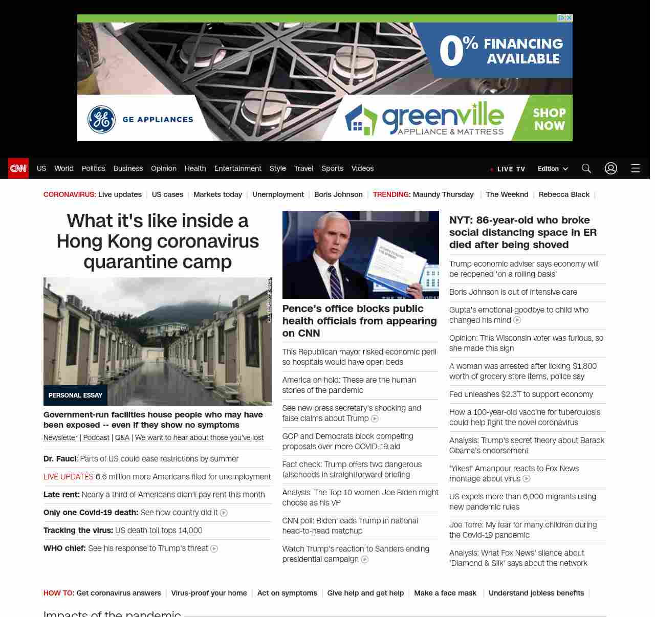 || screaming-banner-text banner-text-size–char-47″ data-analytics=”_list-hierarchical-xs_article_”> What it’s like inside a Hong Kong coronavirus quarantine camp ||” , title: “CNN – Breaking News, Latest News and Videos” , siblings: {“articleList”:[{“uri”:”/2020/04/09/homepage2/hong-kong-coronavirus-quarantine-diary-intl-hnk/index.html”,”headline”:”u003cstrong>Government-run facilities house people who may have been exposed — even if they show no symptomsu003c/strong>”,”thumbnail”:”//cdn.cnn.com/cnnnext/dam/assets/200408172822-hk-quarantine-camp-small-11.jpg”,”duration”:””,”description”:”u003ca href=”https://www.cnn.com/specials/coronavirus-newsletter?utm_source=hp&source=hp” target=”_blank”>Newsletteru003c/a> | u003ca href=”https://www.cnn.com/audio/podcasts/corona-virus”>Podcastu003c/a> | u003ca href=”https://www.cnn.com/interactive/2020/health/coronavirus-questions-answers/” target=”_blank”>Q&Au003c/a> | u003ca href=”https://www.cnn.com/2020/04/08/health/share-coronavirus-covid19-victims-memories/index.html” target=”_blank”>We want to hear about those you’ve lostu003c/a>”,”layout”:””