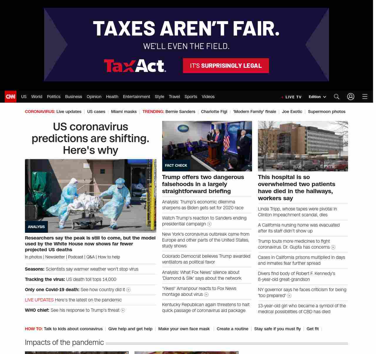 || screaming-banner-text banner-text-size–char-47″ data-analytics=”_list-hierarchical-xs_article_”> US coronavirus predictions are shifting. Here’s why ||” , title: “CNN – Breaking News, Latest News and Videos” , siblings: {“articleList”:[{“uri”:”/2020/04/08/politics/what-matters-april-8/index.html”,”headline”:”u003cstrong>Researchers say the peak is still to come, but the model used by the White House now shows far fewer projected US deathsu003c/strong>”,”thumbnail”:”//cdn.cnn.com/cnnnext/dam/assets/200408162250-04-hf-coronavirus-new-york-small-11.jpg”,”duration”:””,”description”:”u003ca href=”https://www.cnn.com/2020/03/19/world/gallery/novel-coronavirus-outbreak/index.html” target=”_blank”>In photos u003c/a>| u003ca href=”https://www.cnn.com/specials/coronavirus-newsletter?utm_source=hp&source=hp” target=”_blank”>Newsletteru003c/a> | u003ca href=”https://www.cnn.com/audio/podcasts/corona-virus”>Podcastu003c/a> | u003ca href=”https://www.cnn.com/interactive/2020/health/coronavirus-questions-answers/” target=”_blank”>Q&Au003c/a> | u003ca href=”https://www.cnn.com/interactive/2020/health/coronavirus-how-to-help/” target=”_blank”>How to helpu003c/a>”,”layout”:””