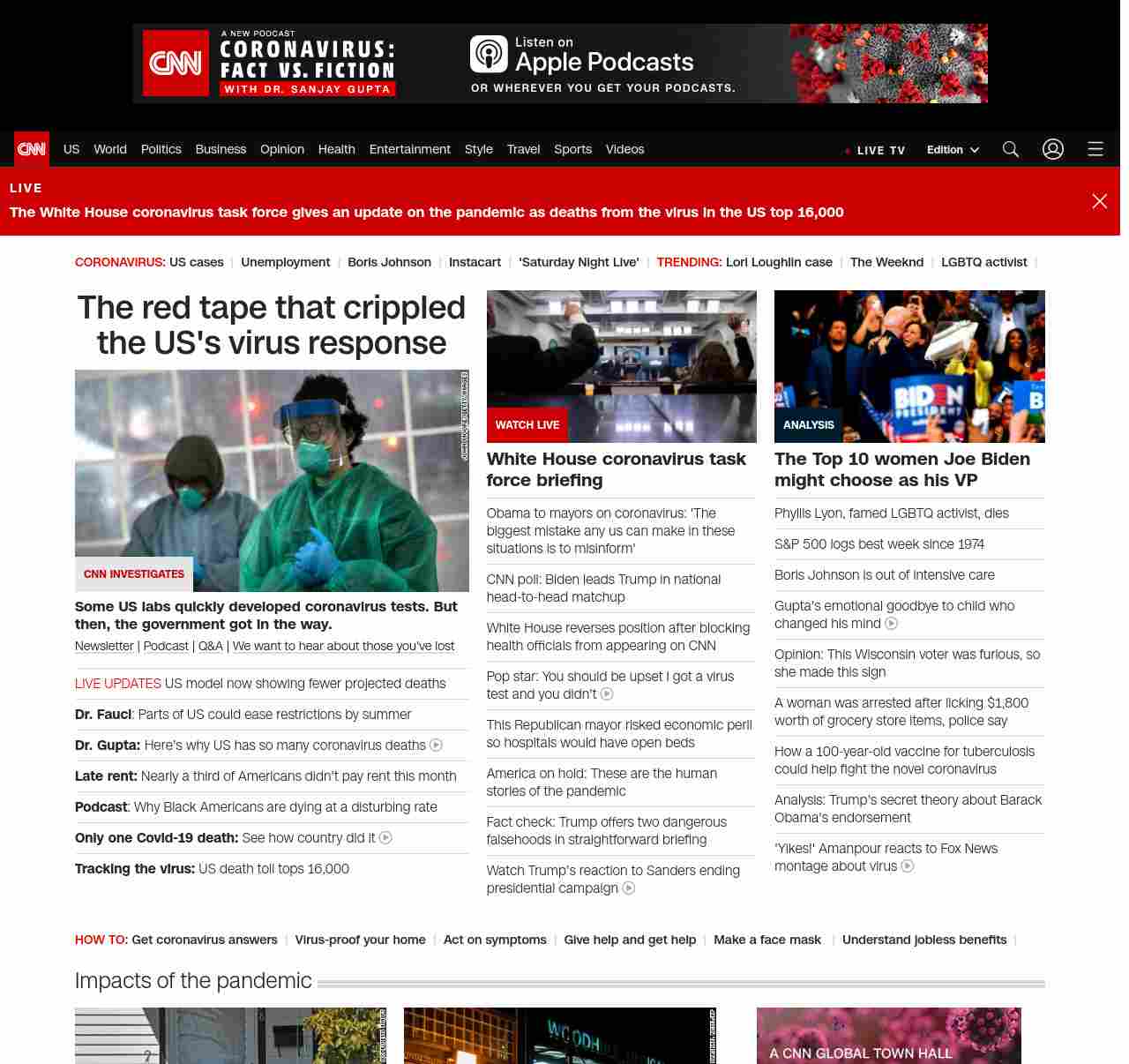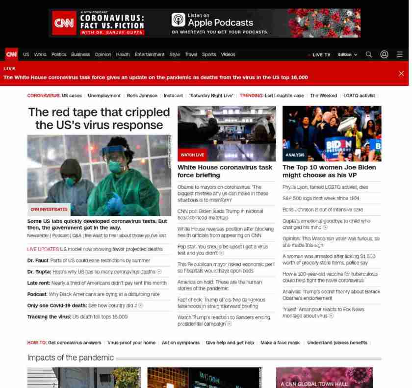 || screaming-banner-text banner-text-size–char-47″ data-analytics=”_list-hierarchical-xs_article_”> The red tape that crippled the US’s virus response ||” , title: “CNN – Breaking News, Latest News and Videos” , siblings: {“articleList”:[{“uri”:”/2020/04/09/politics/coronavirus-testing-cdc-fda-red-tape-invs/index.html”,”headline”:”u003cstrong>Some US labs quickly developed coronavirus tests. But then, the government got in the way.u003c/strong>”,”thumbnail”:”//cdn.cnn.com/cnnnext/dam/assets/200403143615-doctor-drive-thru-testing-coronavirus-face-shield-0328-small-11.jpg”,”duration”:””,”description”:”u003ca href=”https://www.cnn.com/specials/coronavirus-newsletter?utm_source=hp&source=hp” target=”_blank”>Newsletteru003c/a> | u003ca href=”https://www.cnn.com/audio/podcasts/corona-virus”>Podcastu003c/a> | u003ca href=”https://www.cnn.com/interactive/2020/health/coronavirus-questions-answers/” target=”_blank”>Q&Au003c/a> | u003ca href=”https://www.cnn.com/2020/04/08/health/share-coronavirus-covid19-victims-memories/index.html” target=”_blank”>We want to hear about those you’ve lostu003c/a>”,”layout”:””